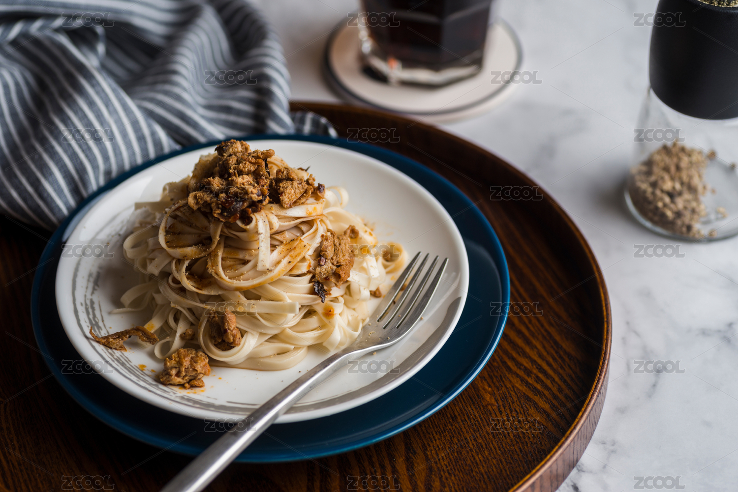 圓形松木托盤里的醬拌面和飲品