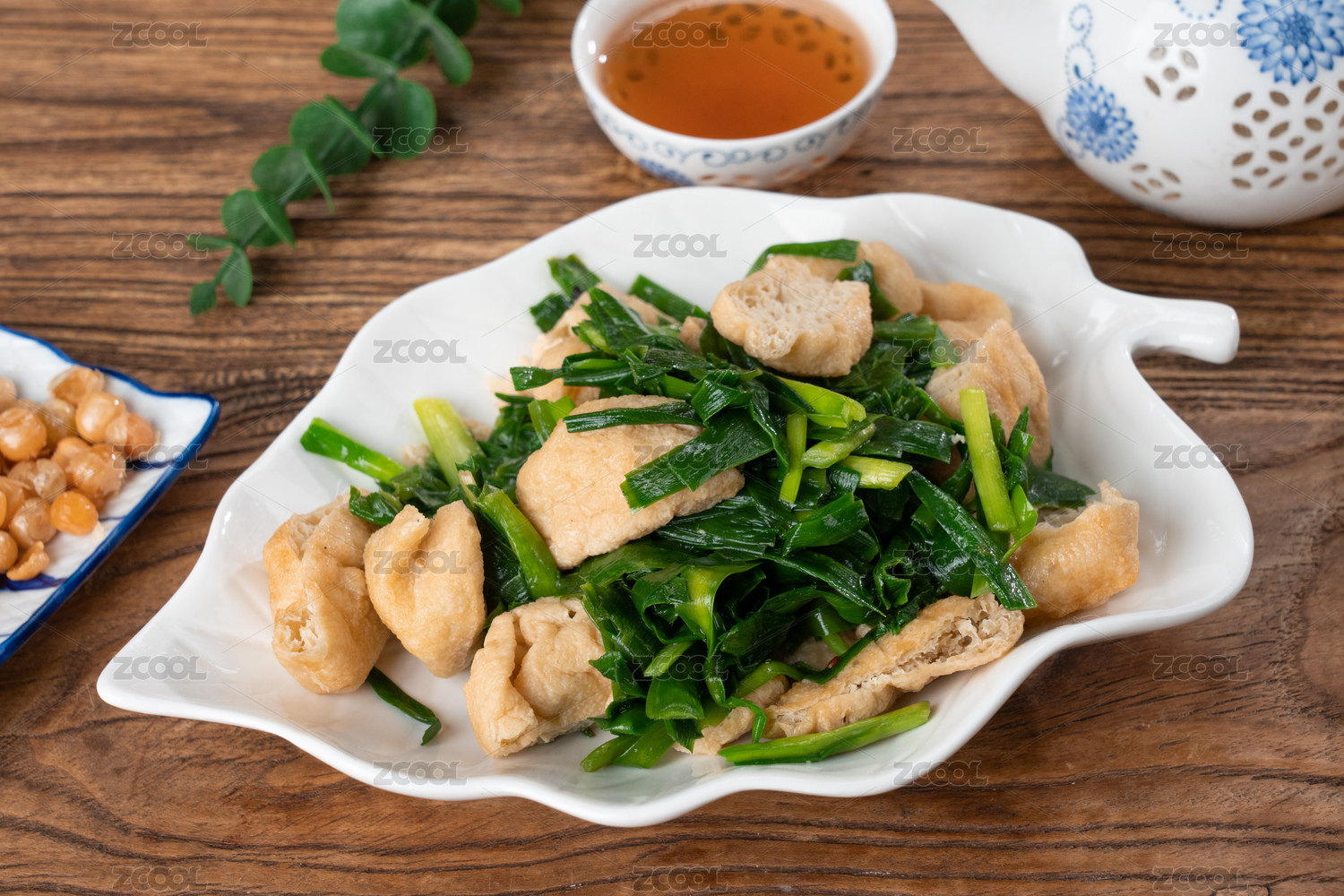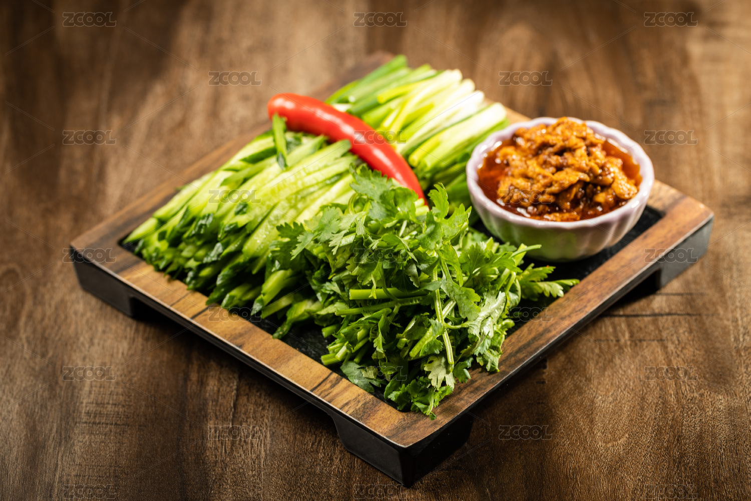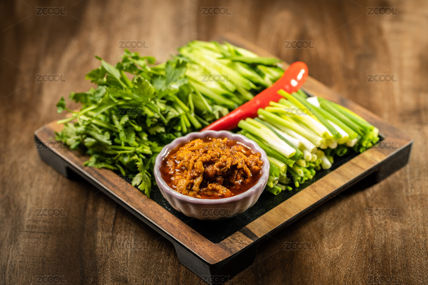 棕色木紋桌面上放著一盤雞蛋醬蘸小蔥