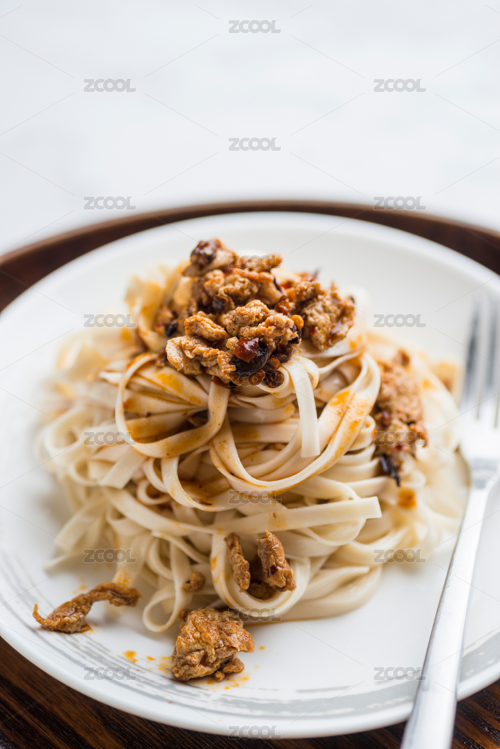 一碗雞蛋醬炸醬面放在木制底板上