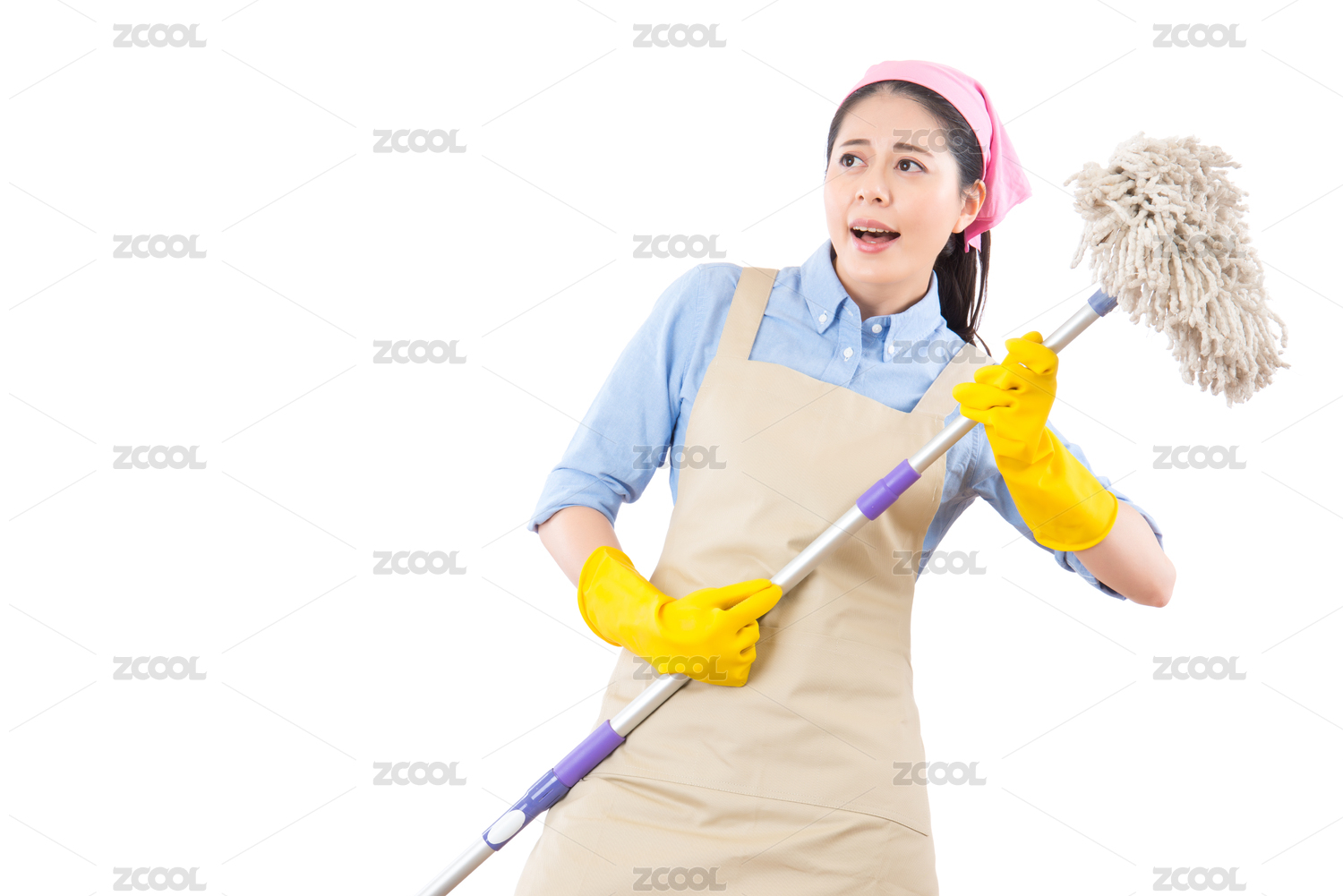 混血清潔女人幸福激動春季大掃除時。滑稽的充滿活力的美麗女孩清洗掃帚打在白色背景孤立空氣吉他。家務勞動和家庭觀念。