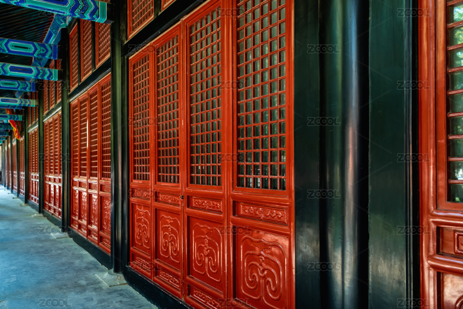 中國(guó)北京孔廟國(guó)子監(jiān)正義堂的木格門窗