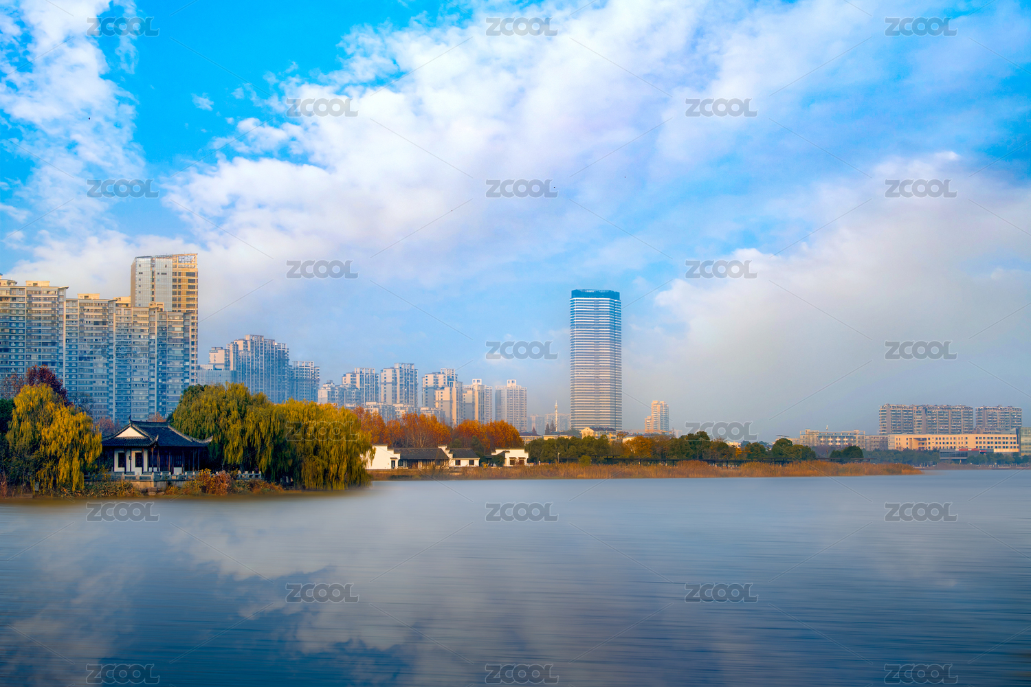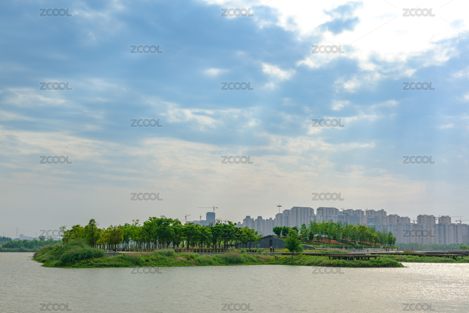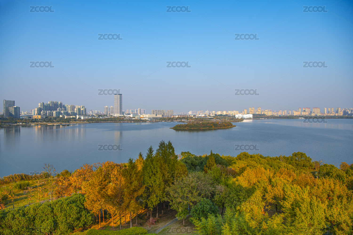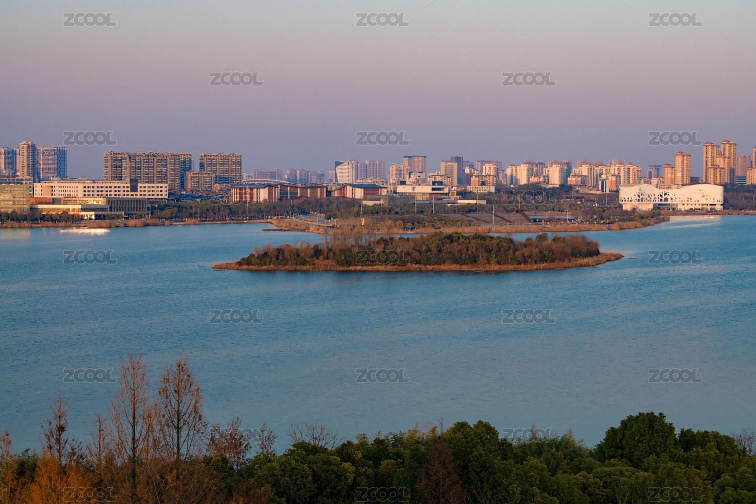 中國(guó)安徽宣城宛陵湖公園湖心小島和岸邊的樓房