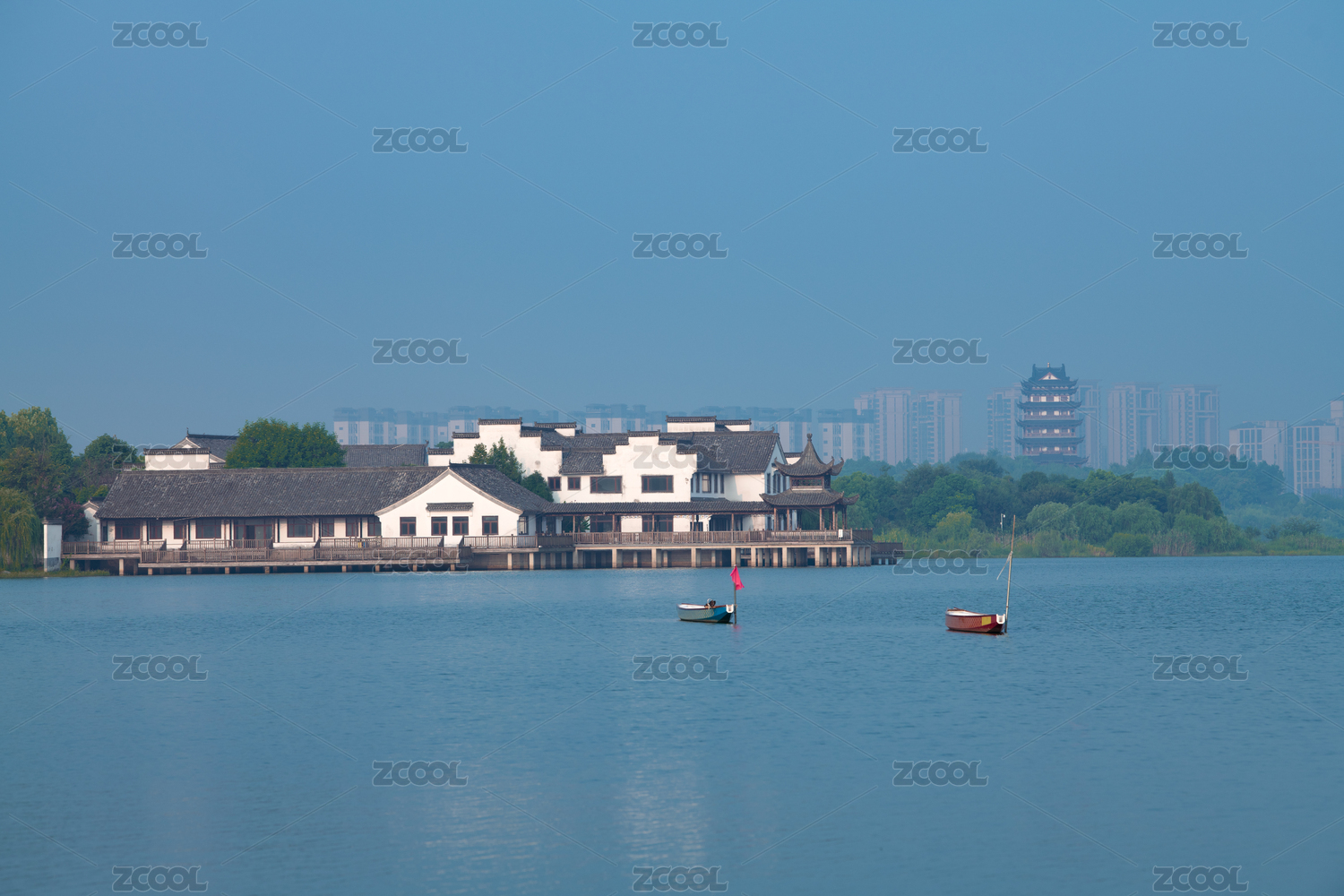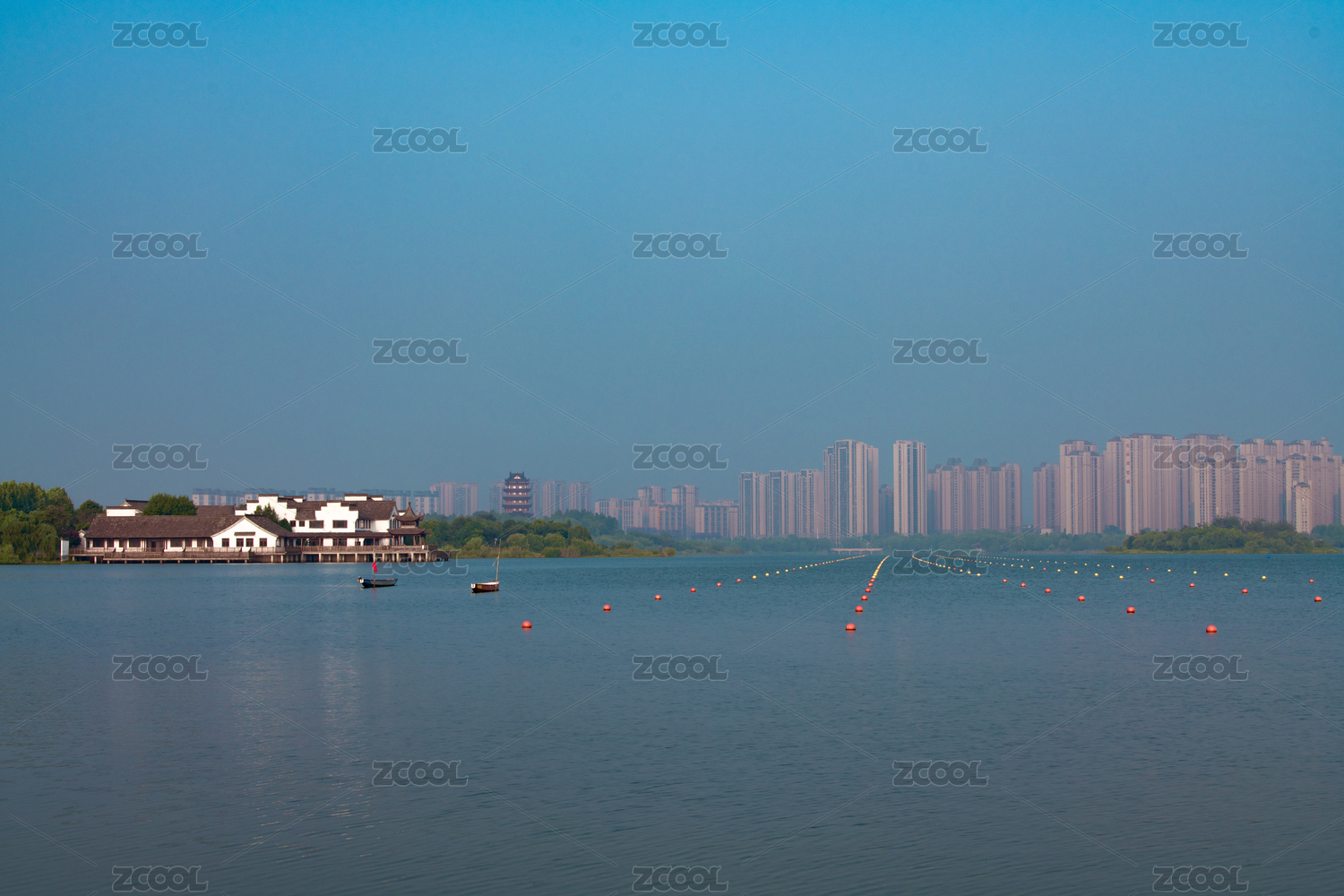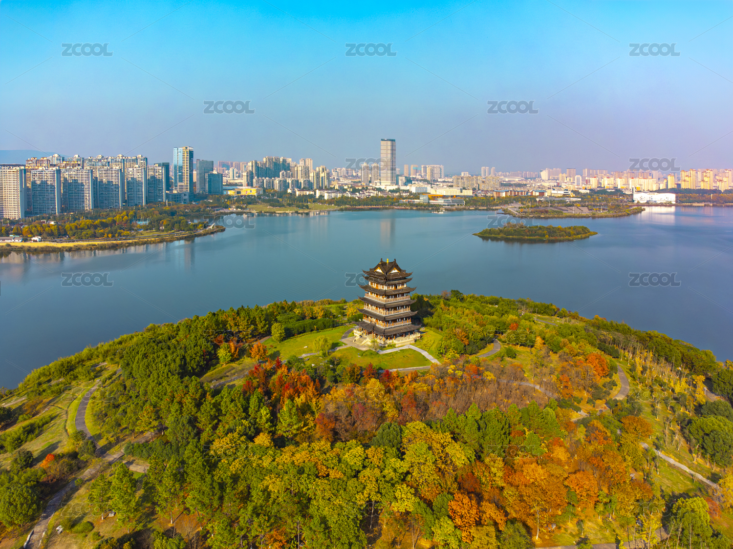 中國(guó)安徽宣城宛陵湖公園湖心小島和岸邊的樓房