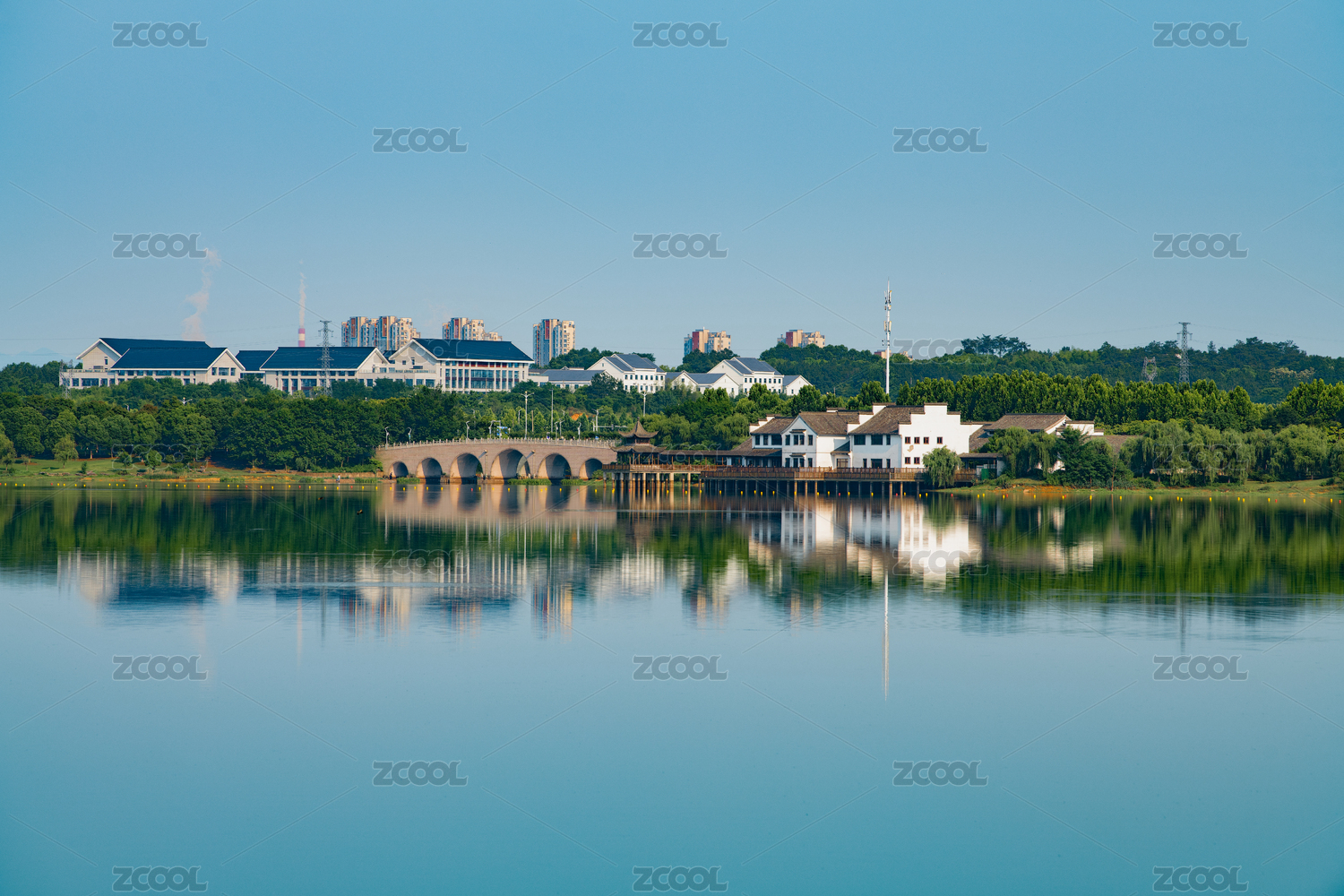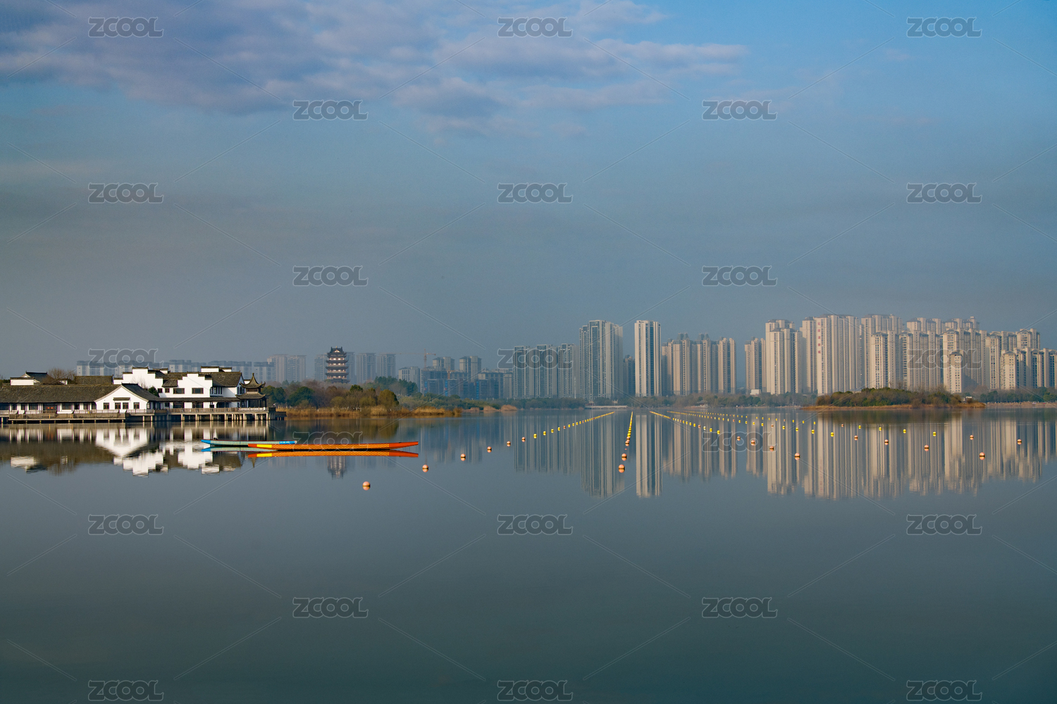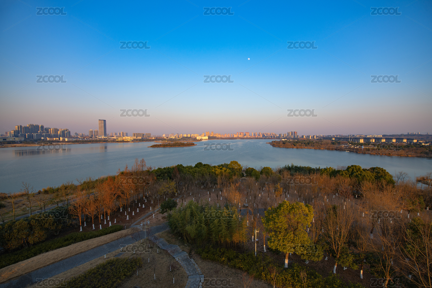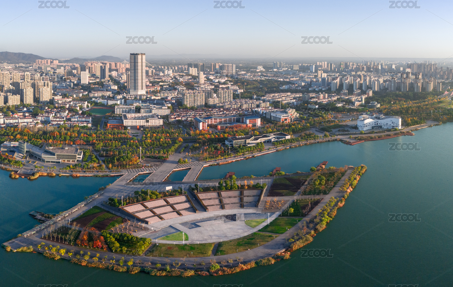 中國(guó)安徽宣城宛陵湖公園湖心小島和岸邊的樓房