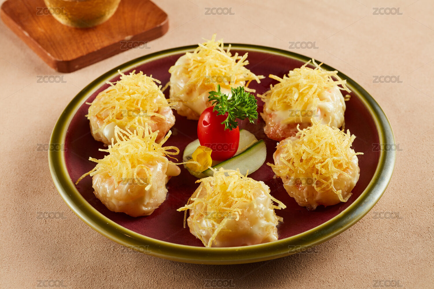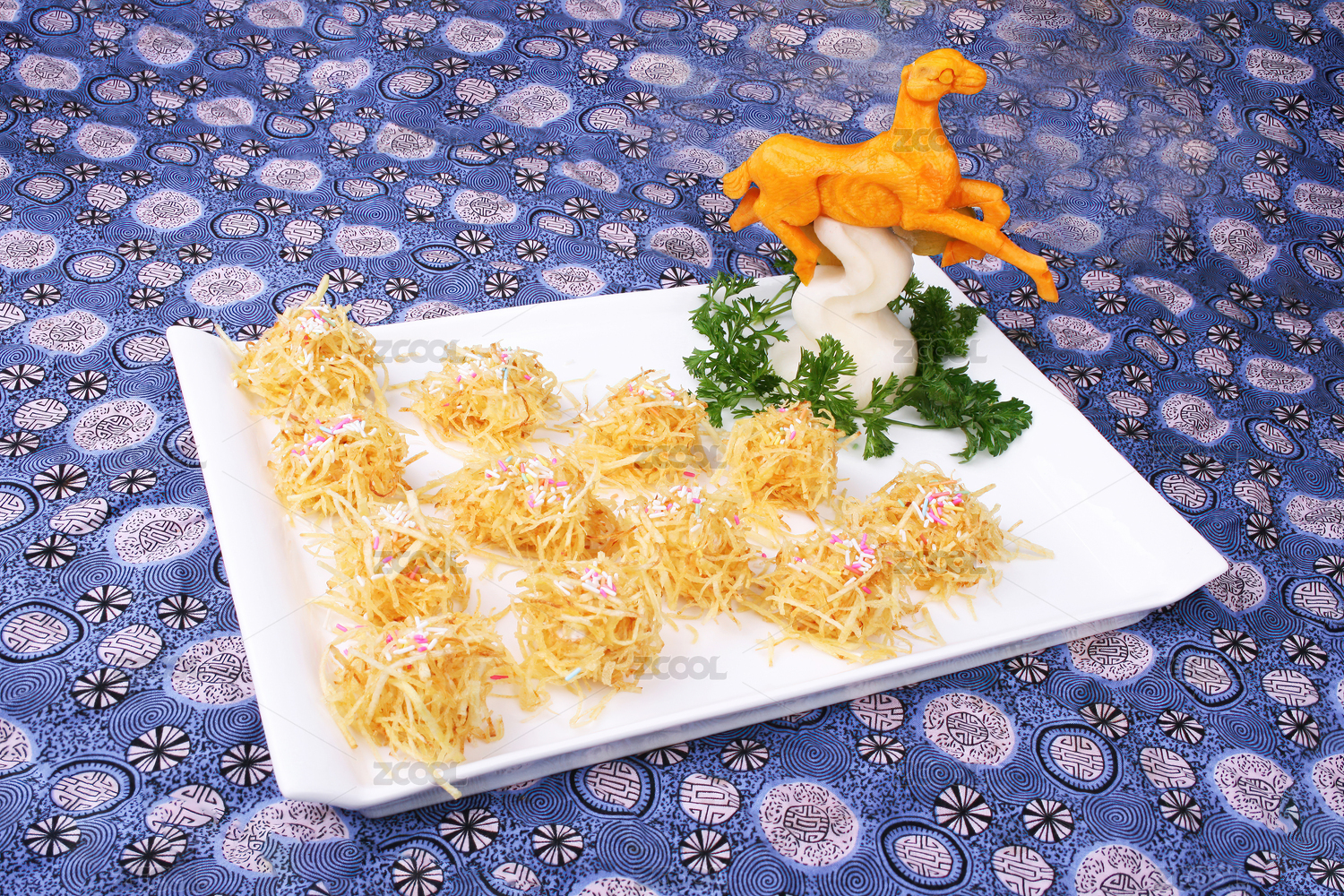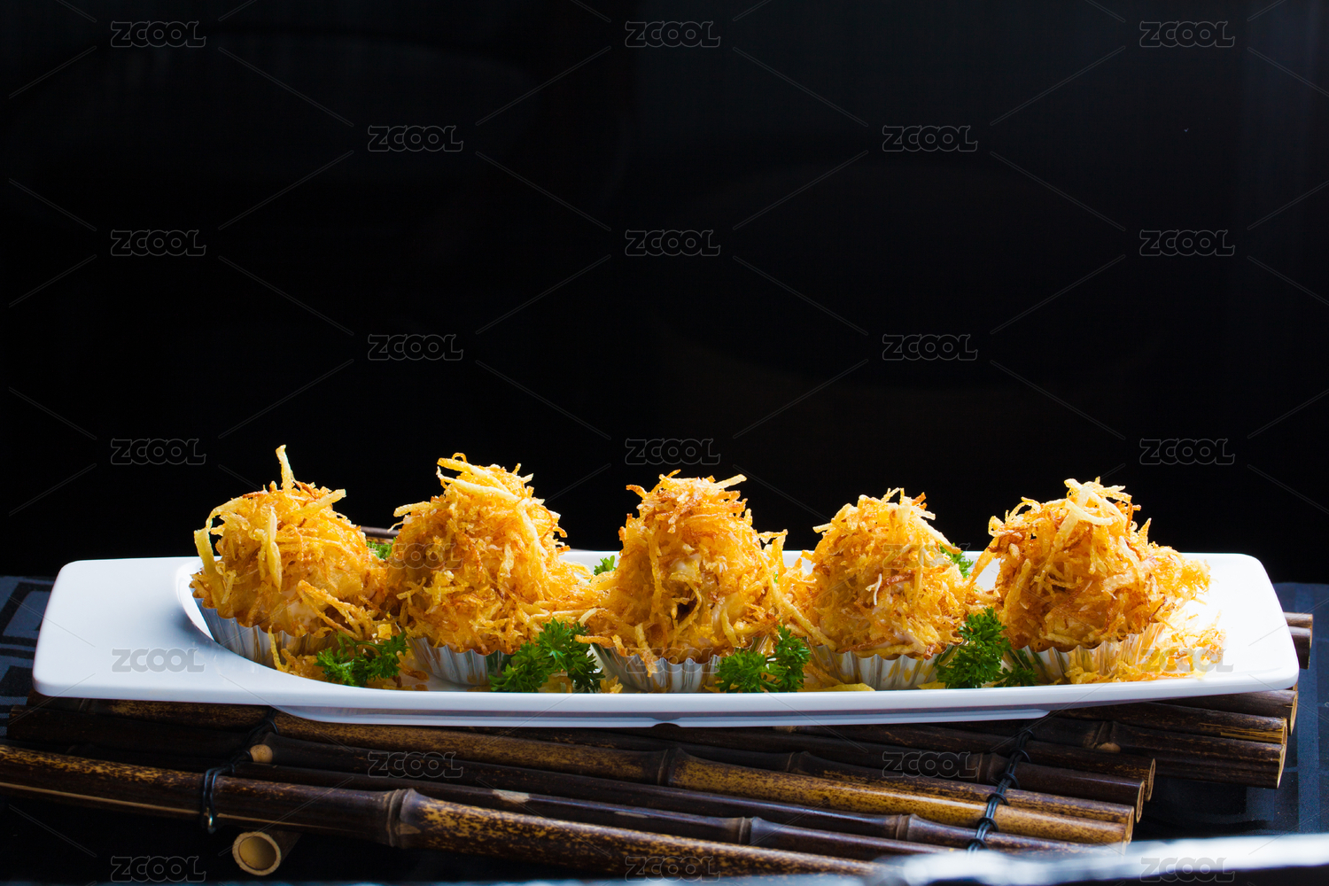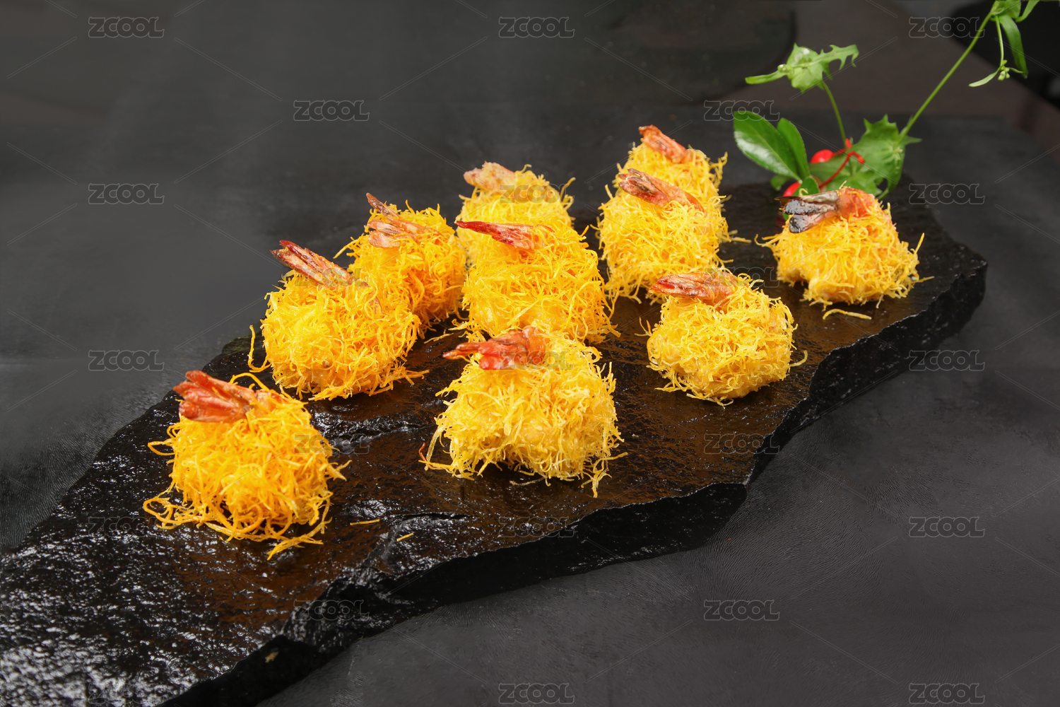 白盤里的避風(fēng)塘金絲榴蓮酥金絲蝦