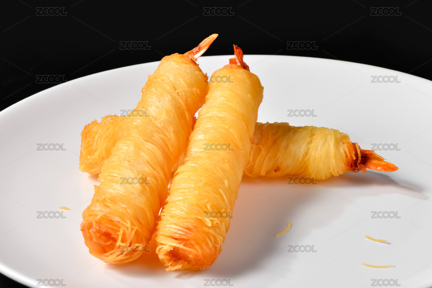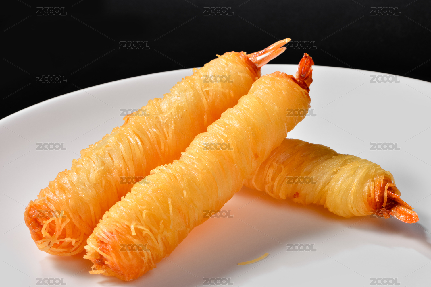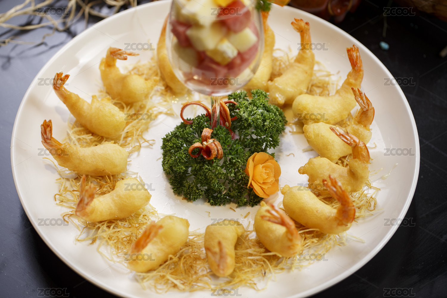 圓形白瓷盤裝的金絲水果大蝦(天婦羅炸蝦)