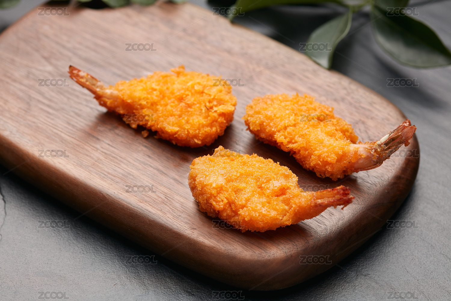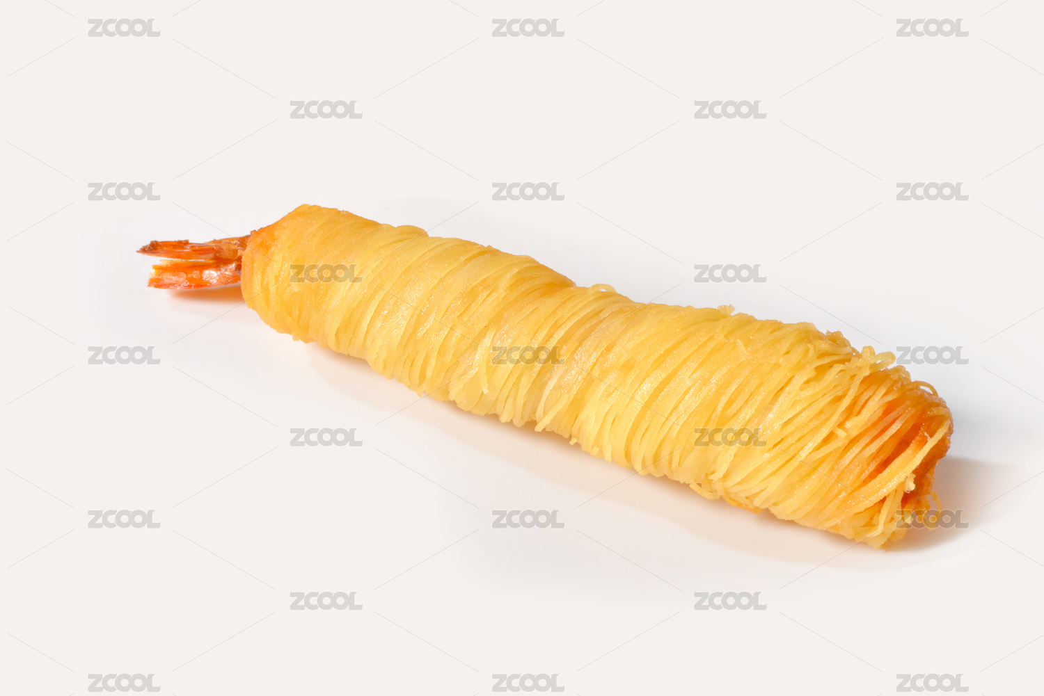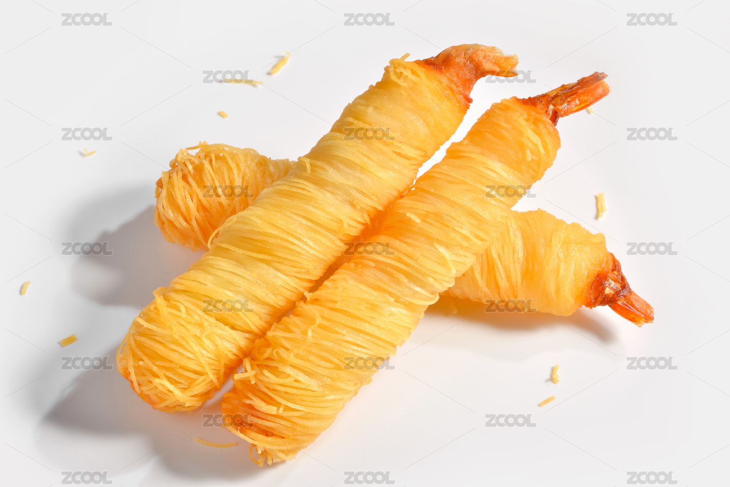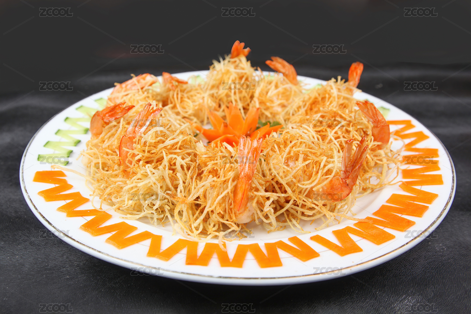 圓形白瓷盤裝的金絲水果大蝦(天婦羅炸蝦)
