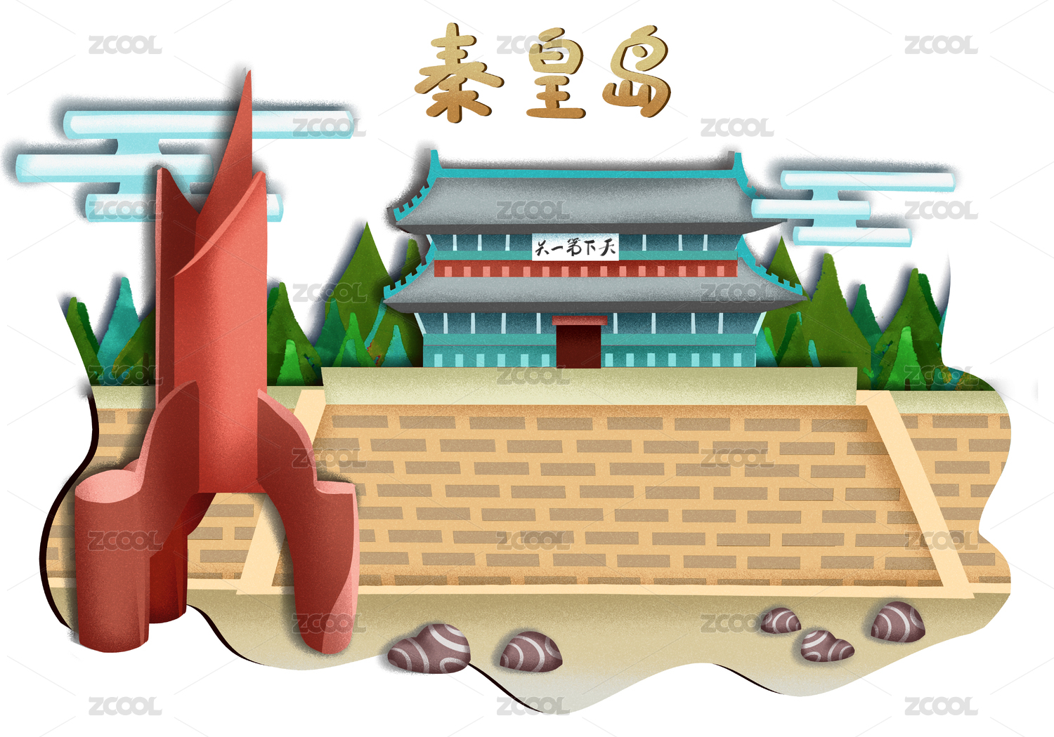 剪紙風格中國河北省秦皇島著名景點山海關和人民廣場紅色雕塑插畫
