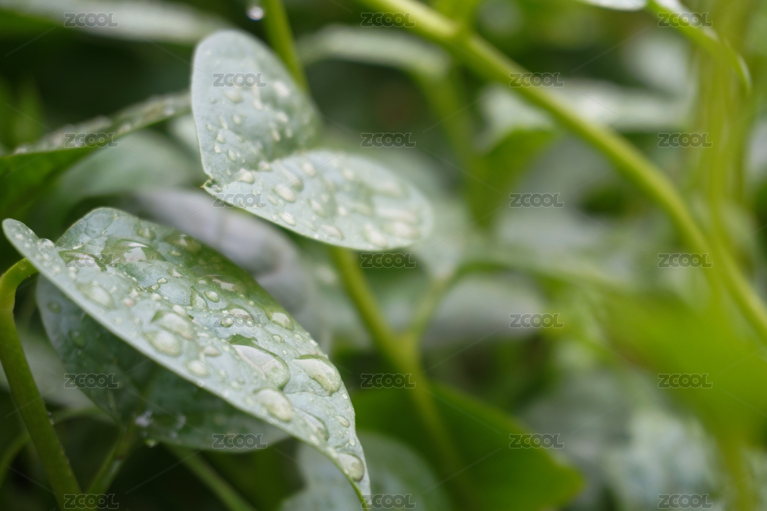 新鮮綠色葉子上布滿雨滴,雨天過后的菜園