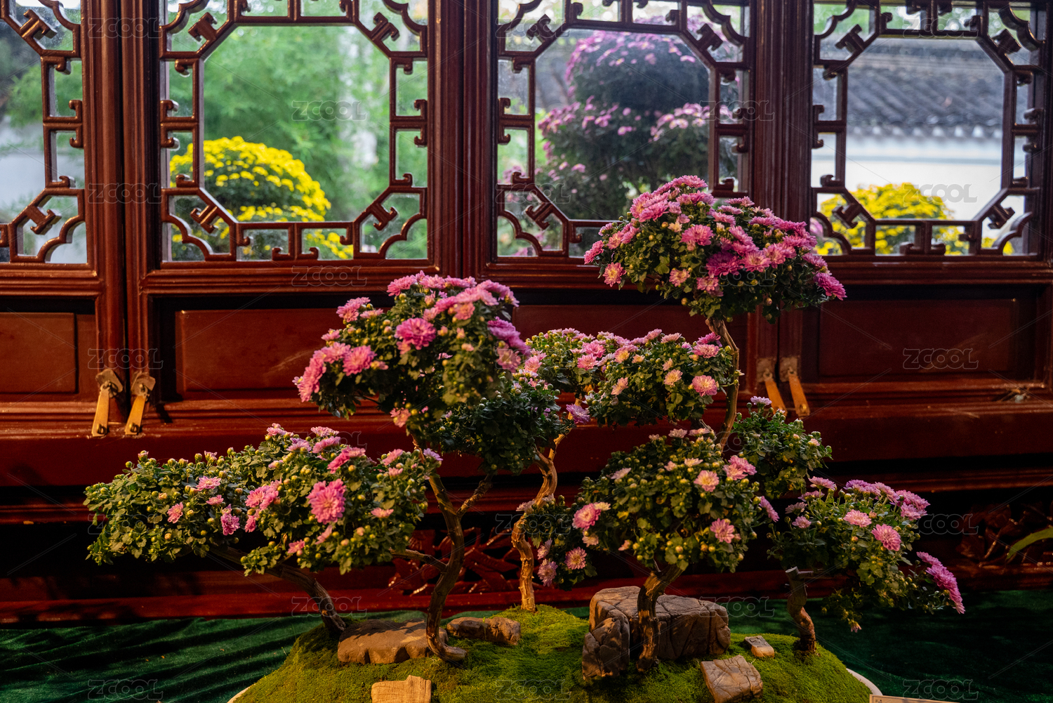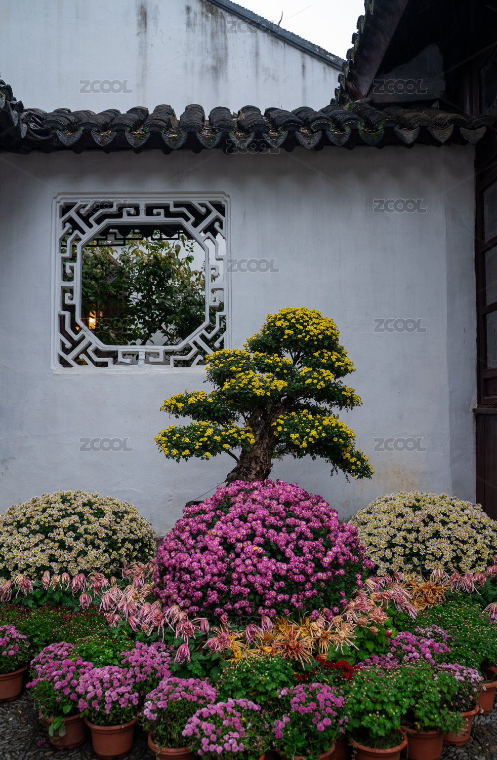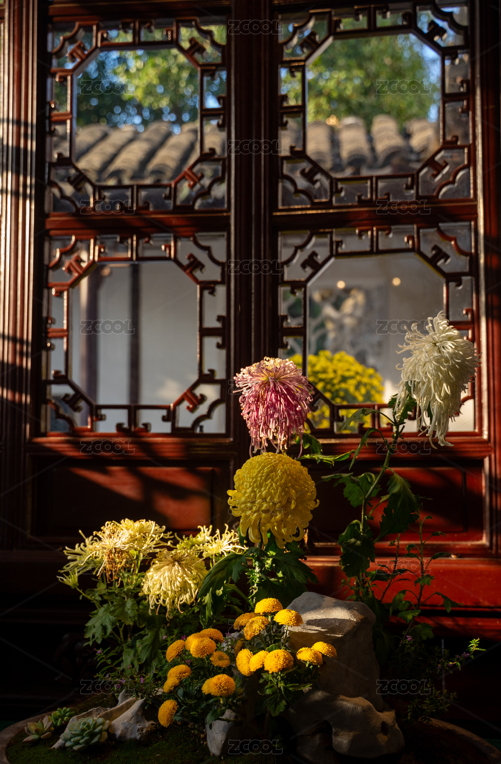 秋天蘇州獅子林盛開的菊花與古典花窗