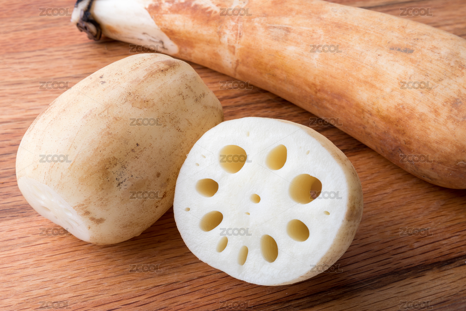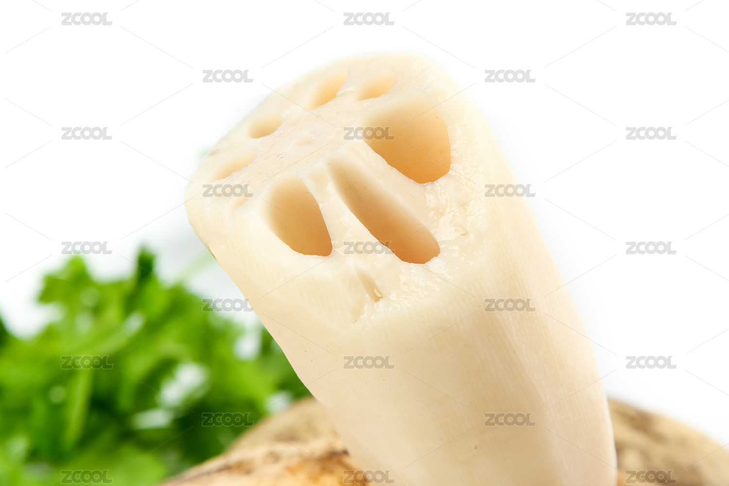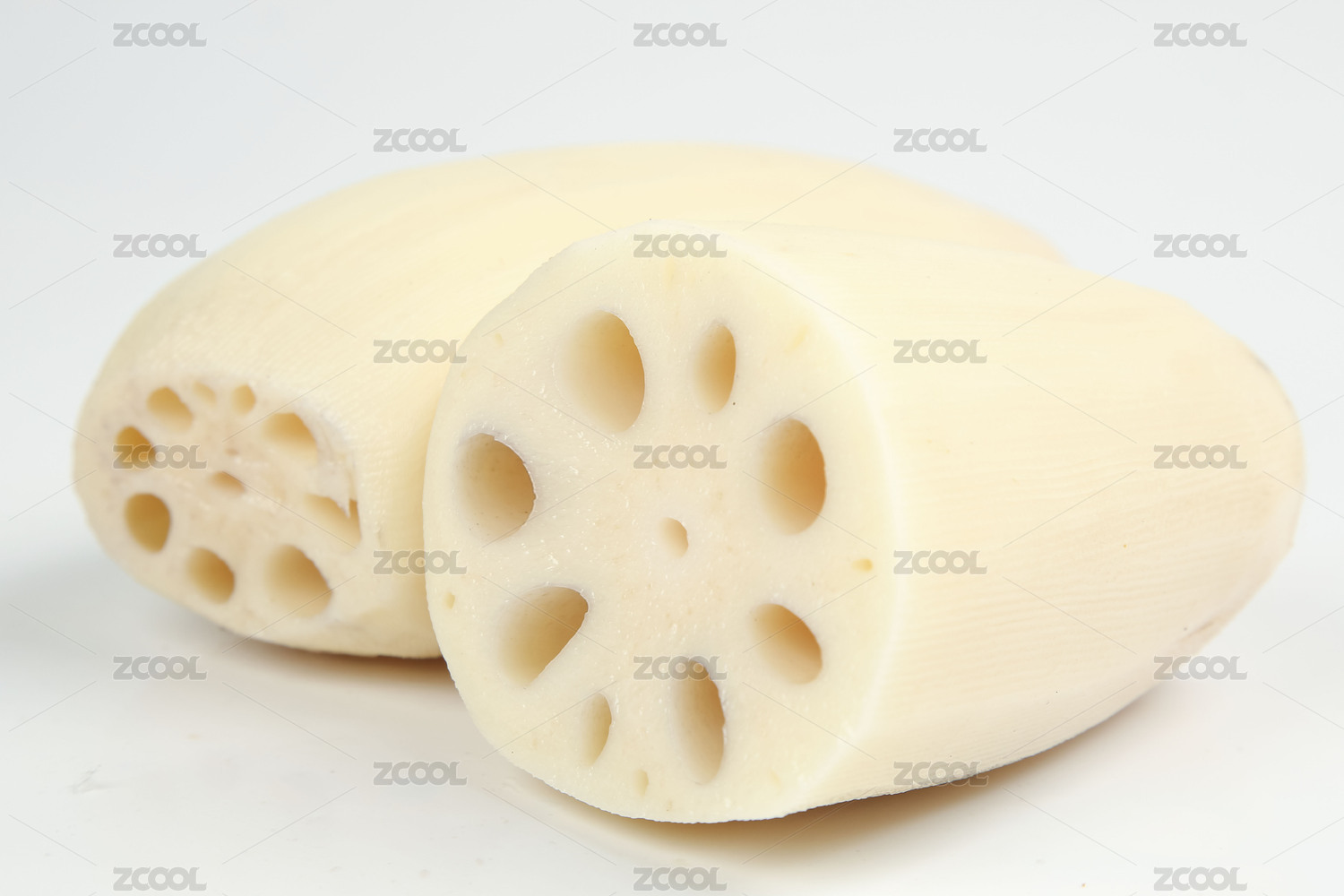 白底上放著一節(jié)削皮蓮藕和半節(jié)削皮的嫩藕