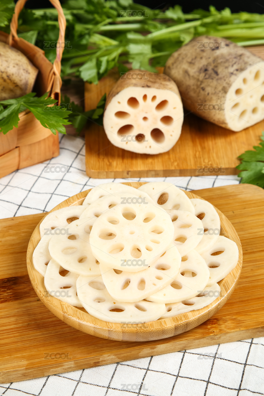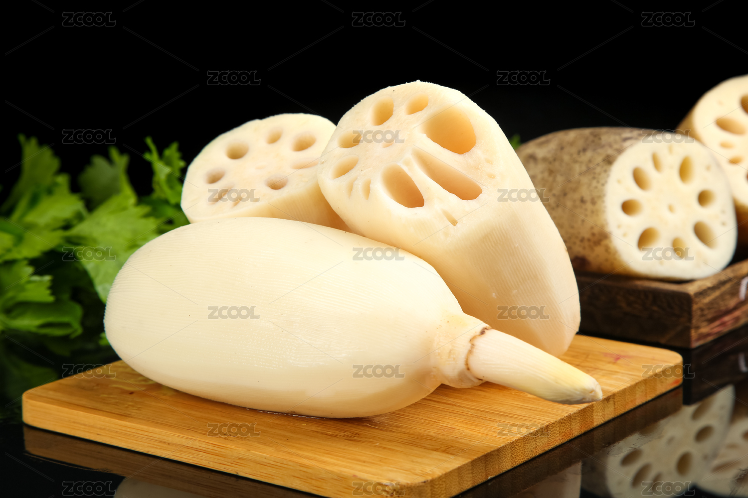 黑底上木盤里放著兩節(jié)削皮的嫩藕