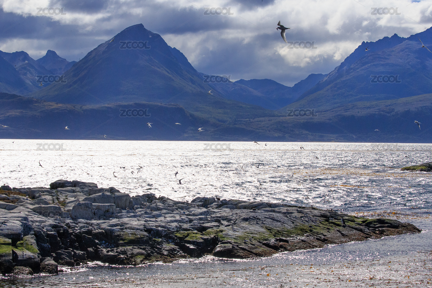 南美洲阿根廷的火地島國家中一群海鳥在南冰洋的海面起飛