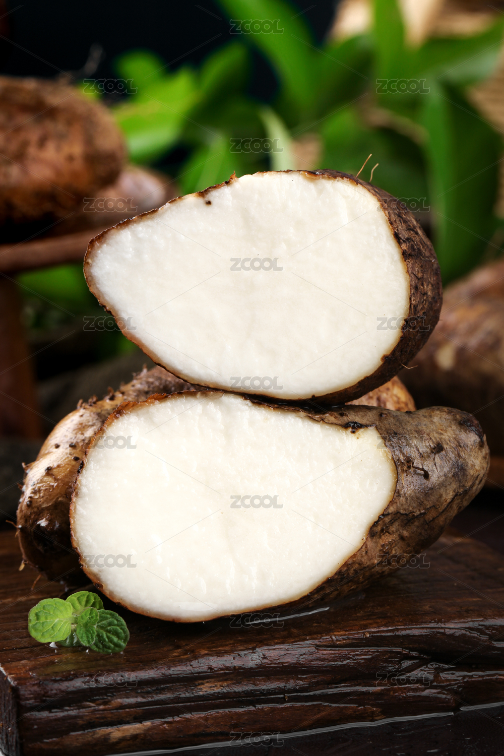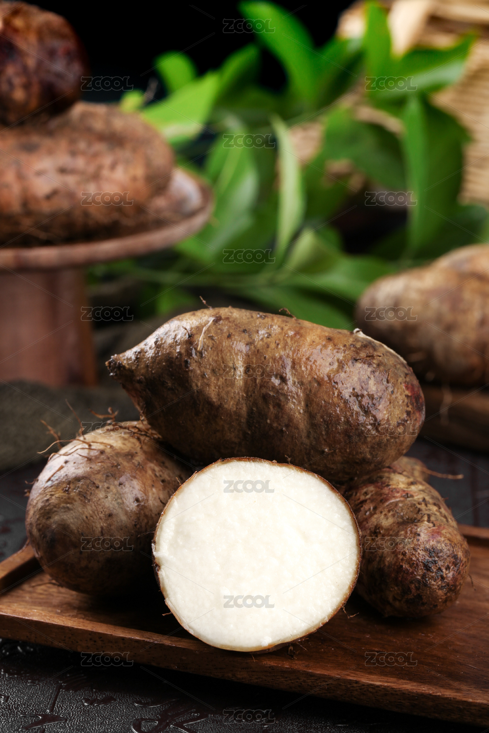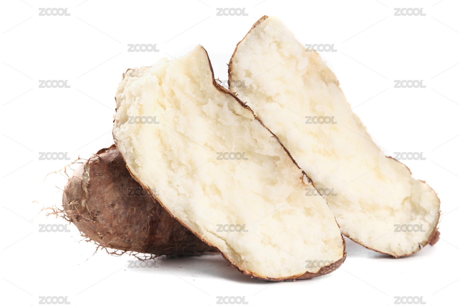 白底上放著半邊甜薯和一個(gè)完整的毛薯