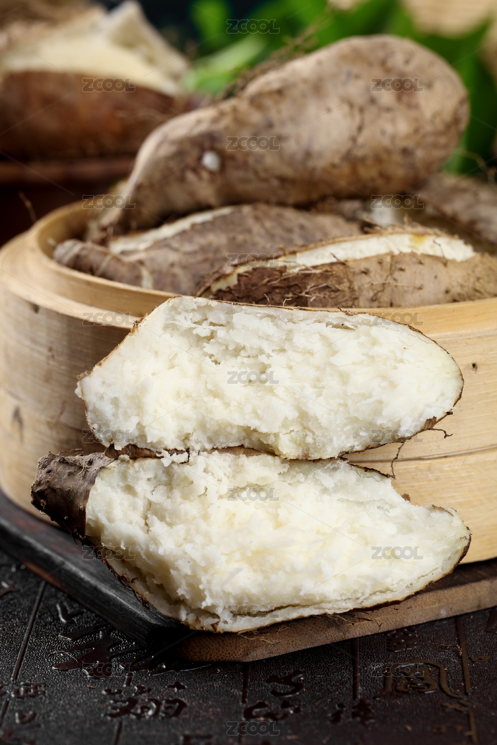 白底上放著一籠蒸熟的毛薯