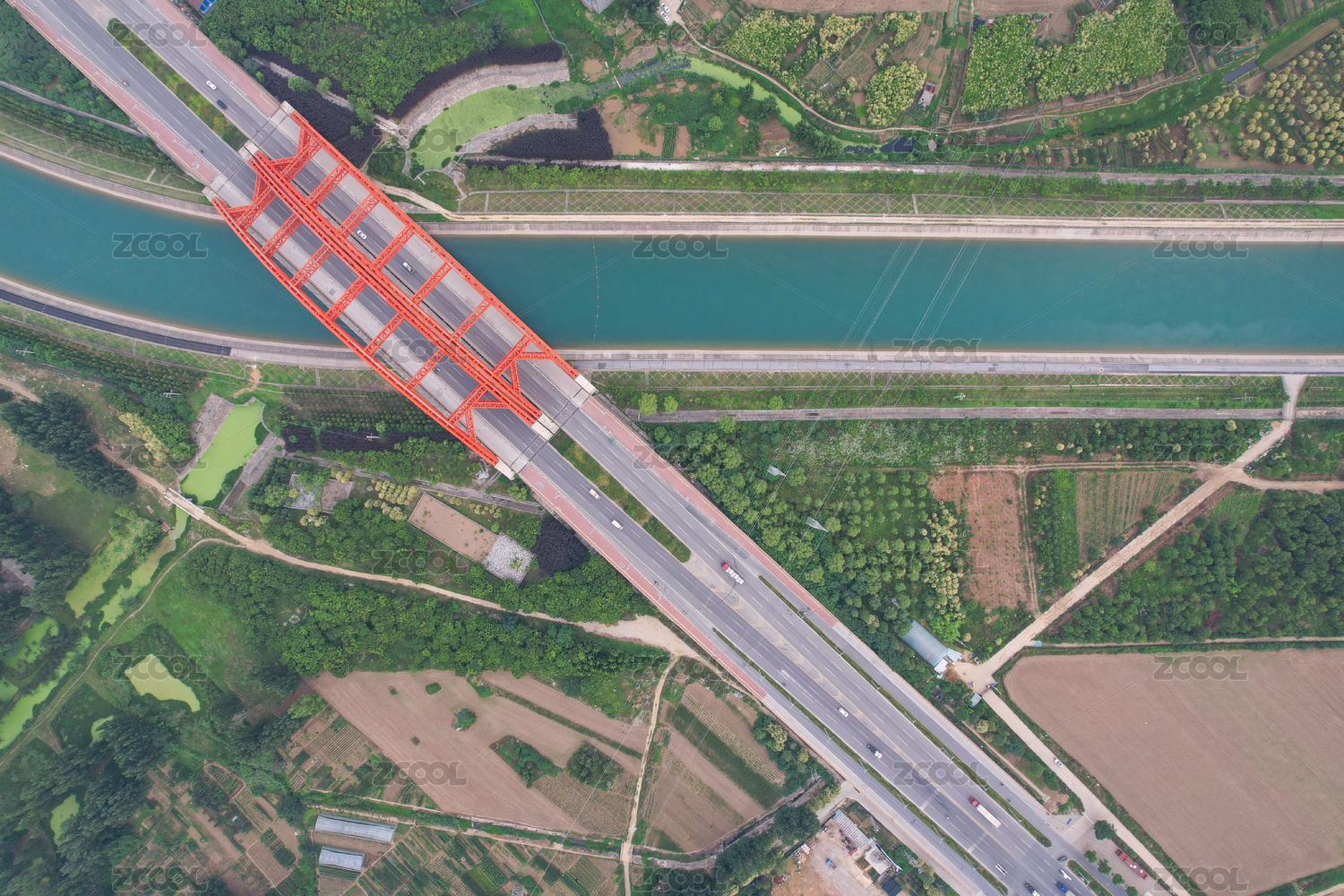 航拍河南南陽(yáng)橫跨南水北調(diào)干渠的公路桿拱橋
