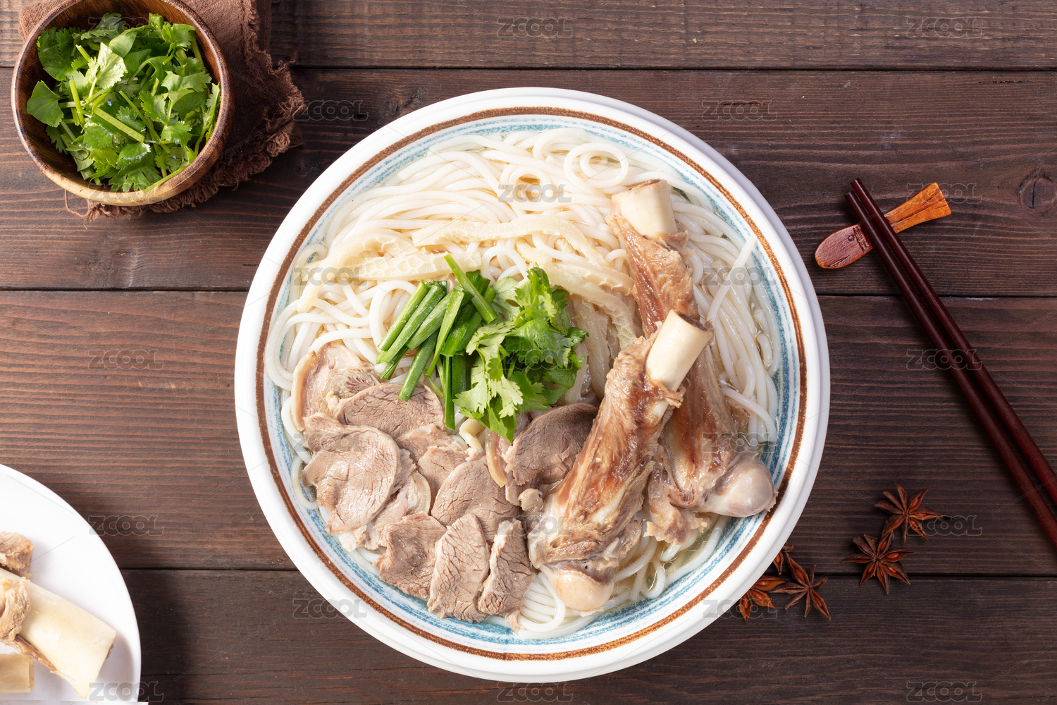 木桌上大碗里的清湯羊蝎子羊肉米線