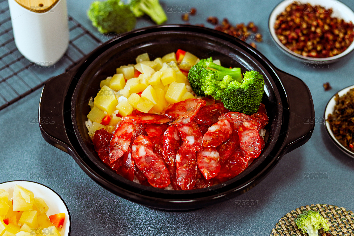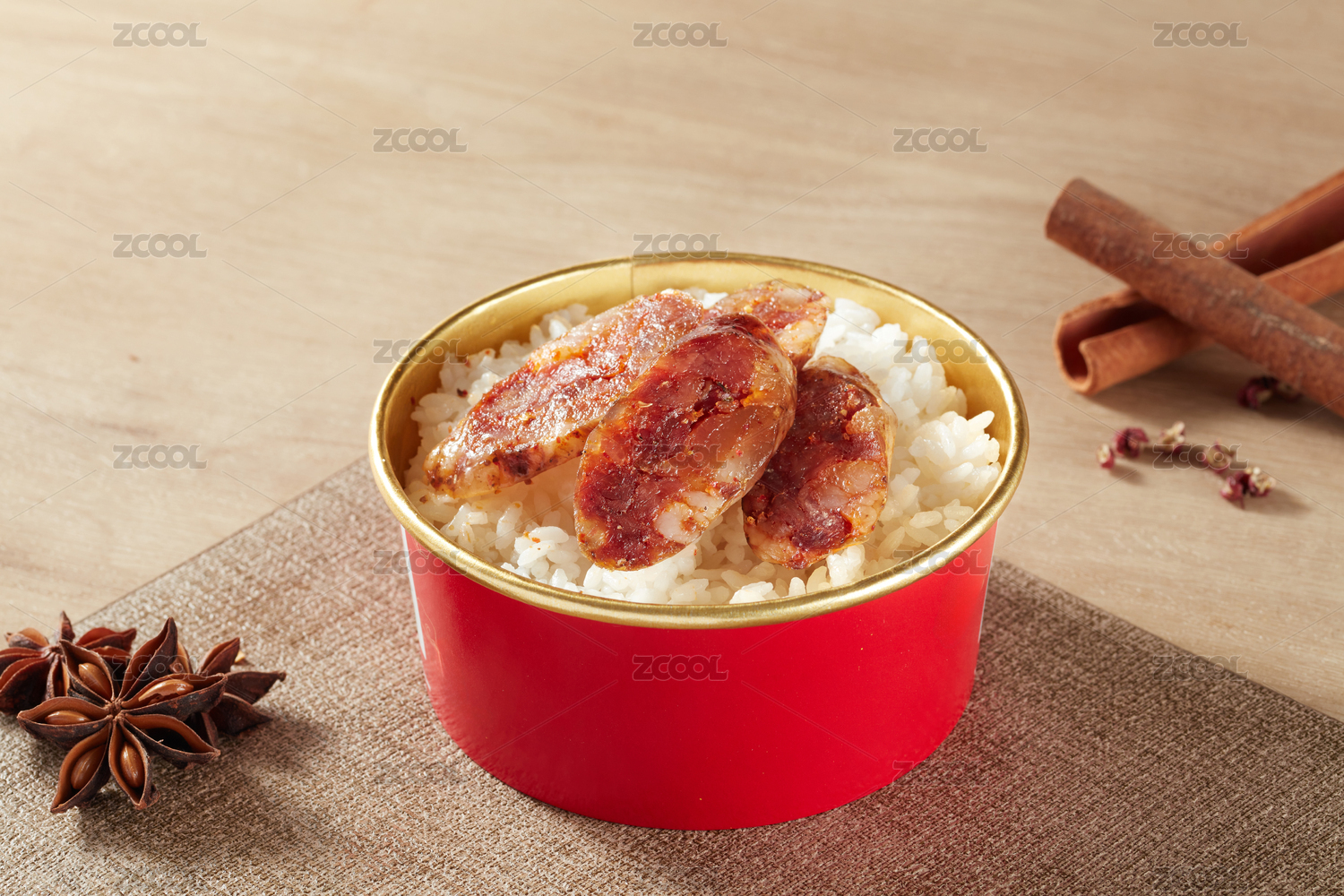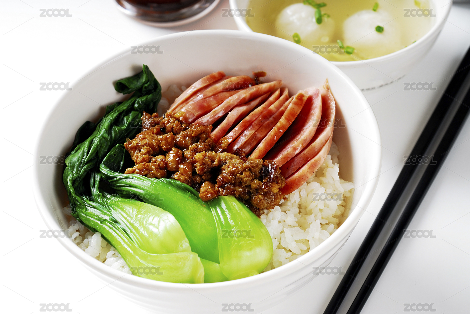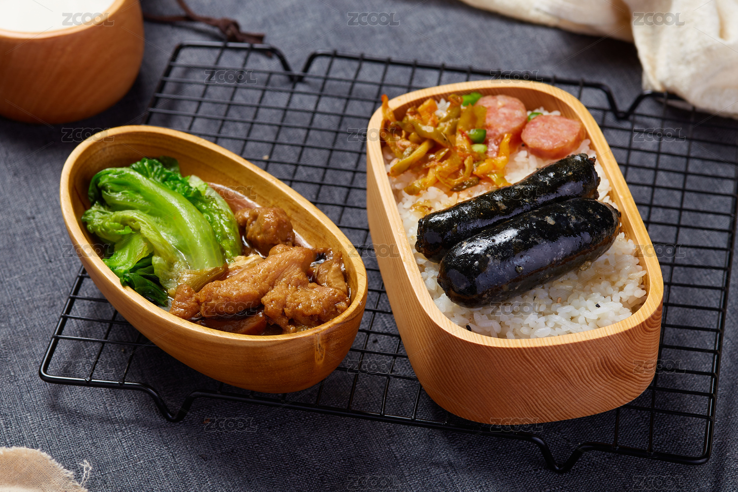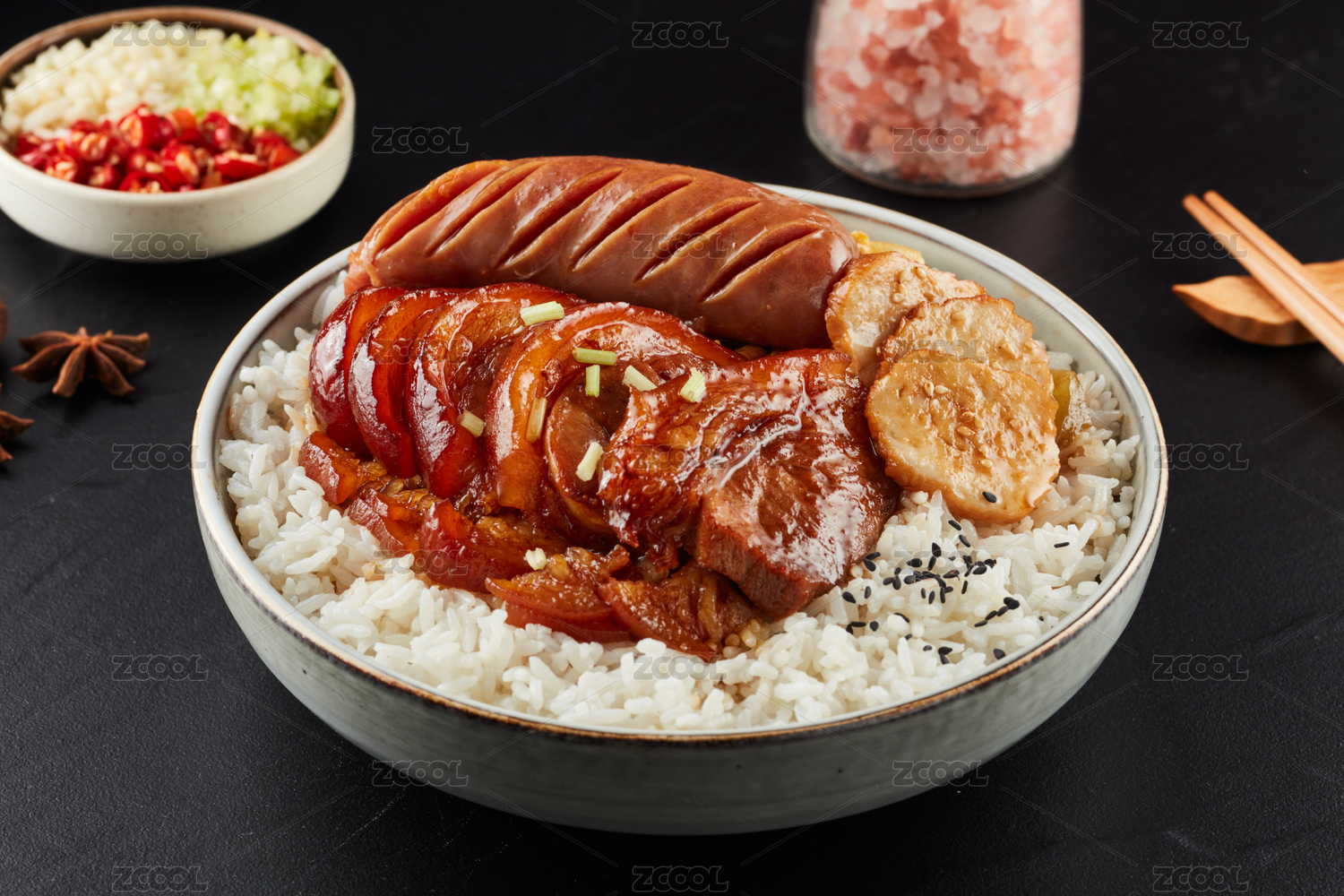 日式大碗里的日本料理香煎牛肉塊墨魚香腸飯