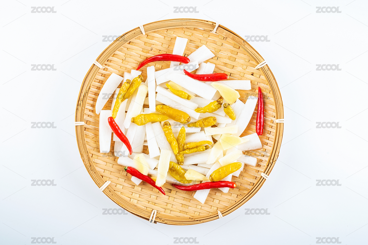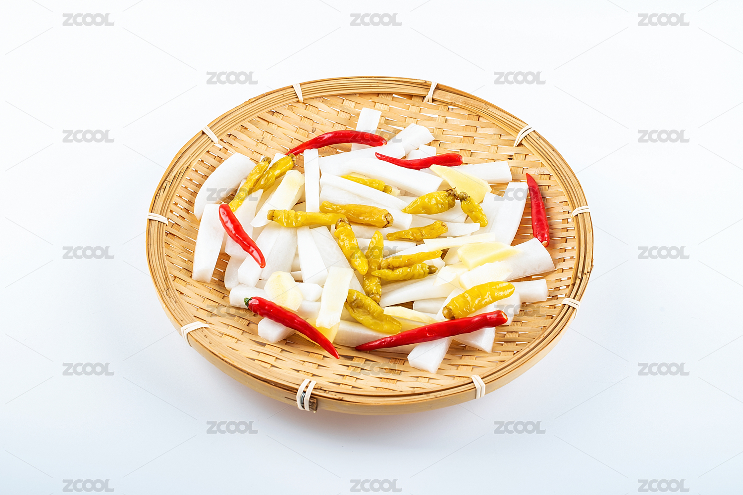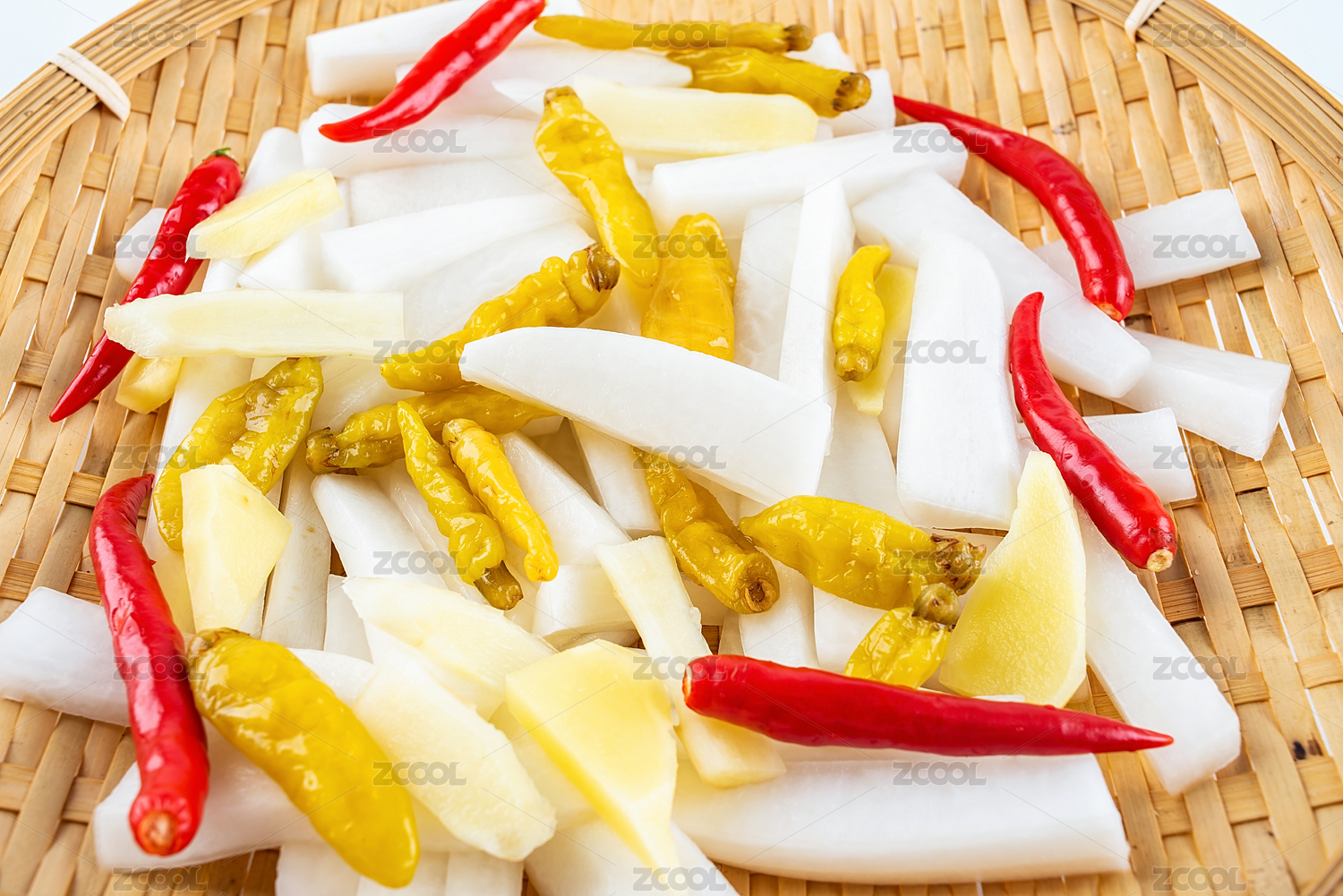 一竹篩子制作酸菜的新鮮食材蘿卜和辣椒在白背景上