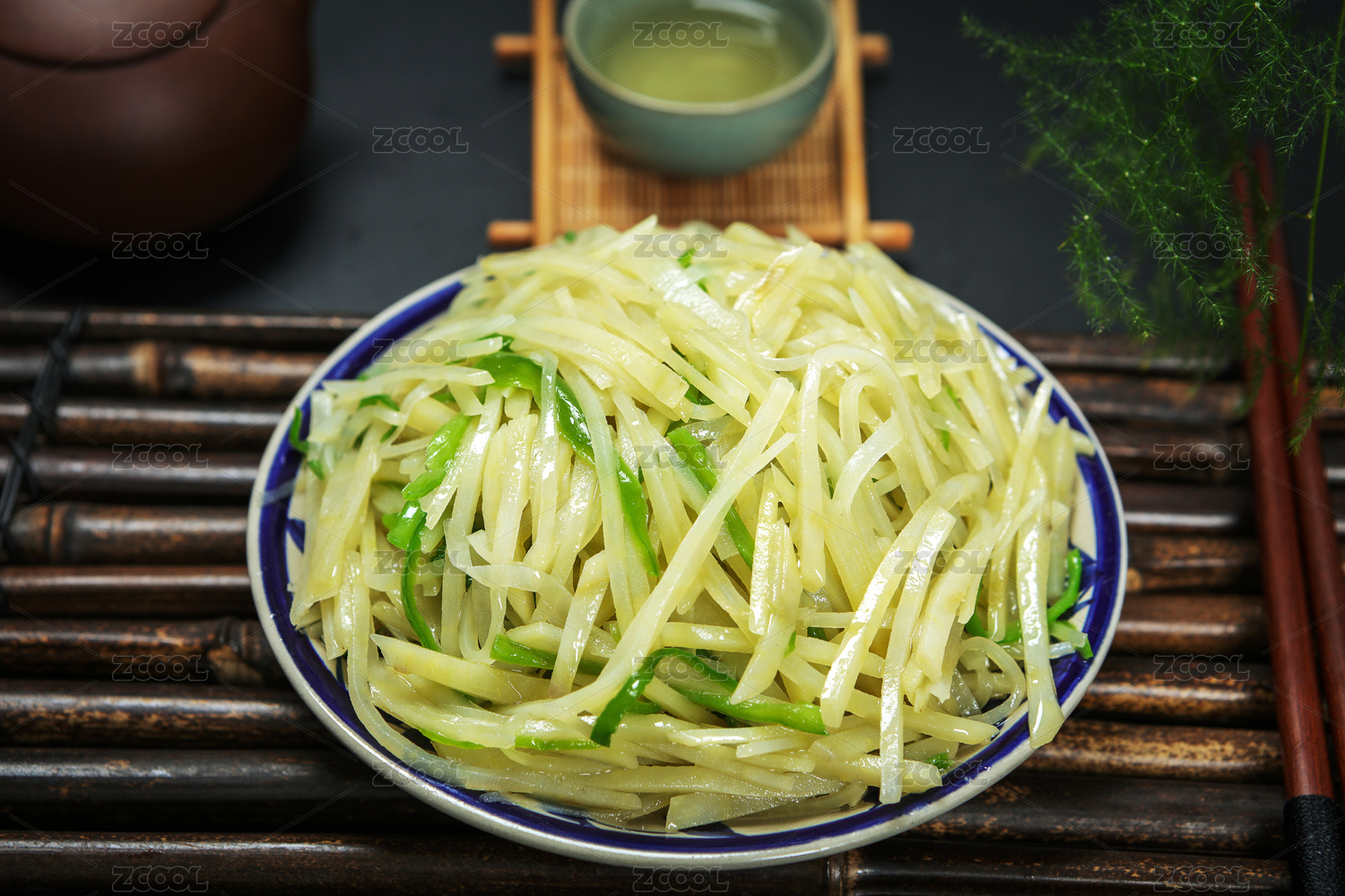 黑底藍邊白盤家常土豆絲