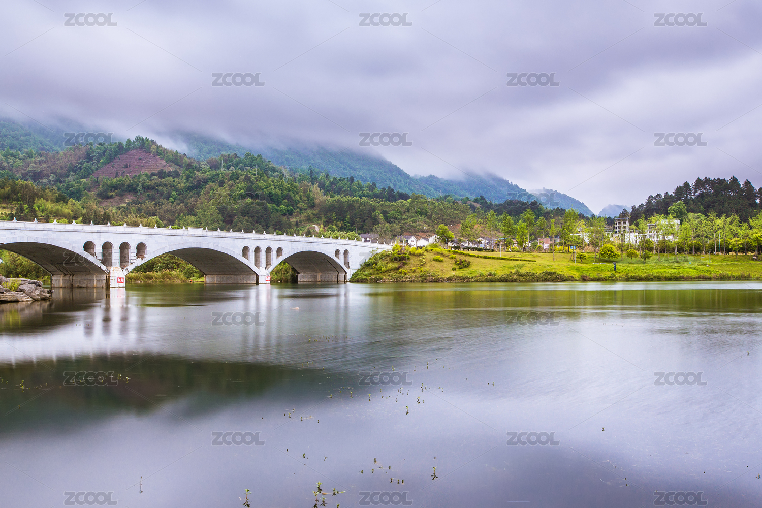 荷花海國家森林公園月亮湖山間溪流木橋風景