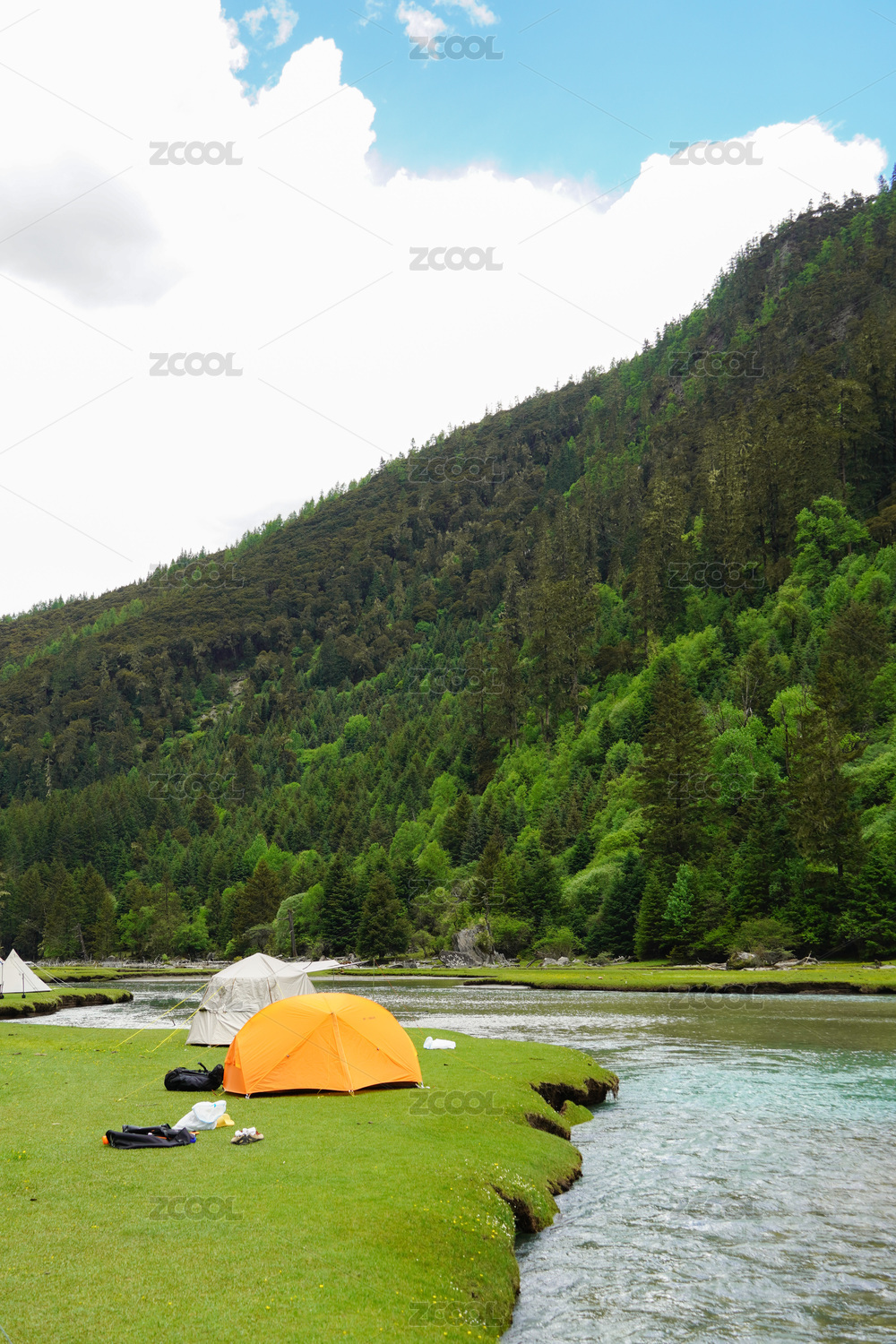 荷花海國家森林公園月亮湖河邊草地上的帳篷
