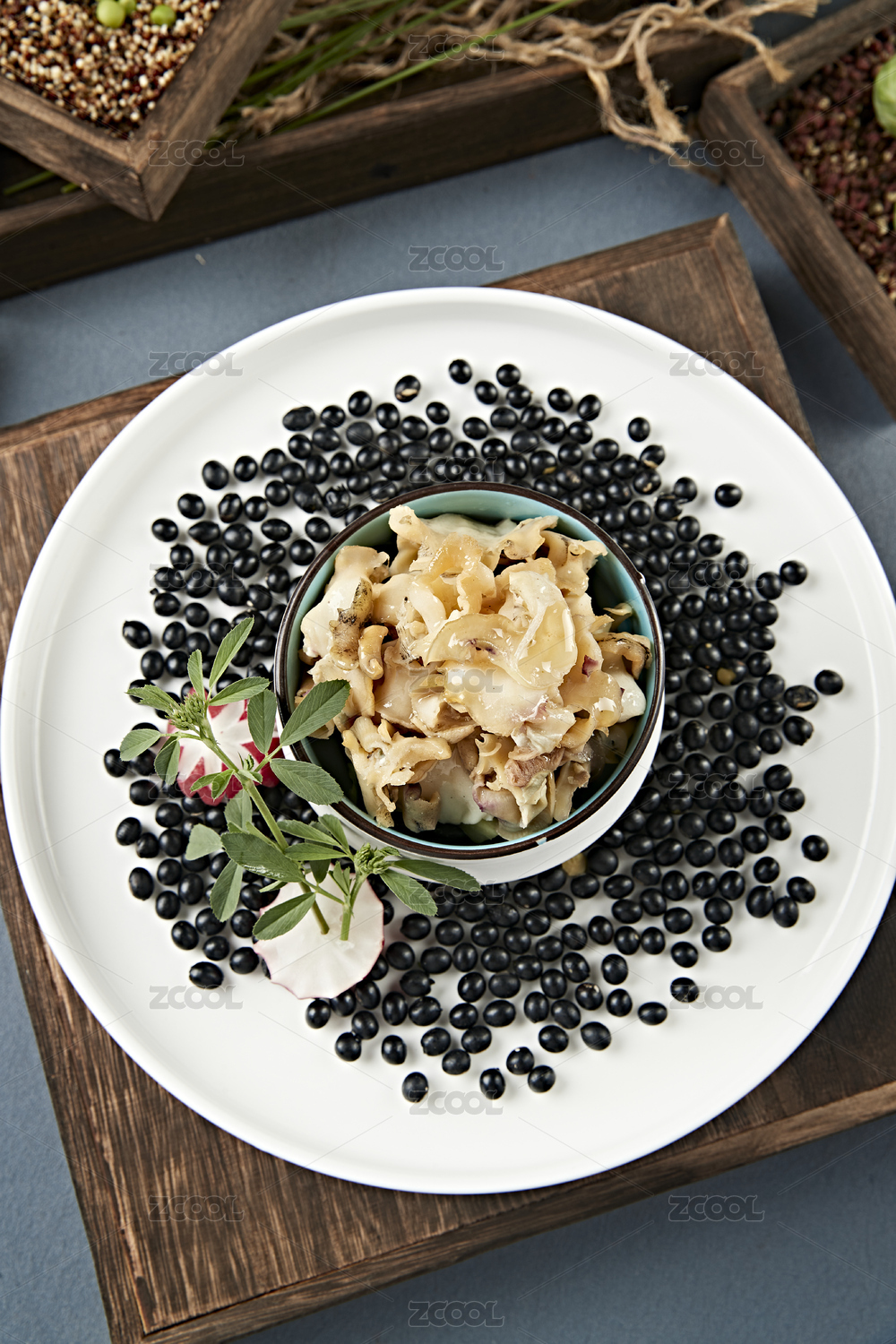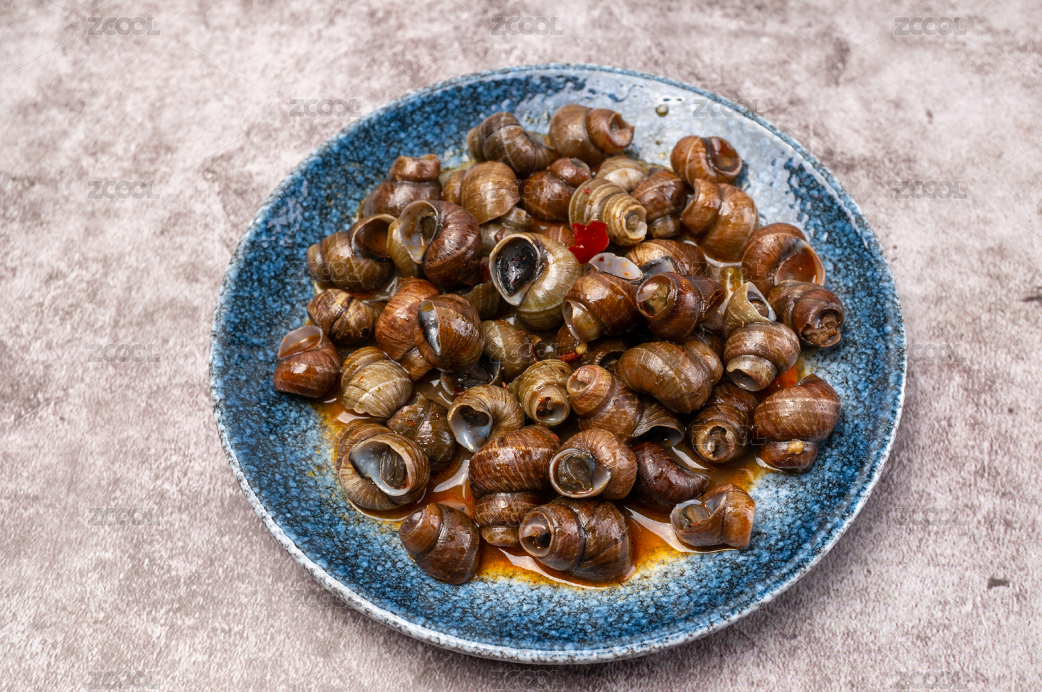 家常菜蒜苔炒田螺肉盛放在藍(lán)邊碗內(nèi)