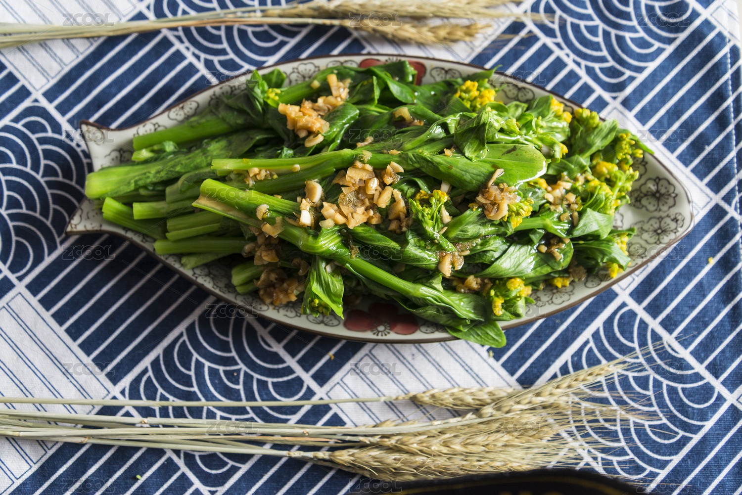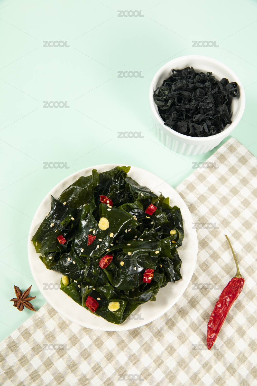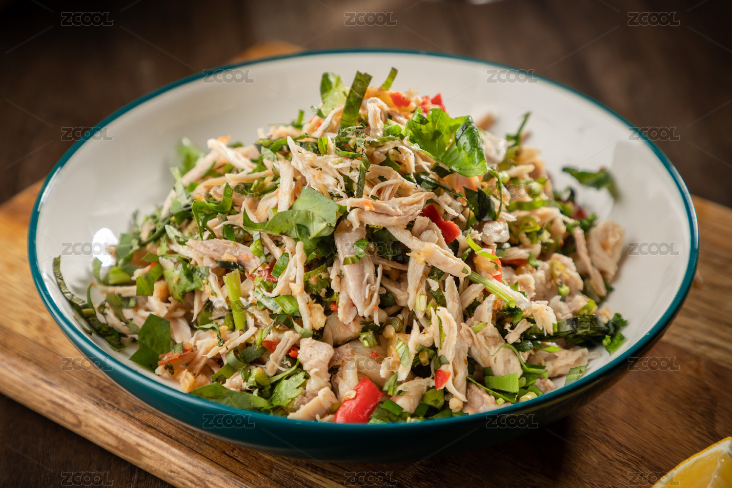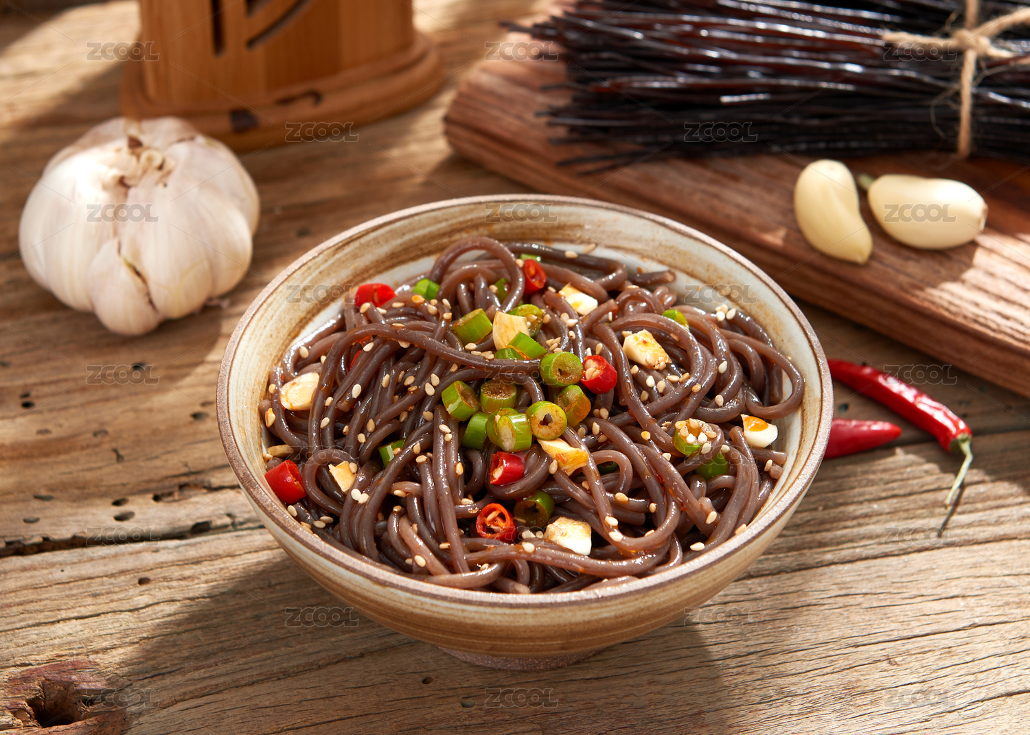 木桌背景的西蘭花瘦肉涼拌麻辣米皮的
