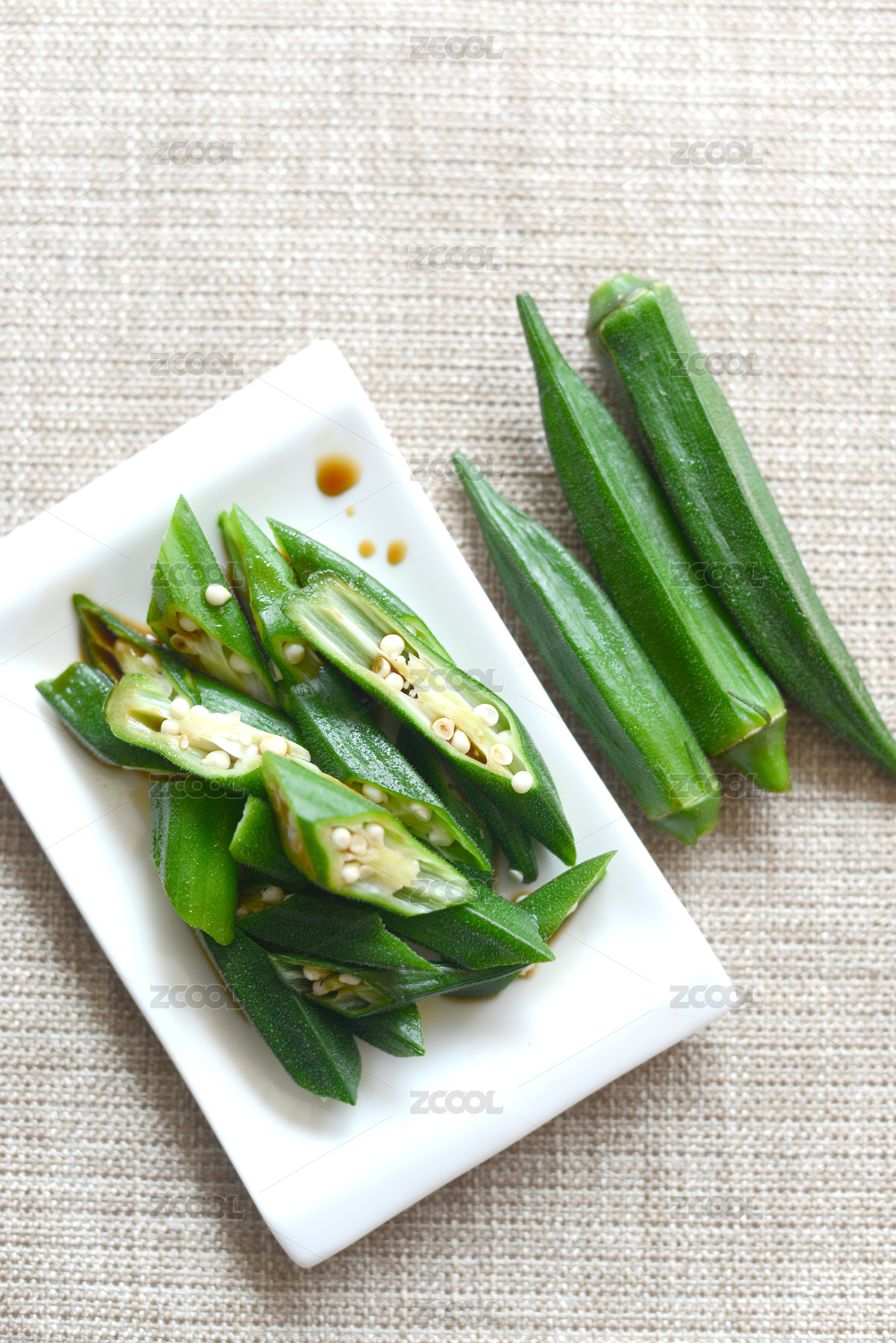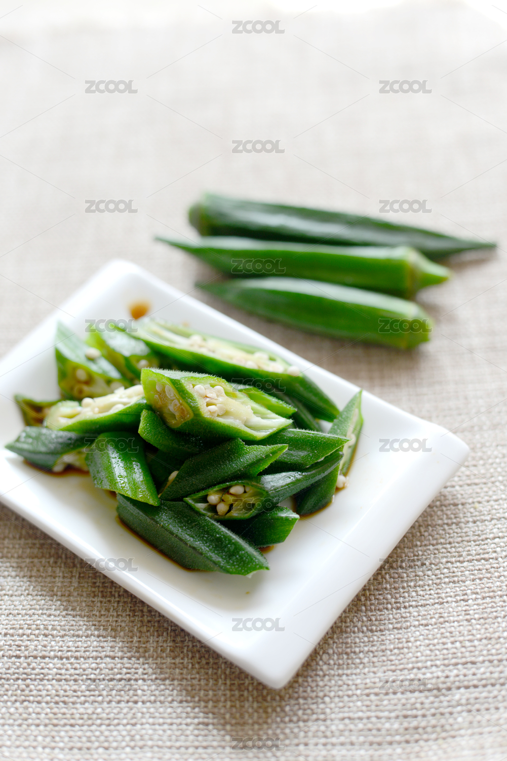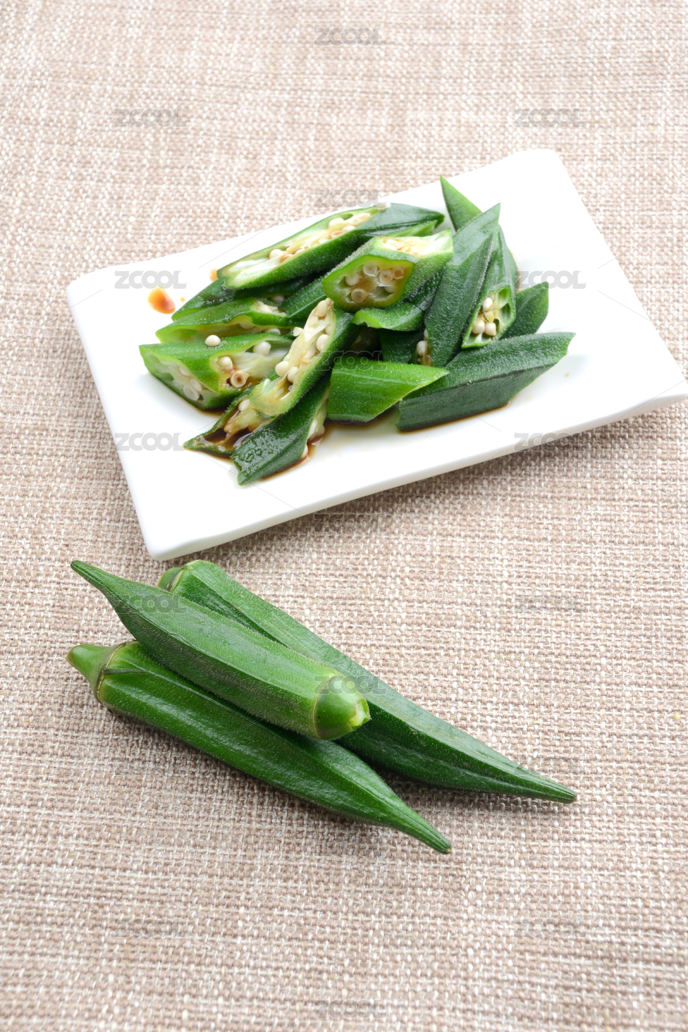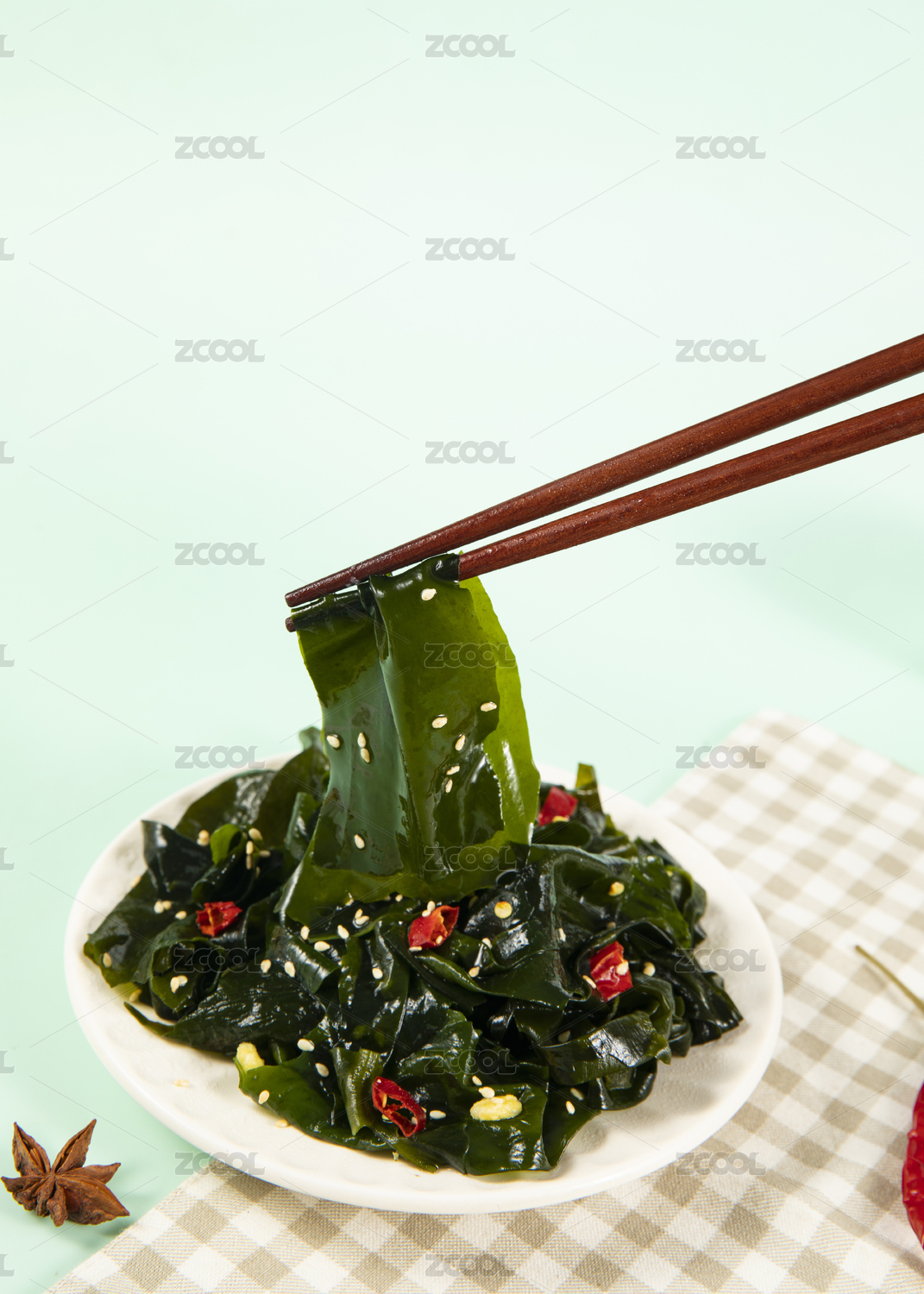 木桌背景的西蘭花瘦肉涼拌麻辣米皮的