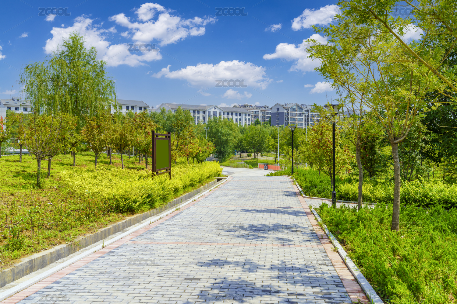 公園青磚路晴天綠色樹林風景