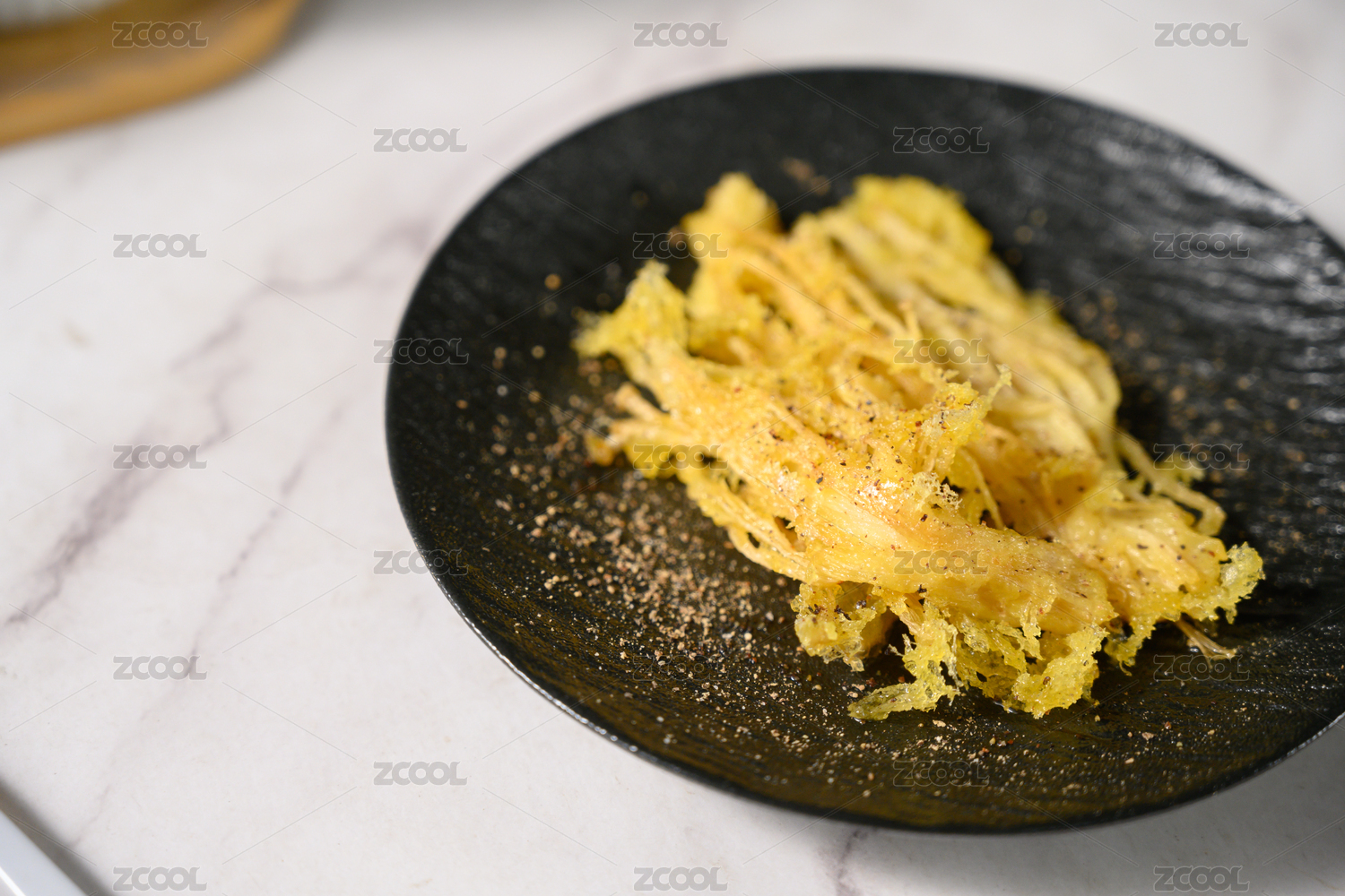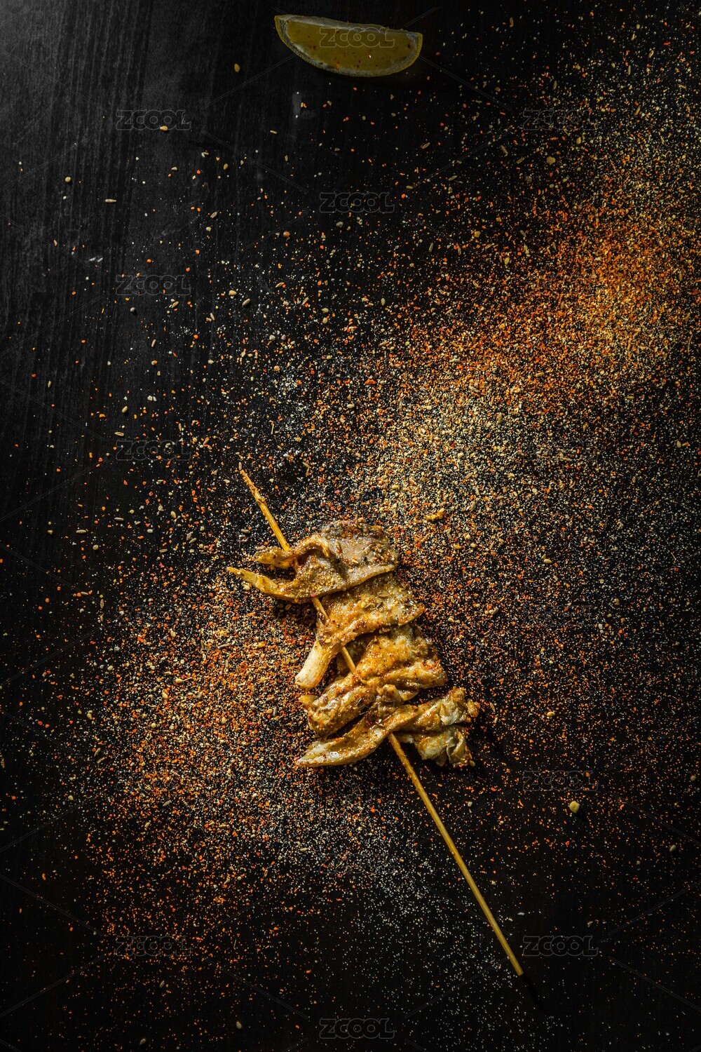 撒著辣椒面的黑色桌面上放著一串油炸蘑菇