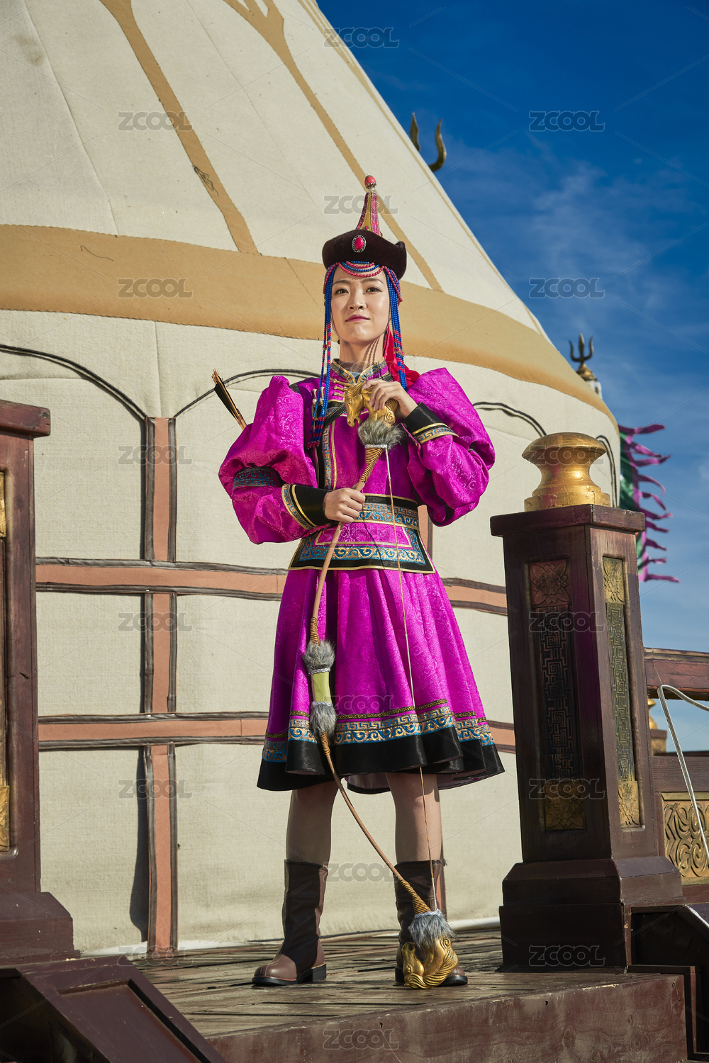 蒙古包前身穿蒙古族飾手持弓箭的蒙族少女