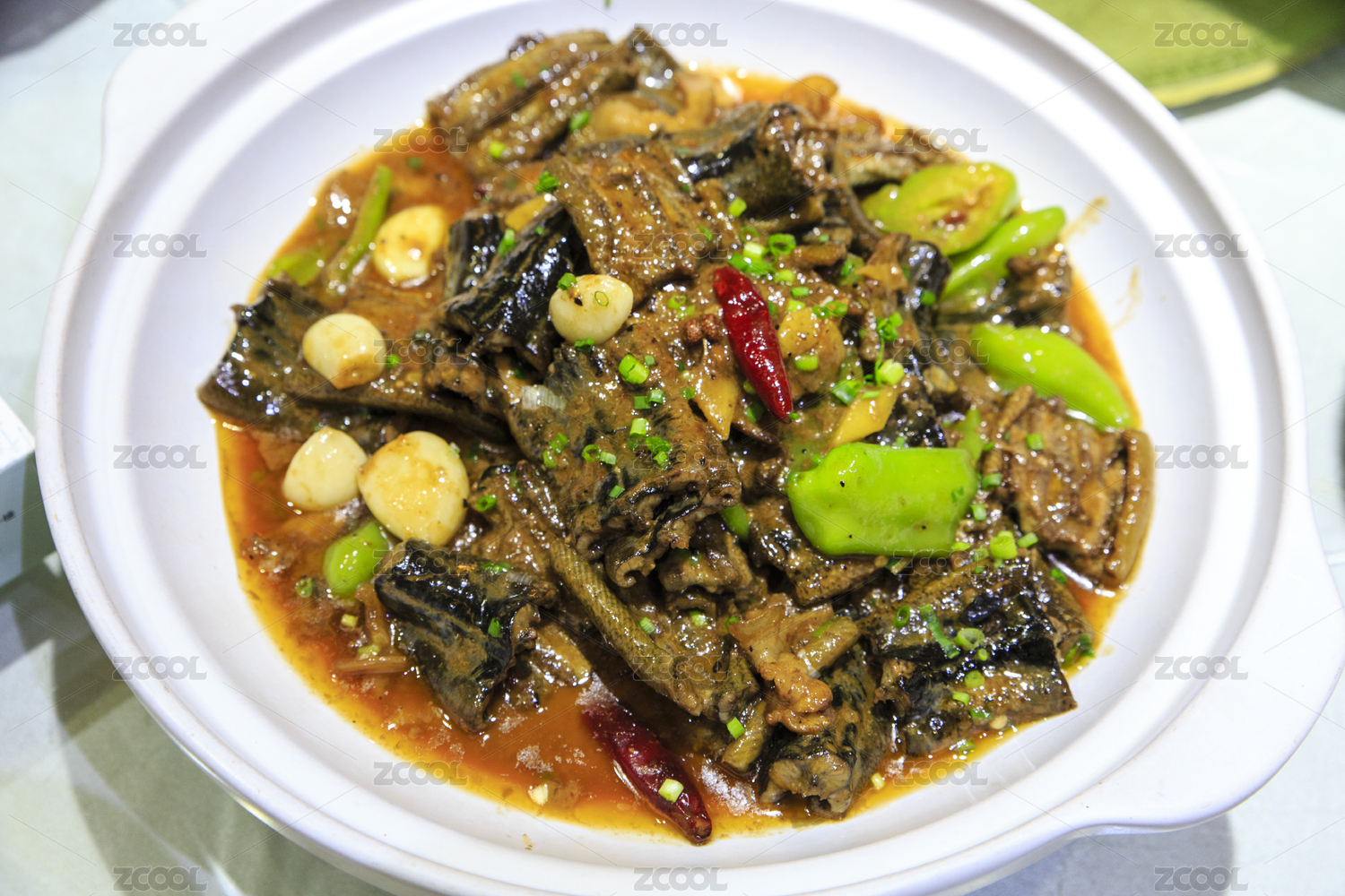 白色砂鍋中的炒鱔魚