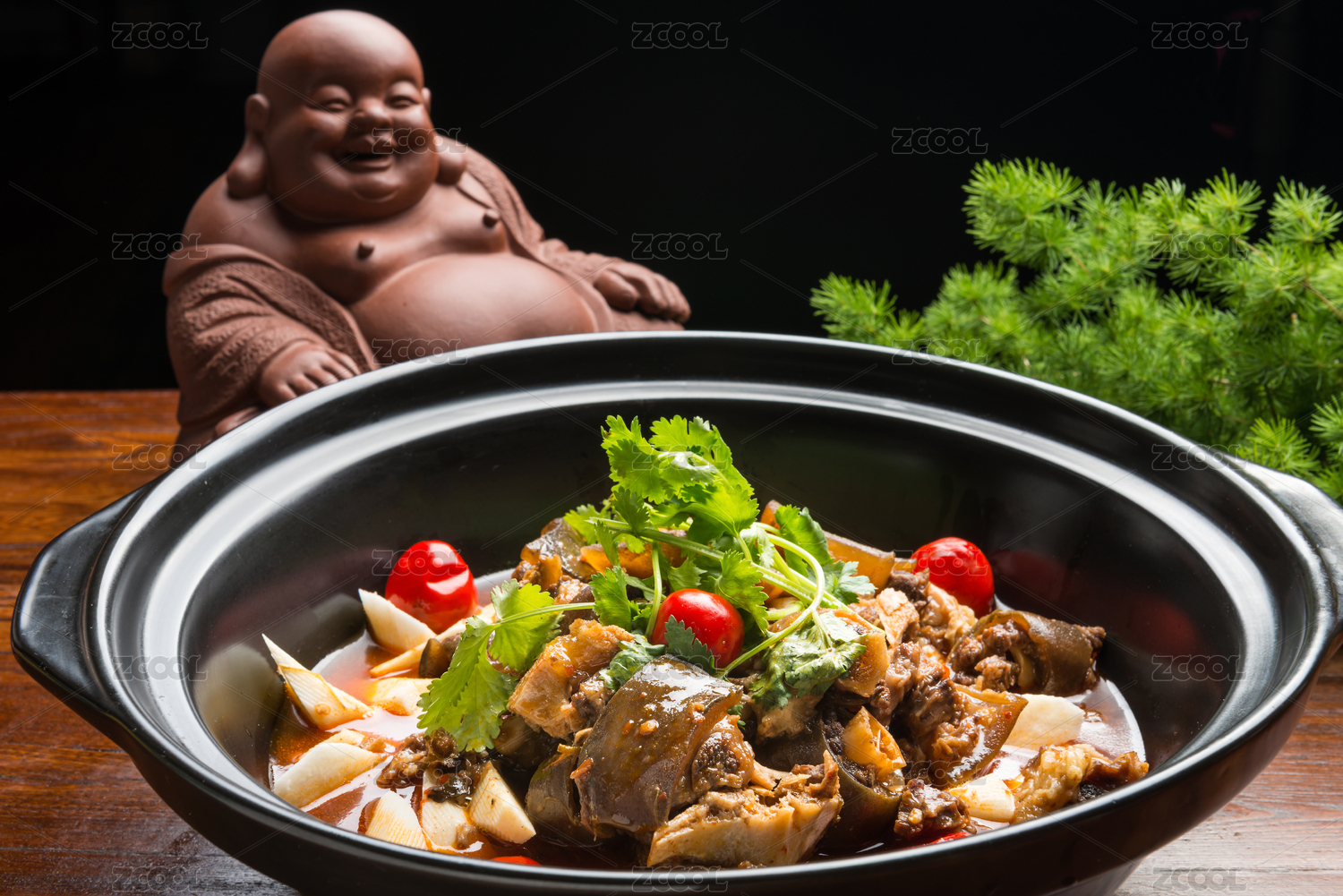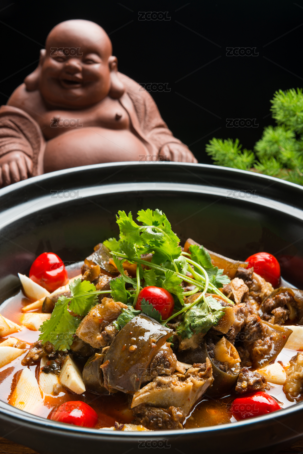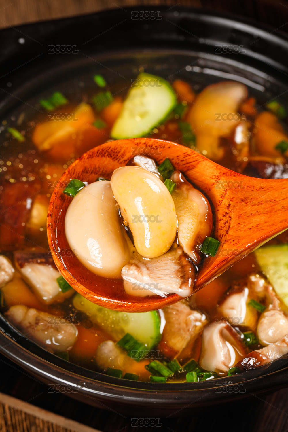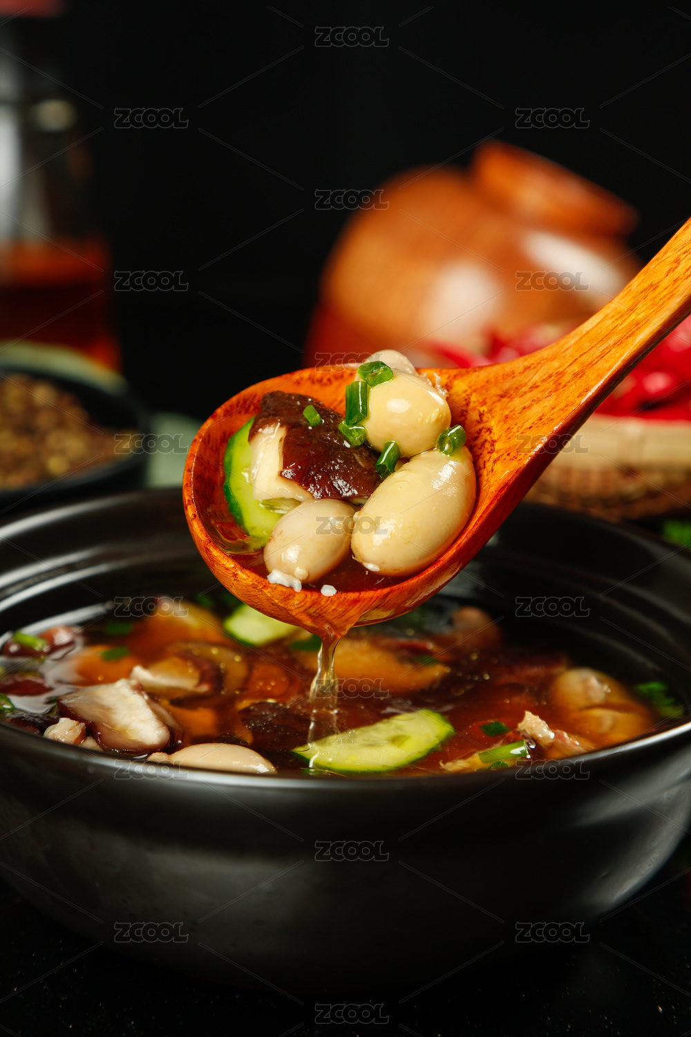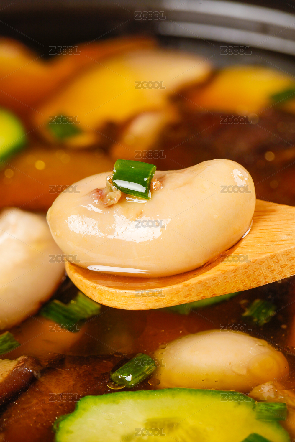 黑底上放著一鍋養(yǎng)生雞腰湯和勺子上挖著雞腰