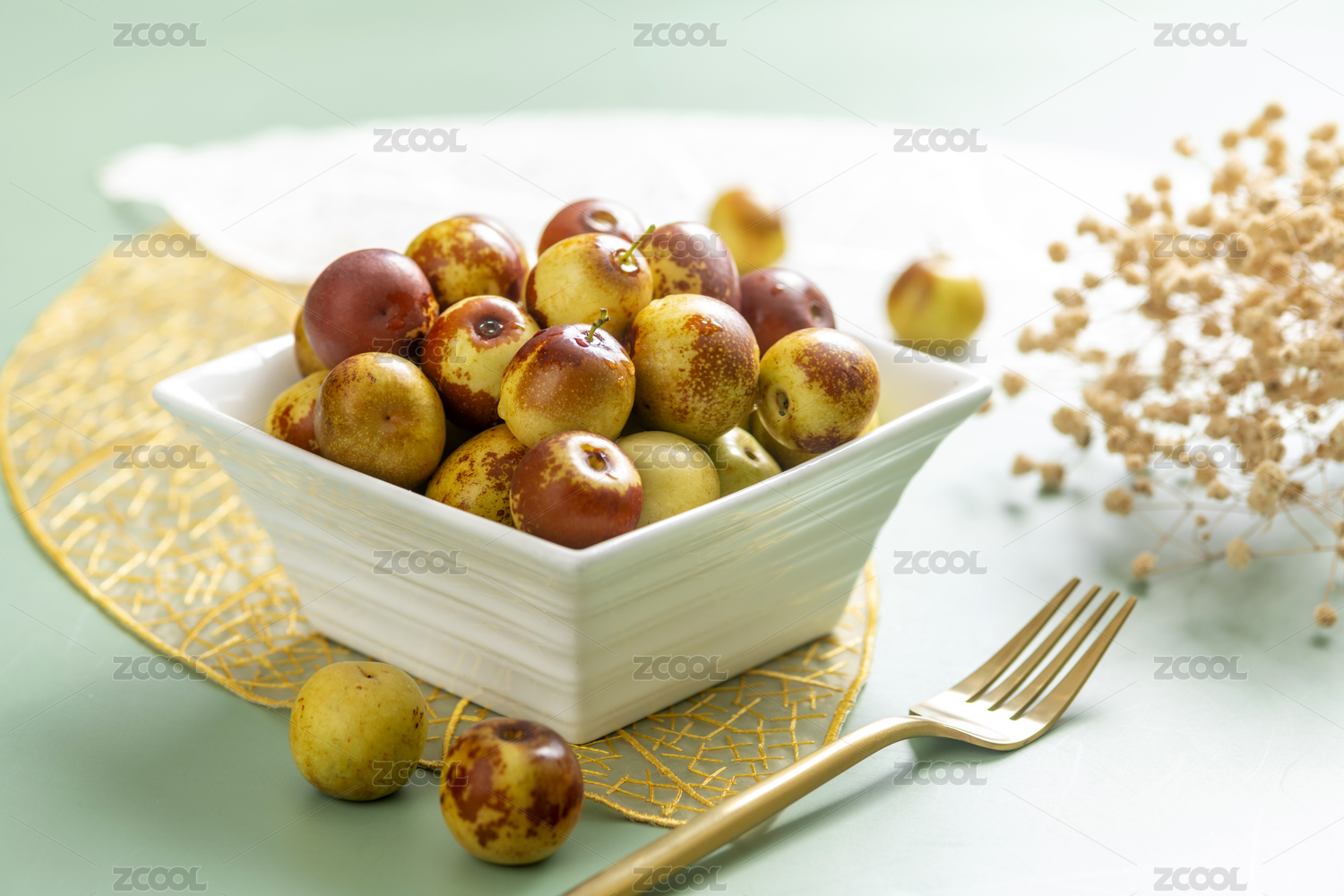 新鮮的冬棗擺放在綠色莫蘭迪色系背景上