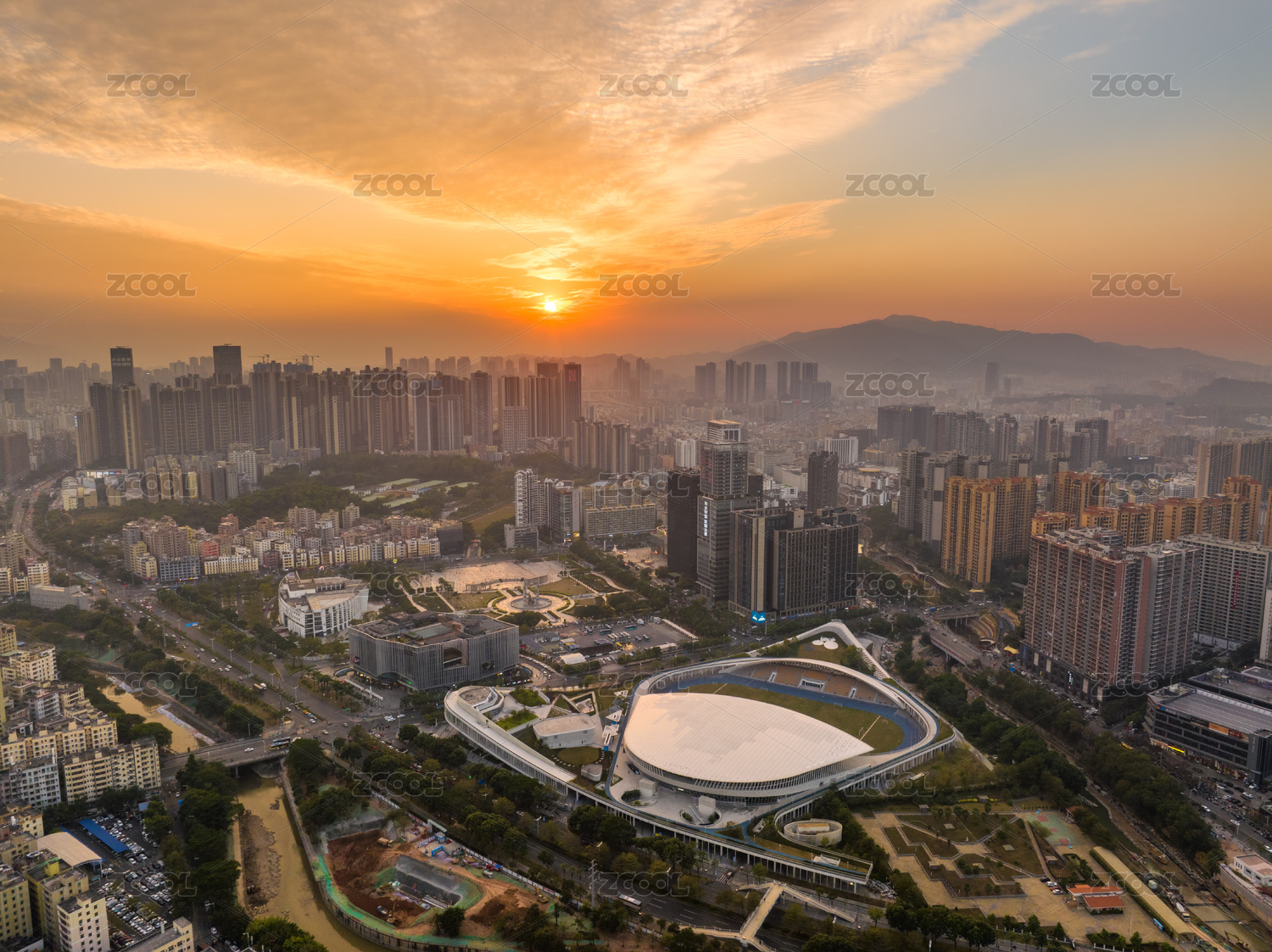 廣東深圳龍華文體中心日落航拍