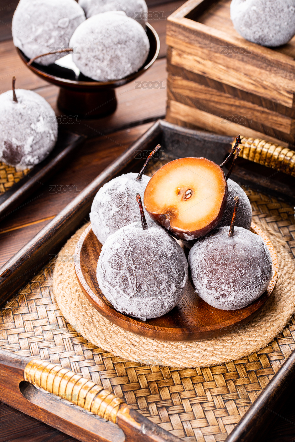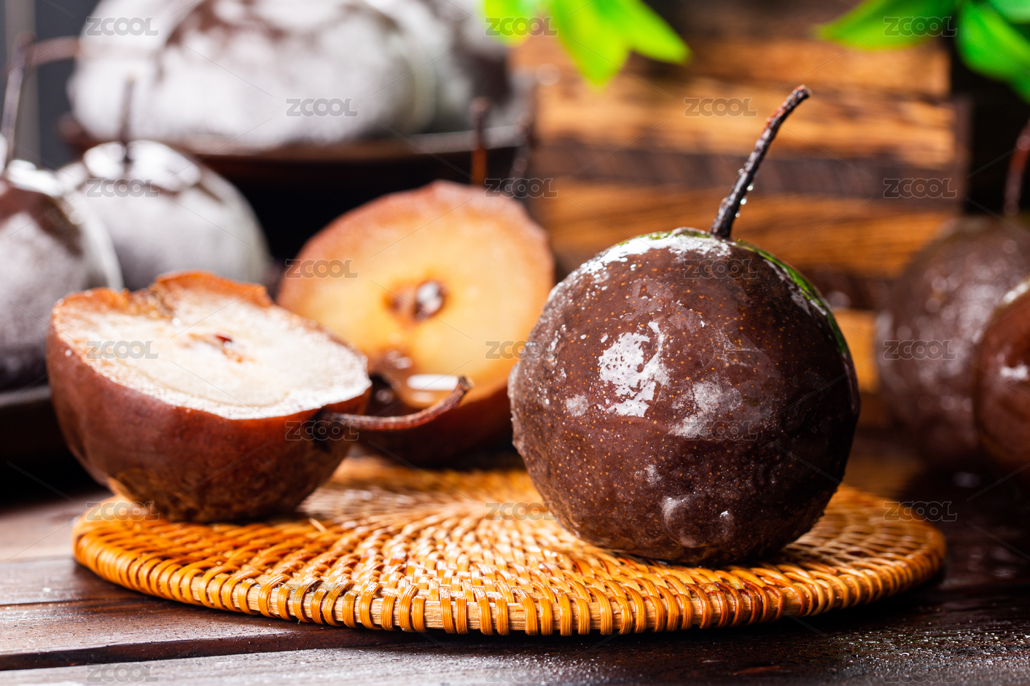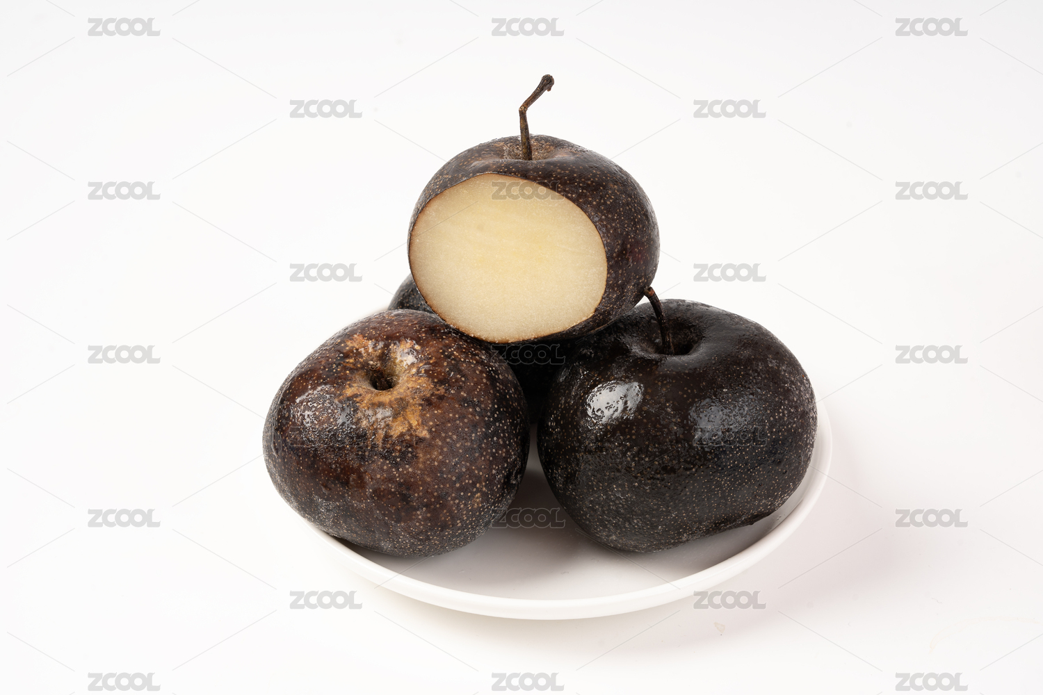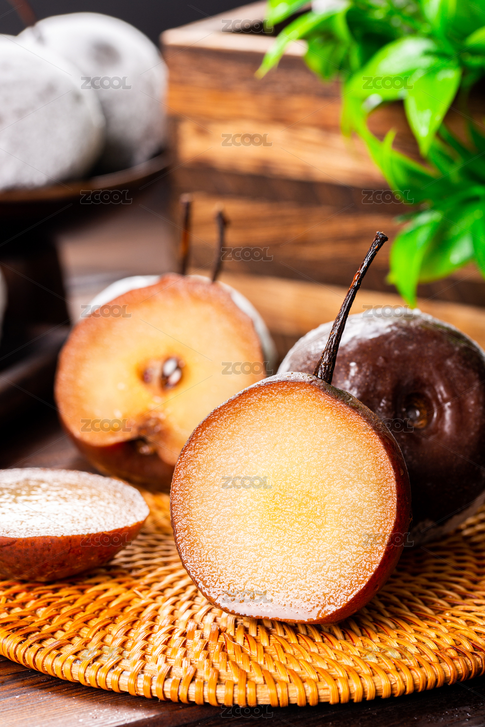 白石盤上放著一個(gè)完整的凍梨和切塊的凍梨