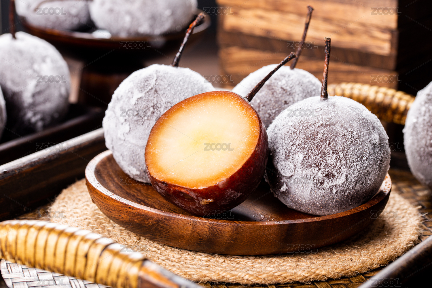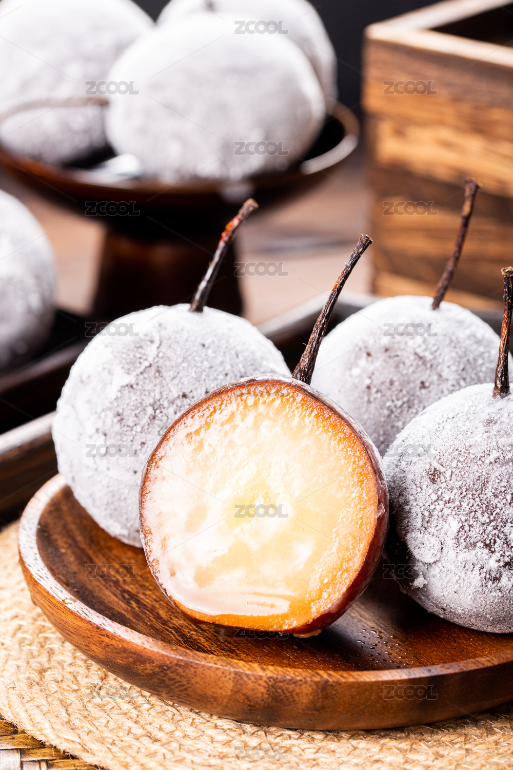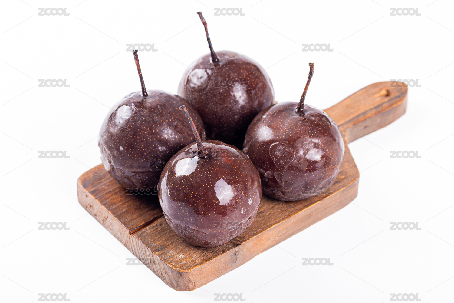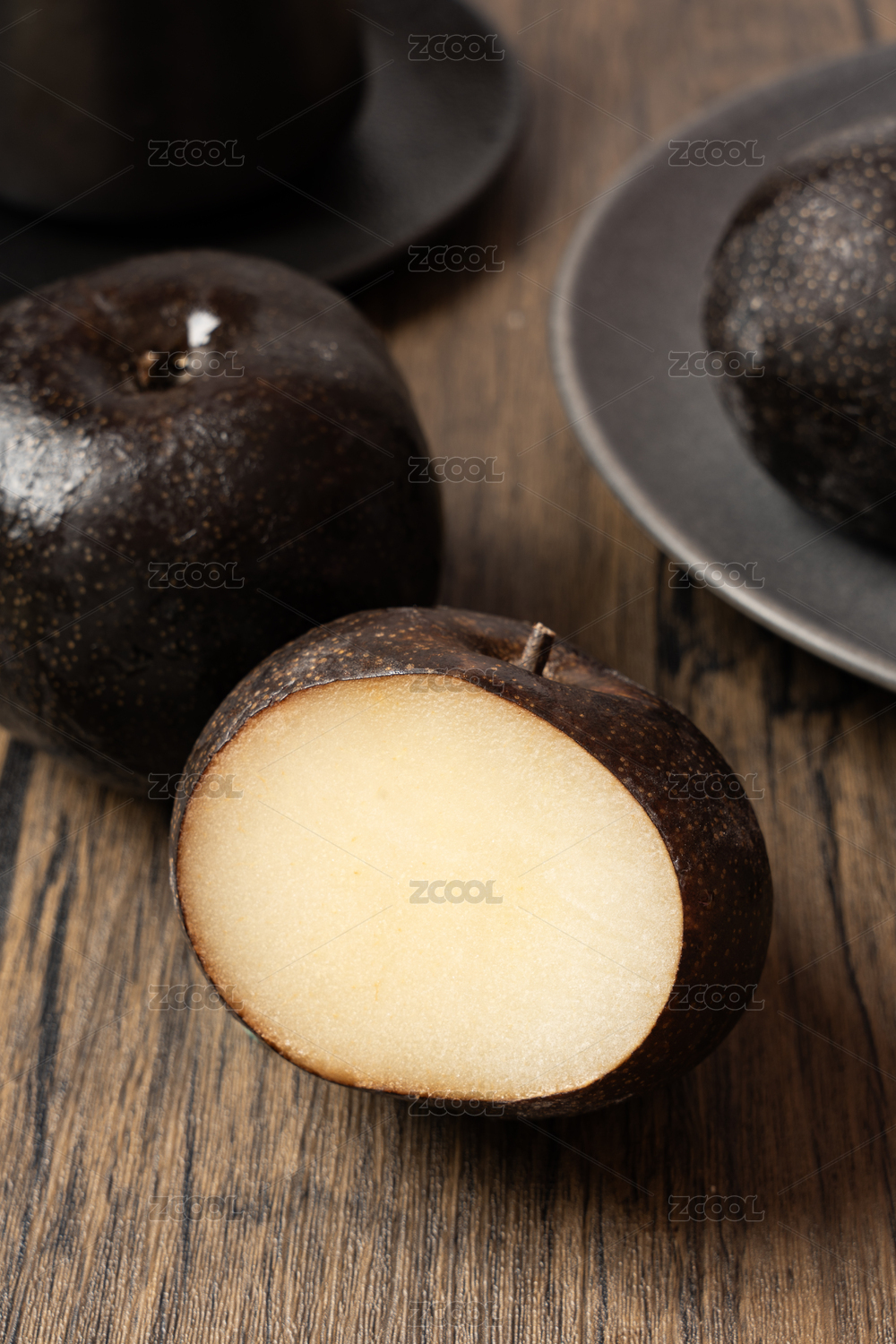 白石盤上放著一個(gè)完整的凍梨和切塊的凍梨