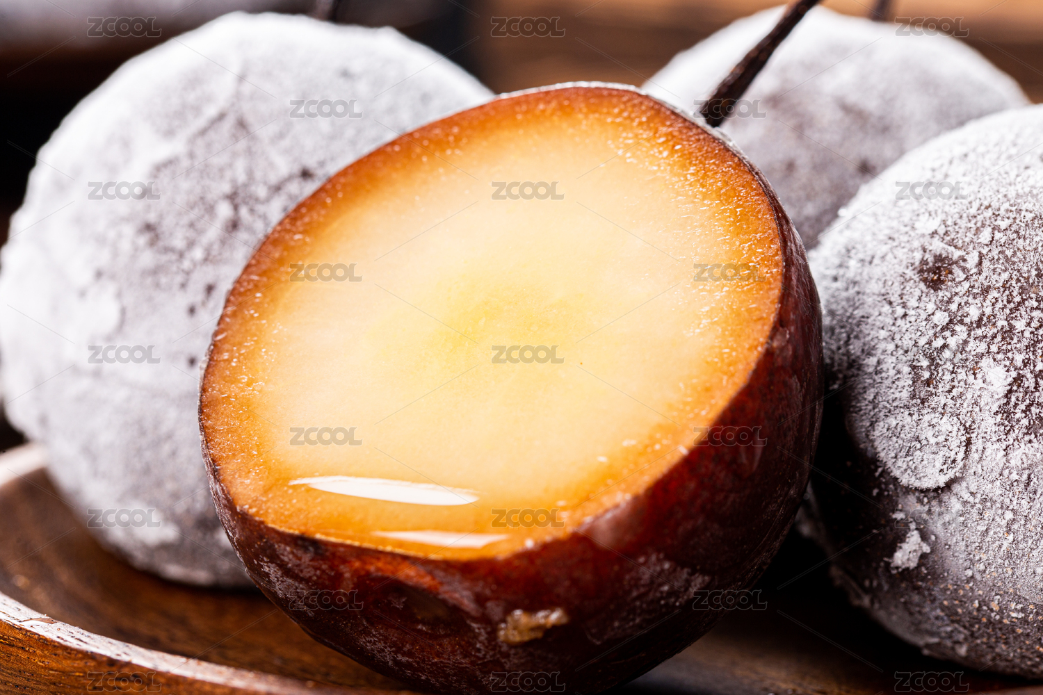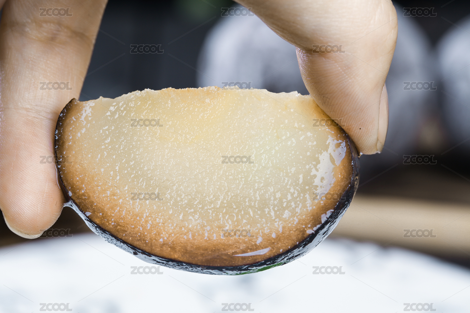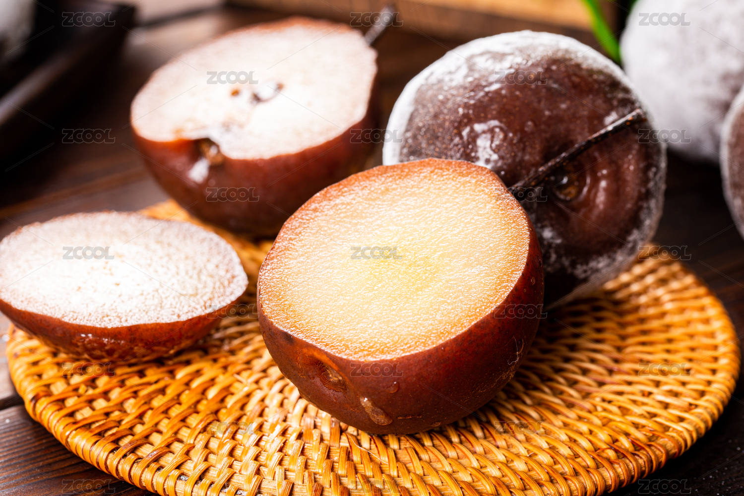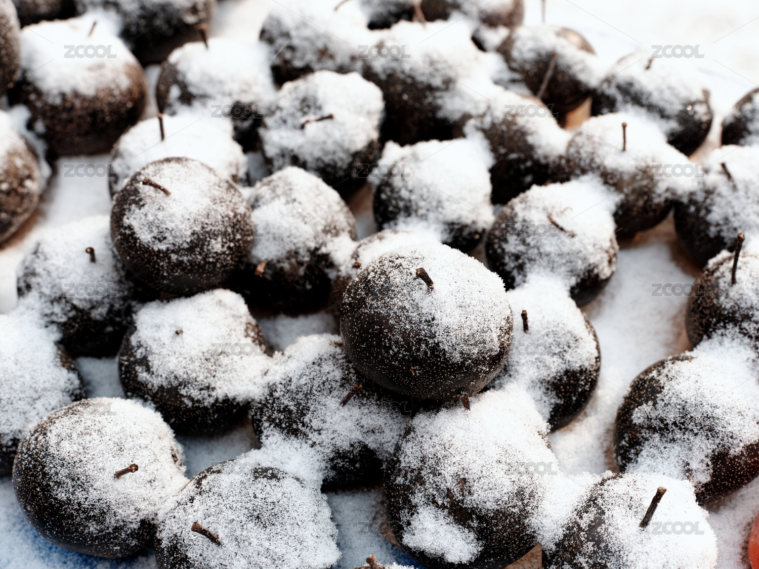 白石盤上放著一個(gè)完整的凍梨和切塊的凍梨