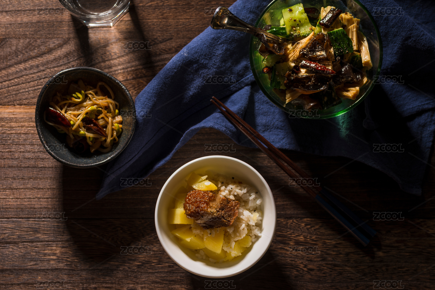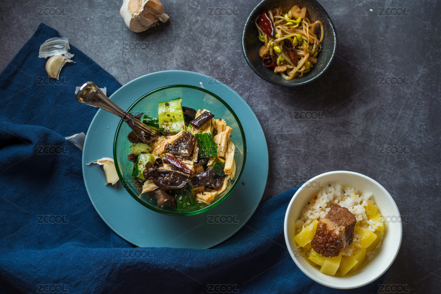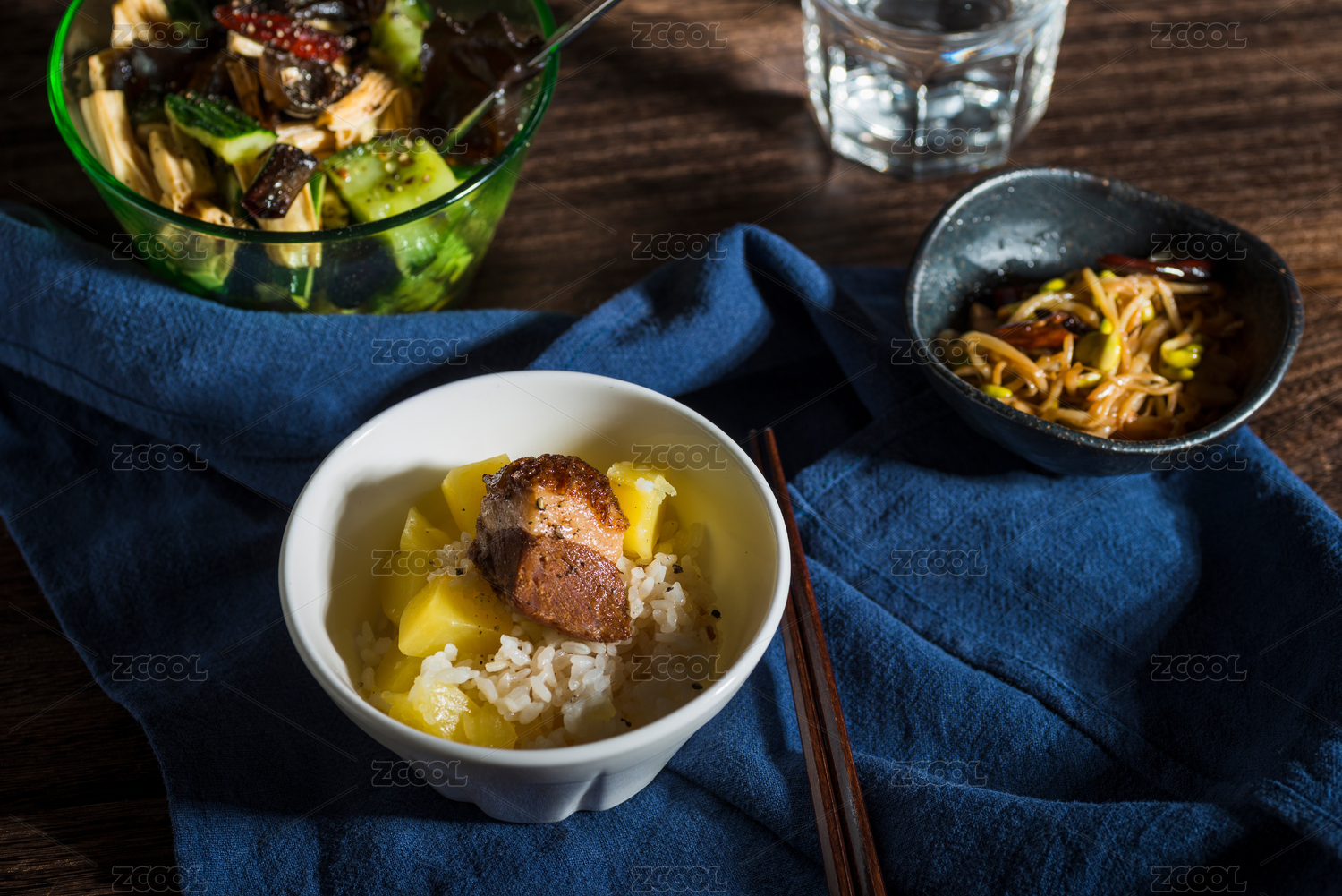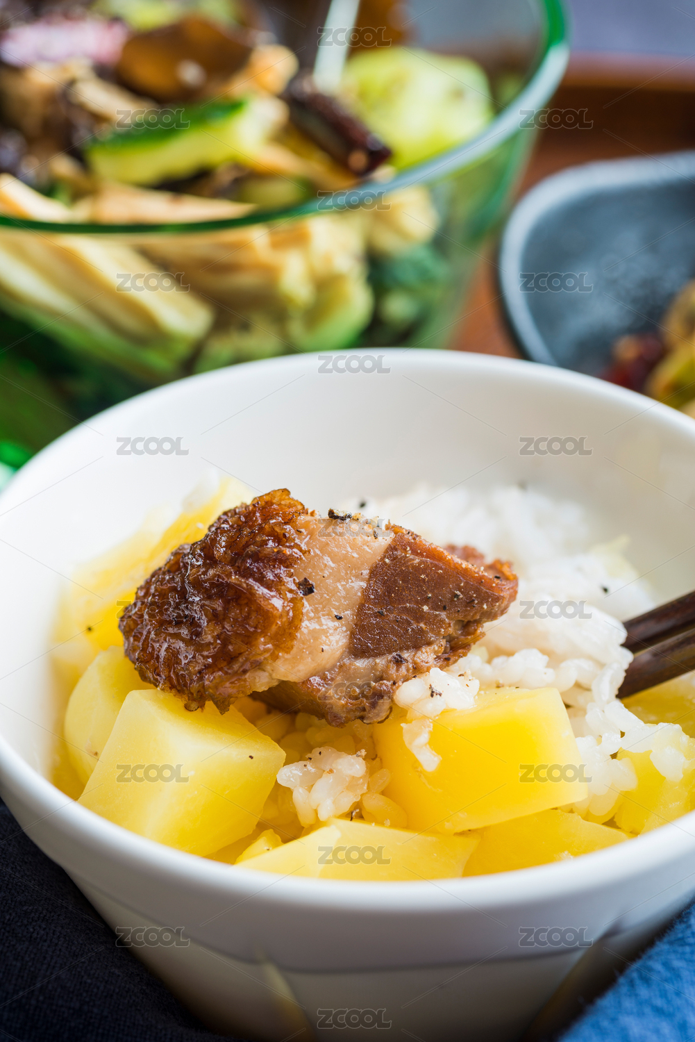 大塊紅燒豬肉配米飯和腐竹黃瓜拌黑木耳