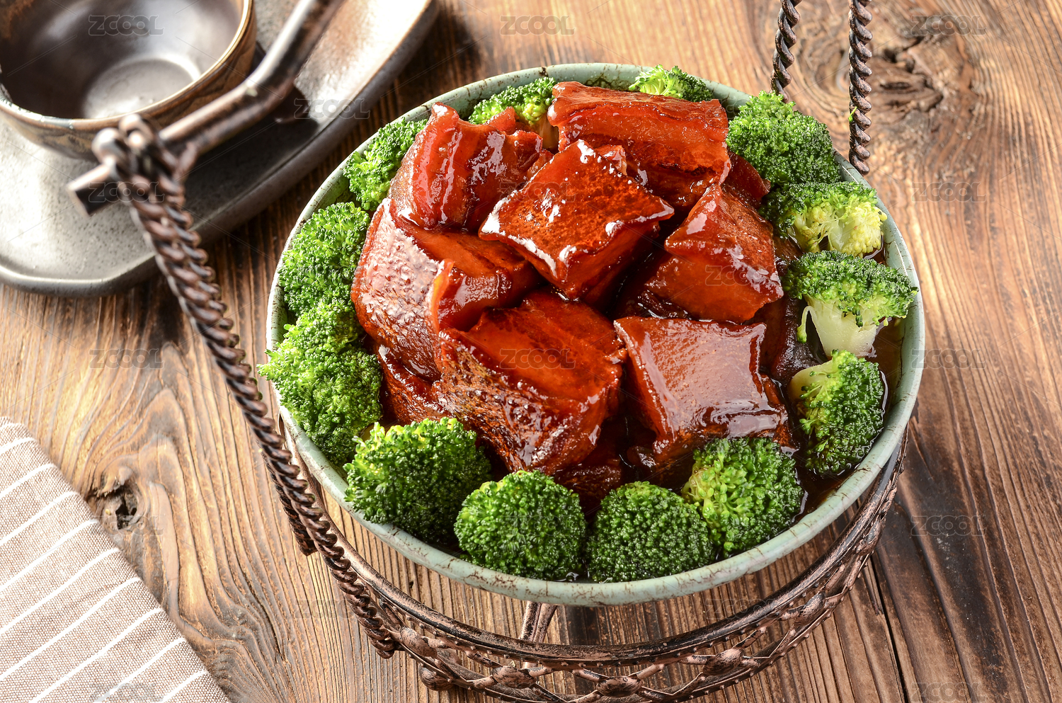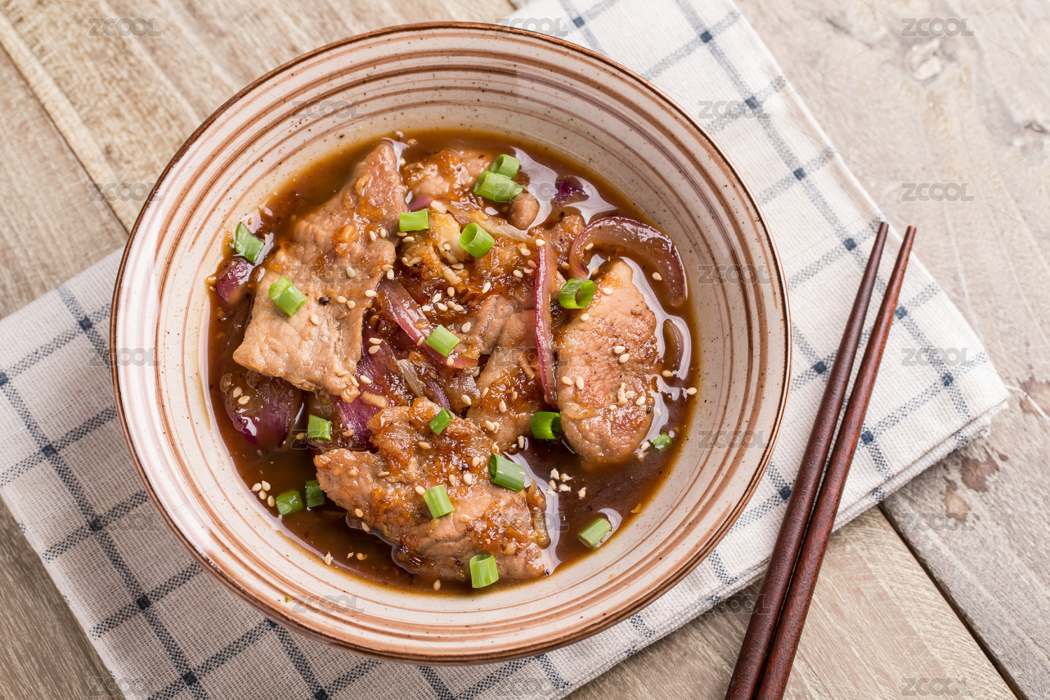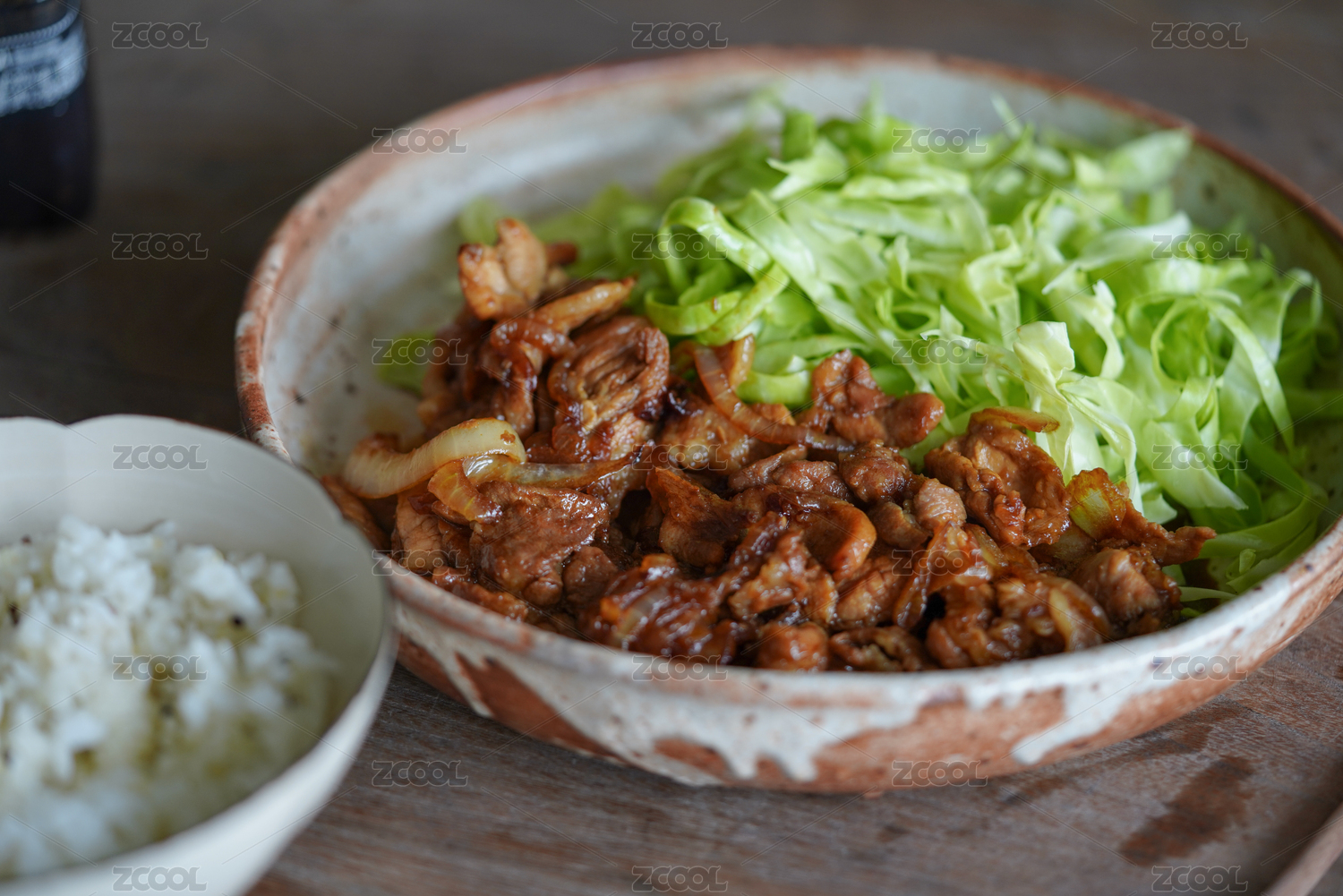 木桌子上的一碗姜汁燒豬肉。