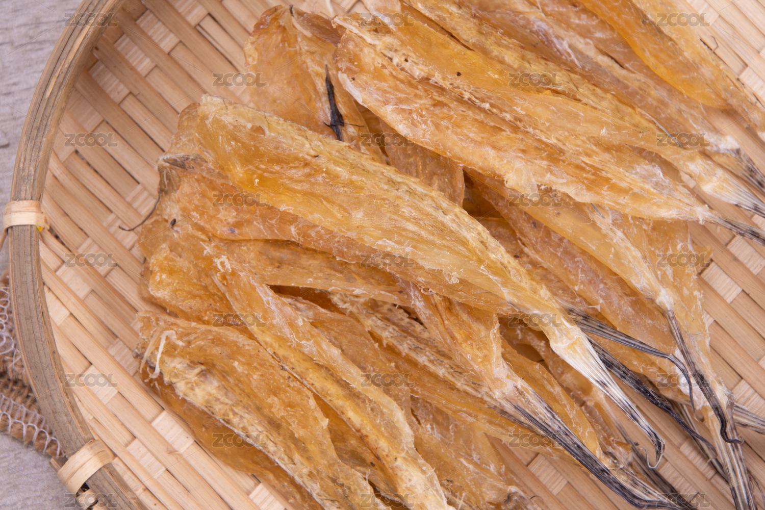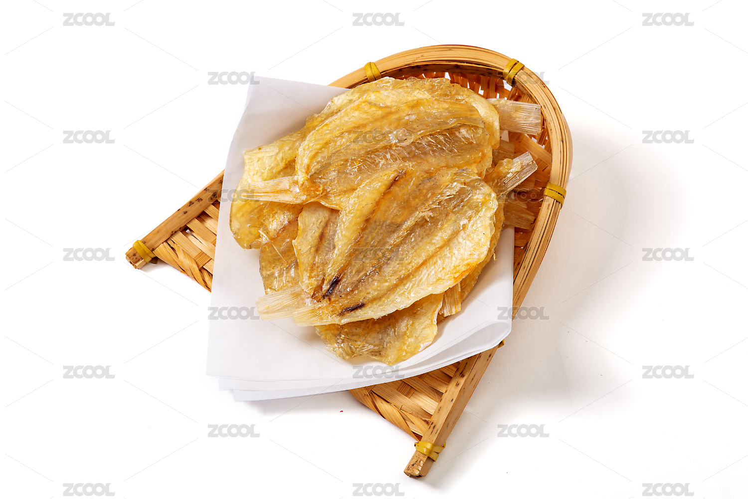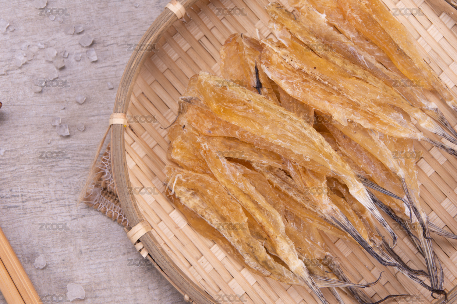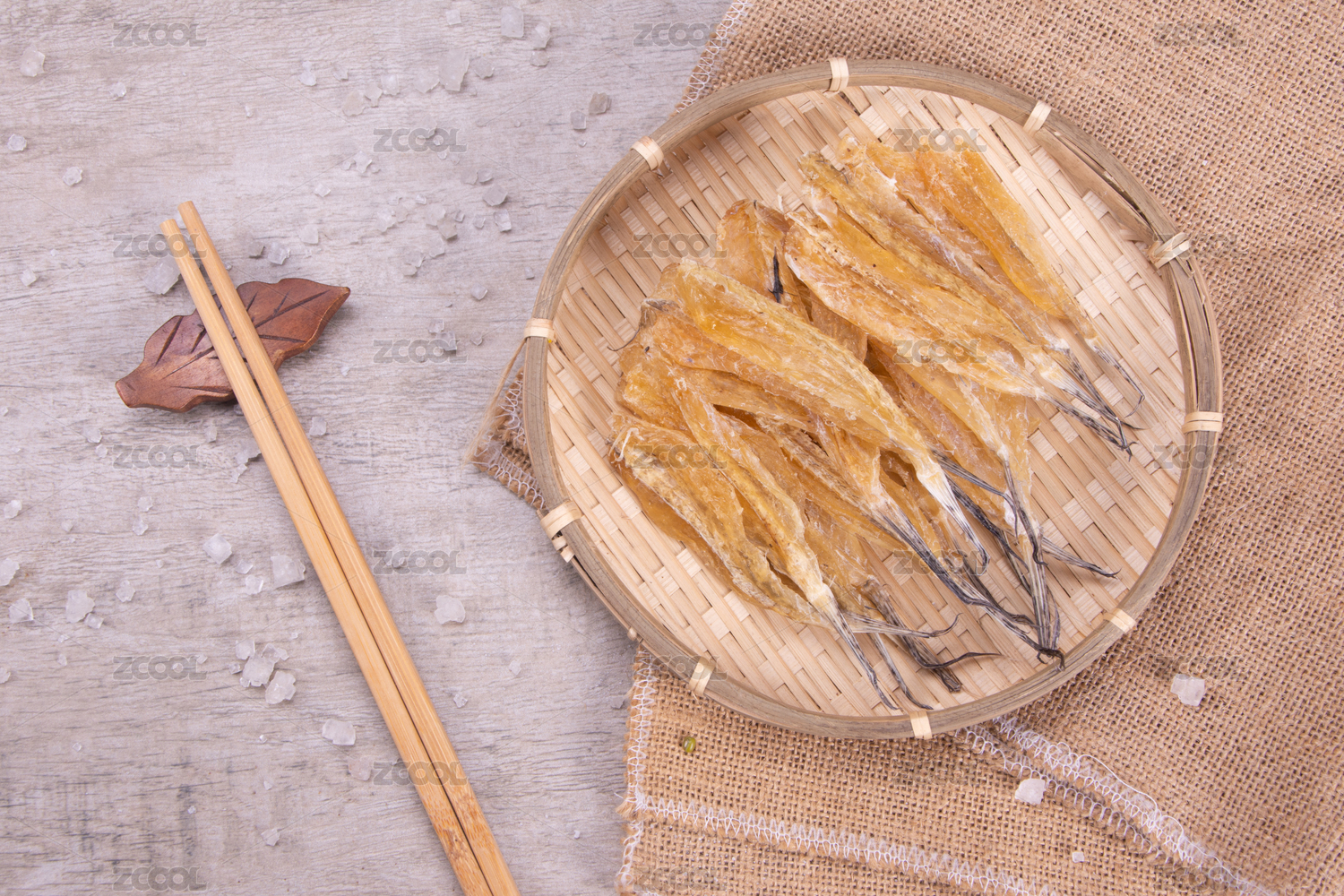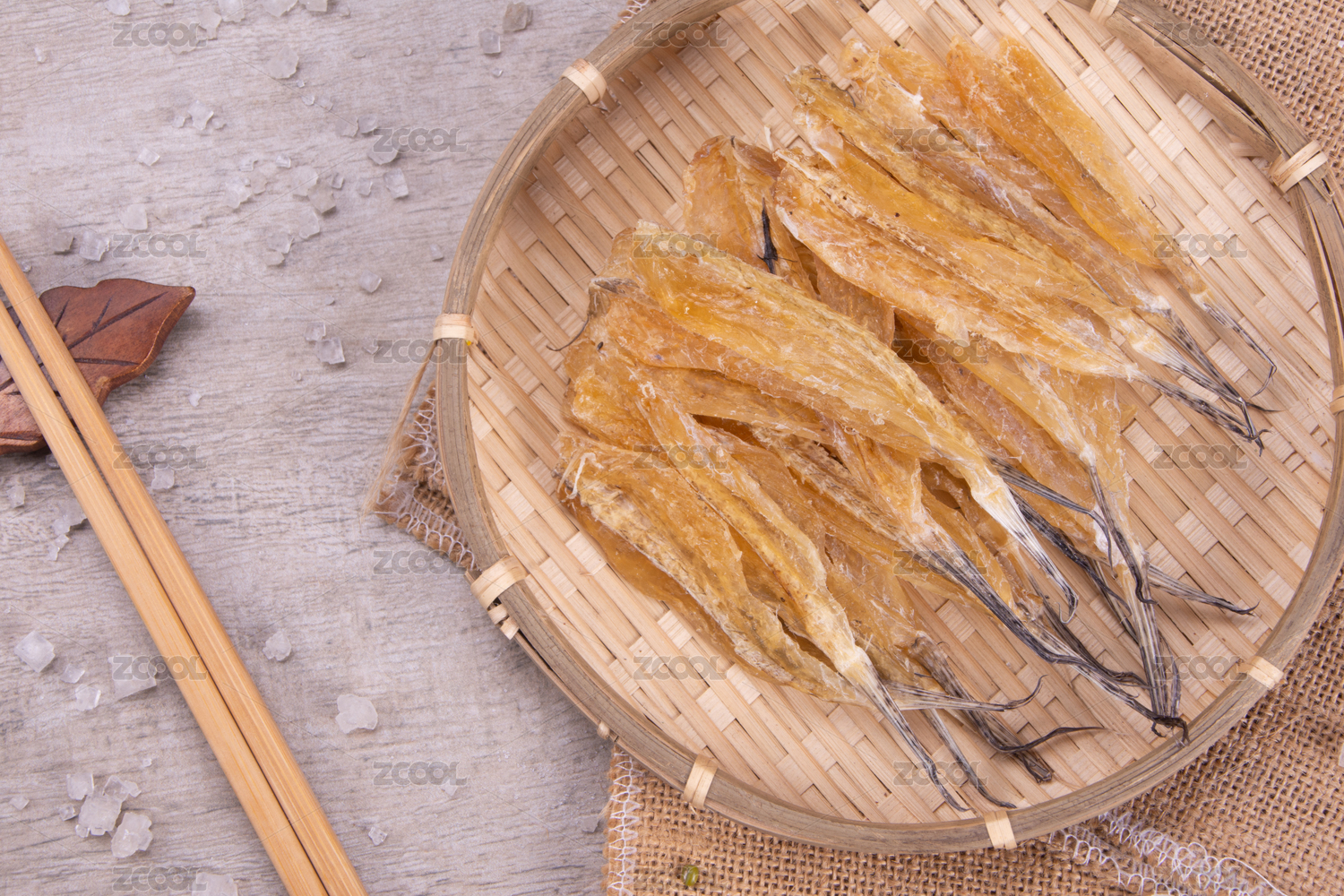 白底上簸箕上的多味魚干貨食材