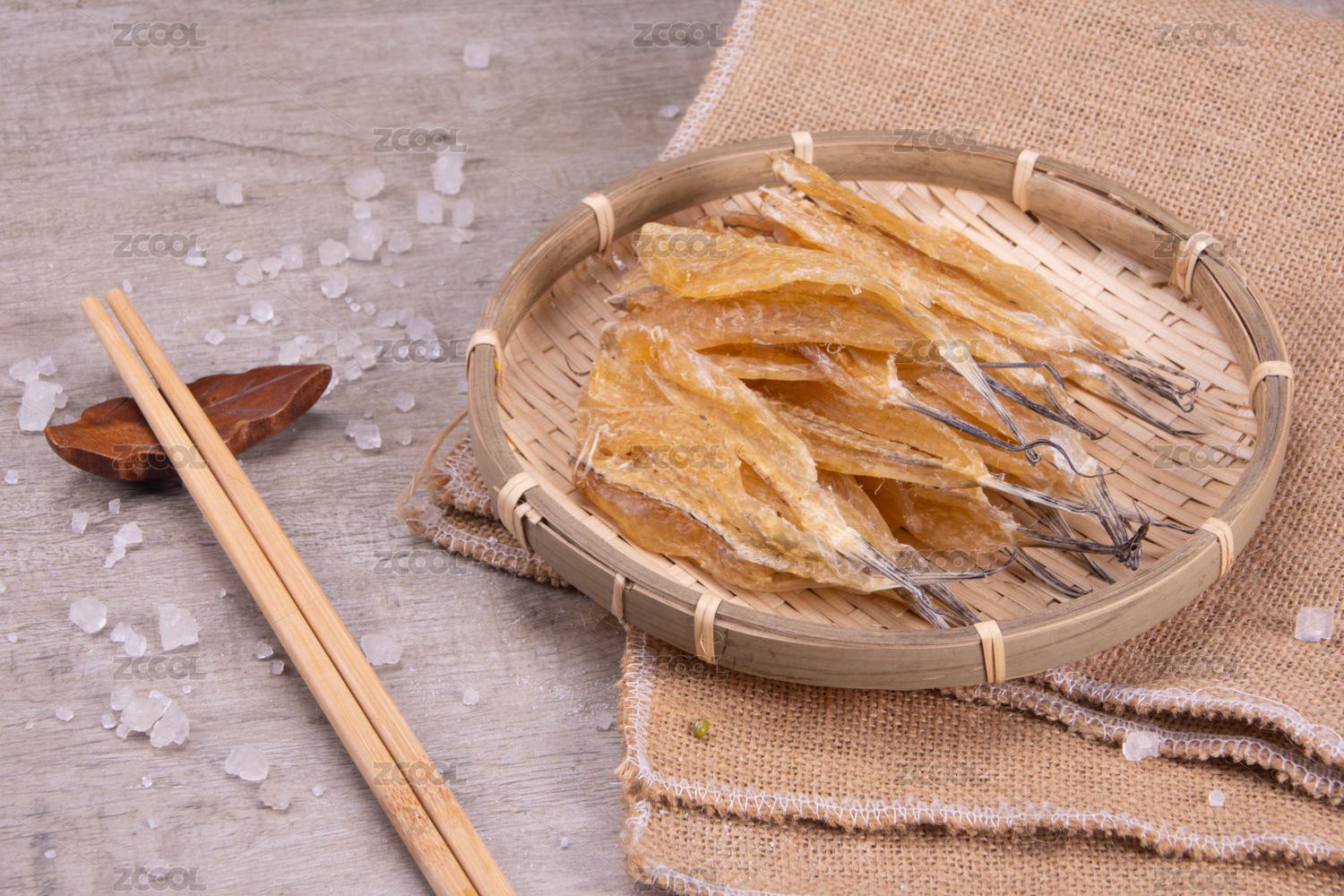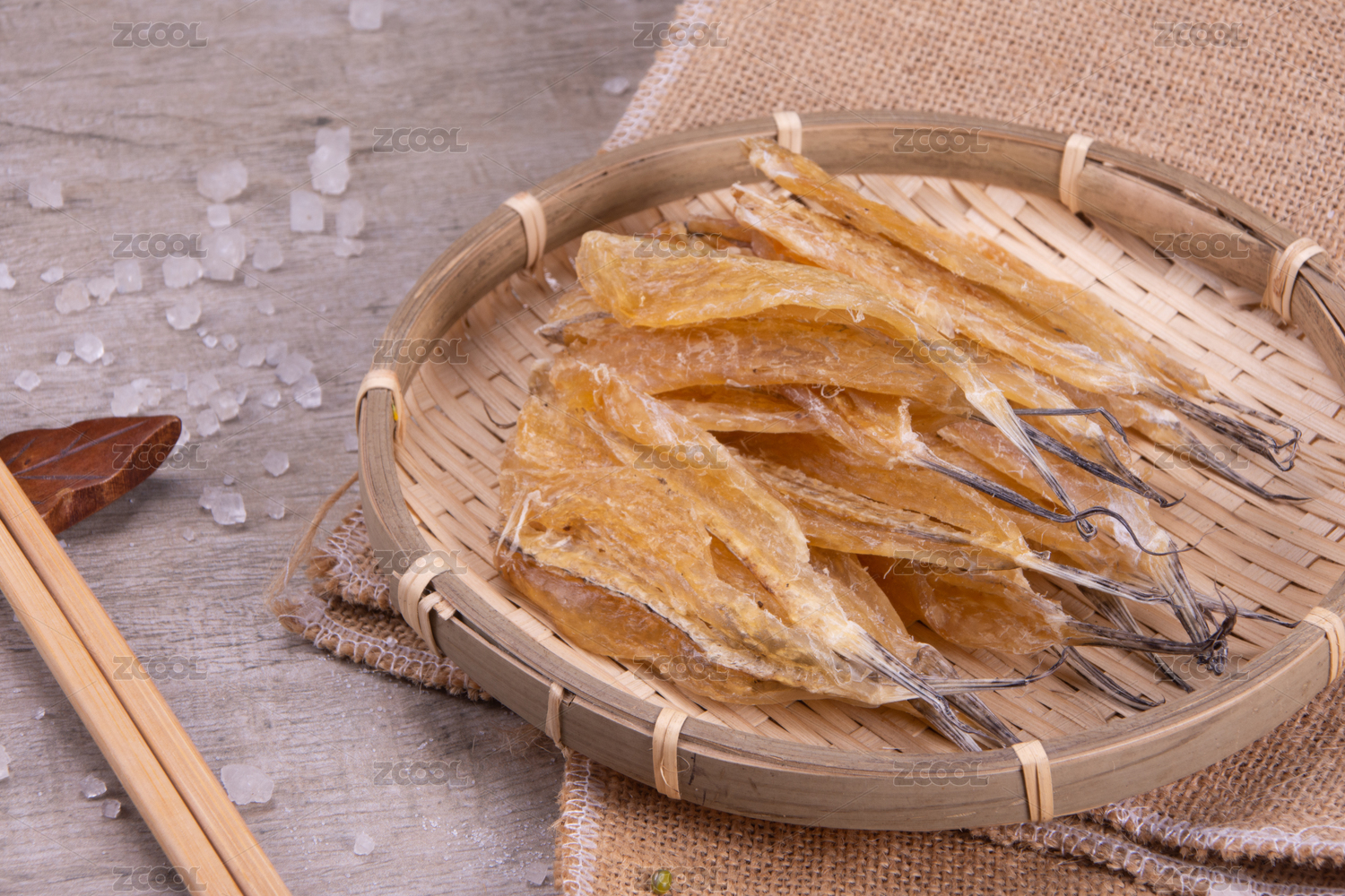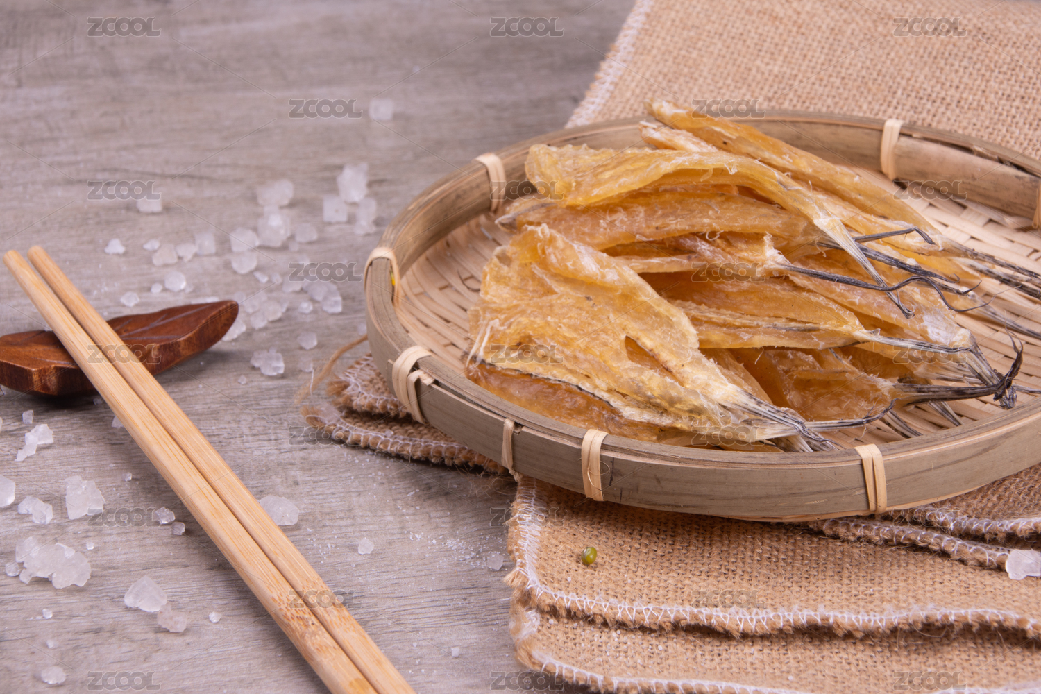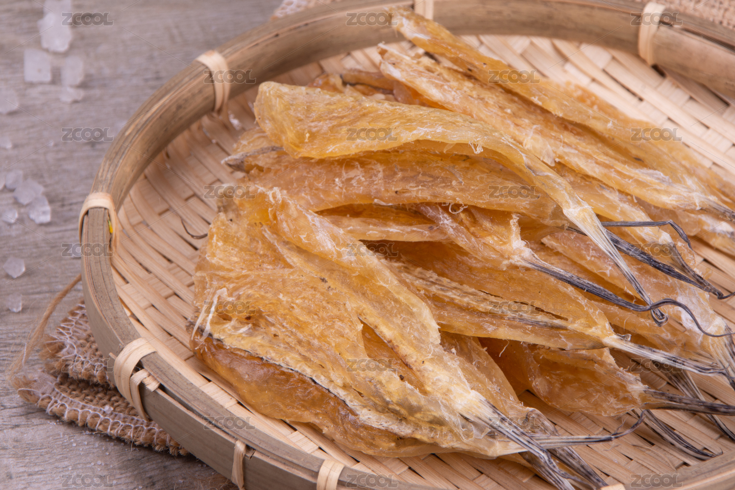 白底上簸箕上的多味魚干貨食材