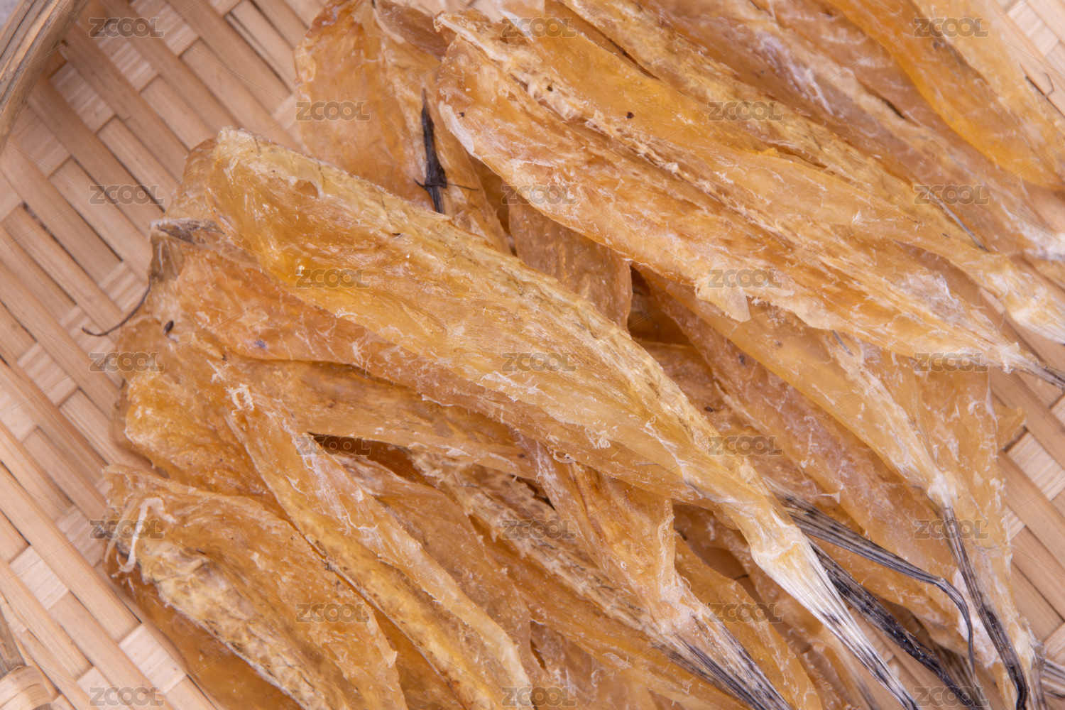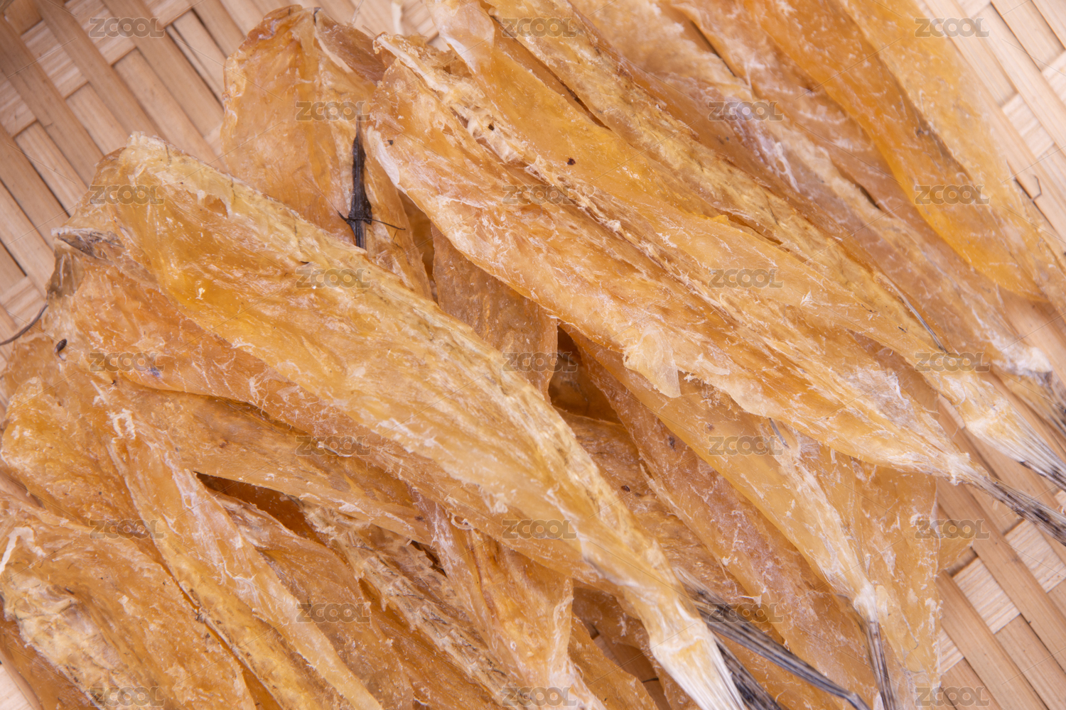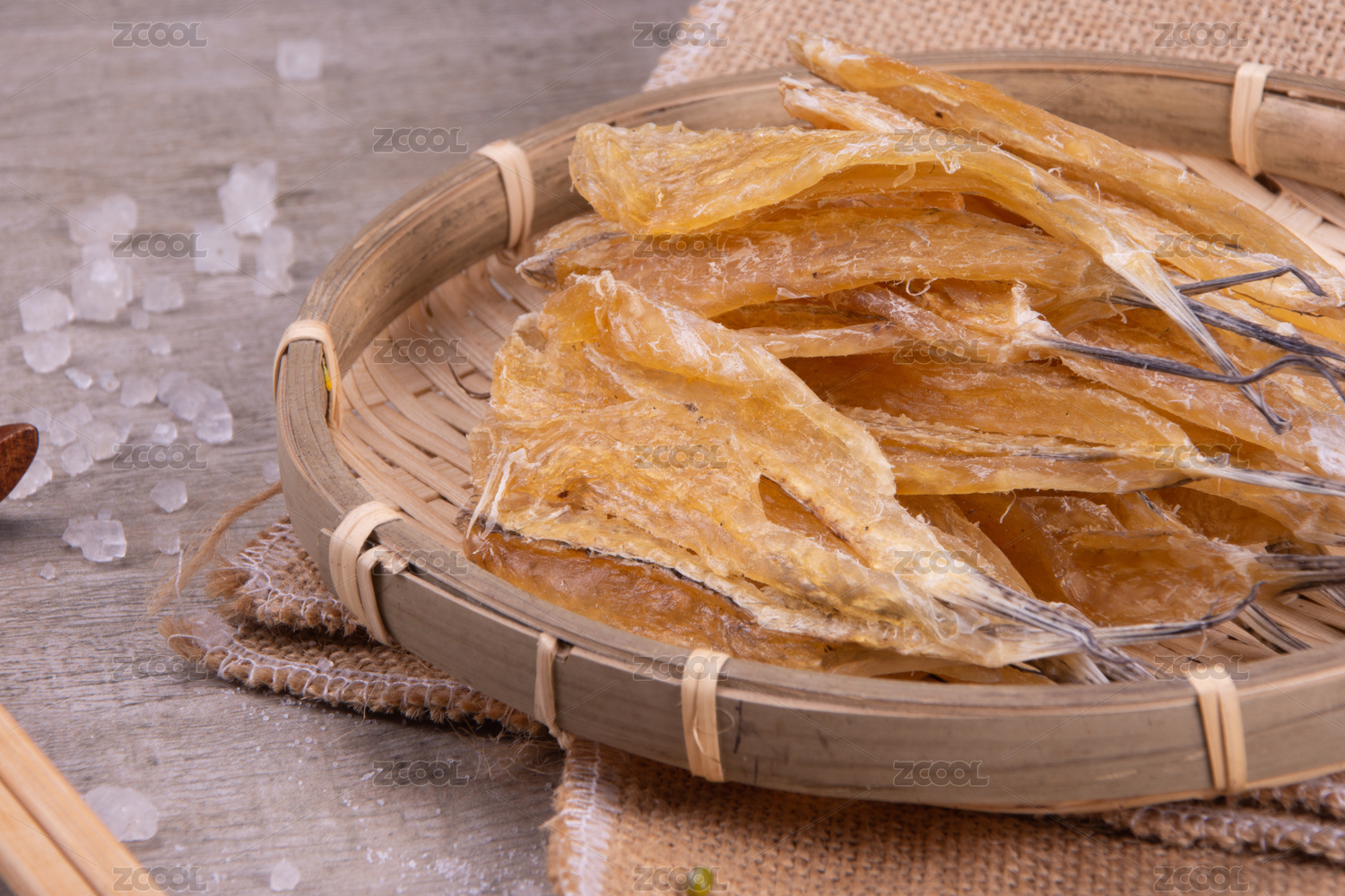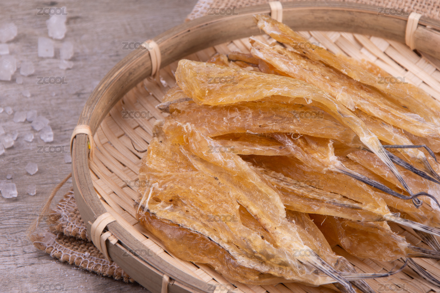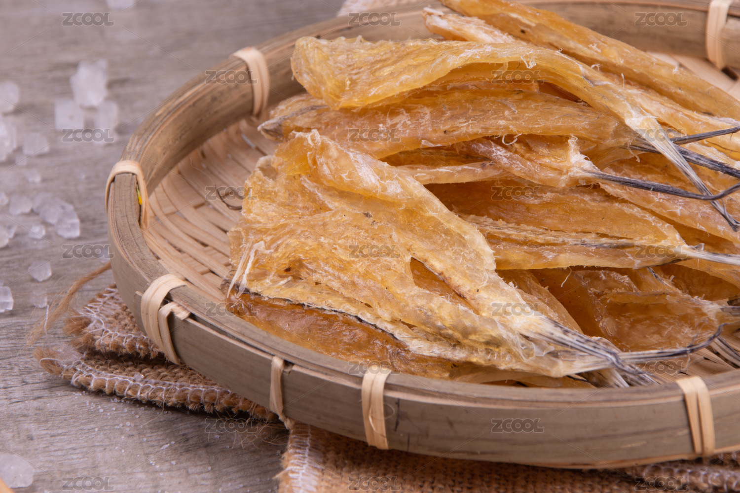 白底上簸箕上的多味魚干貨食材