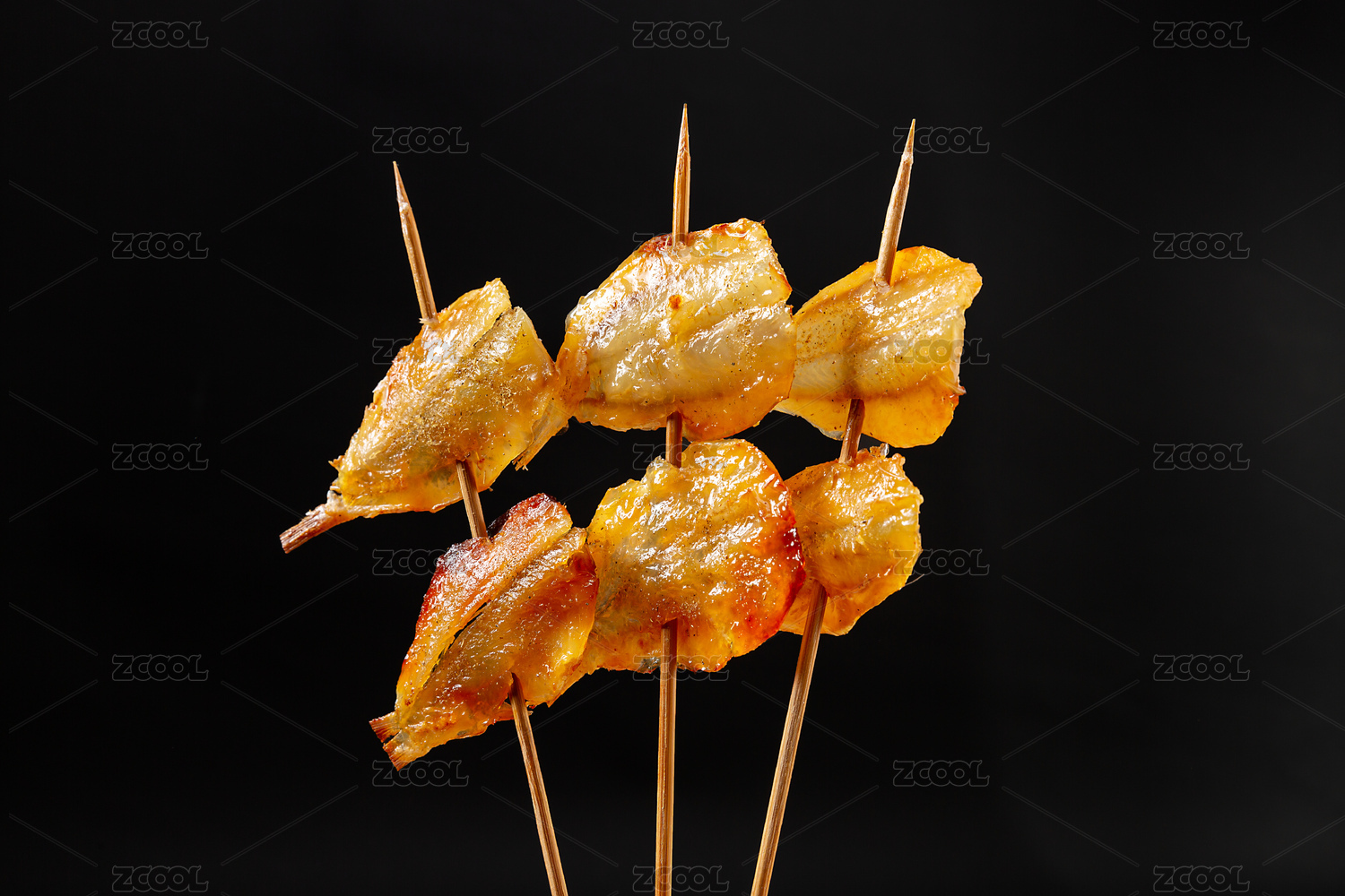 黑色背景前的多味魚烤串