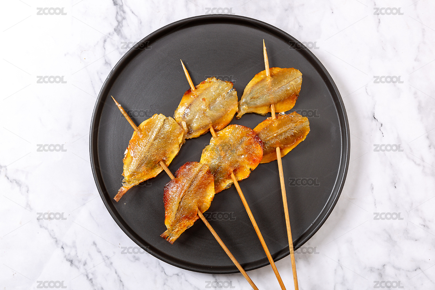 俯拍黑色盤子里的多味魚烤串