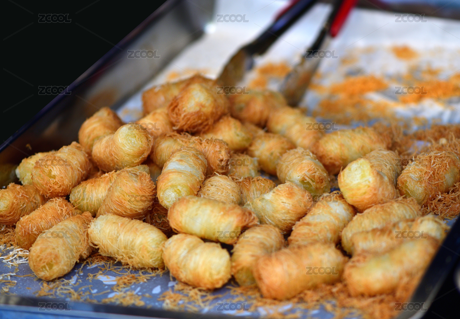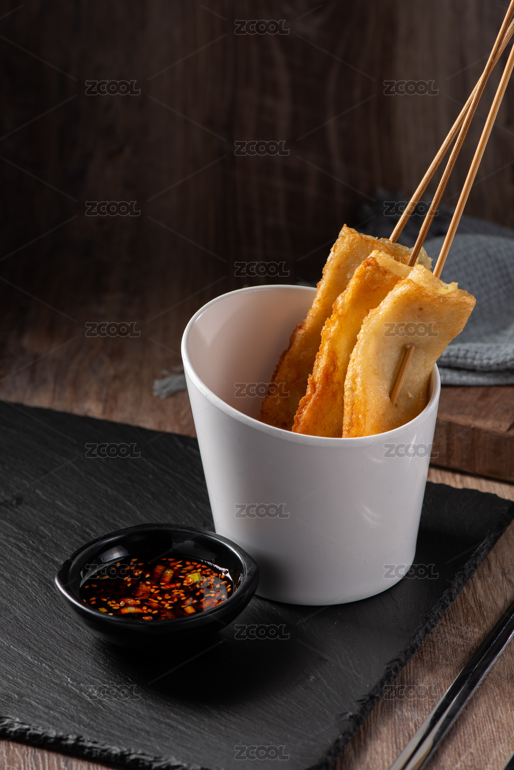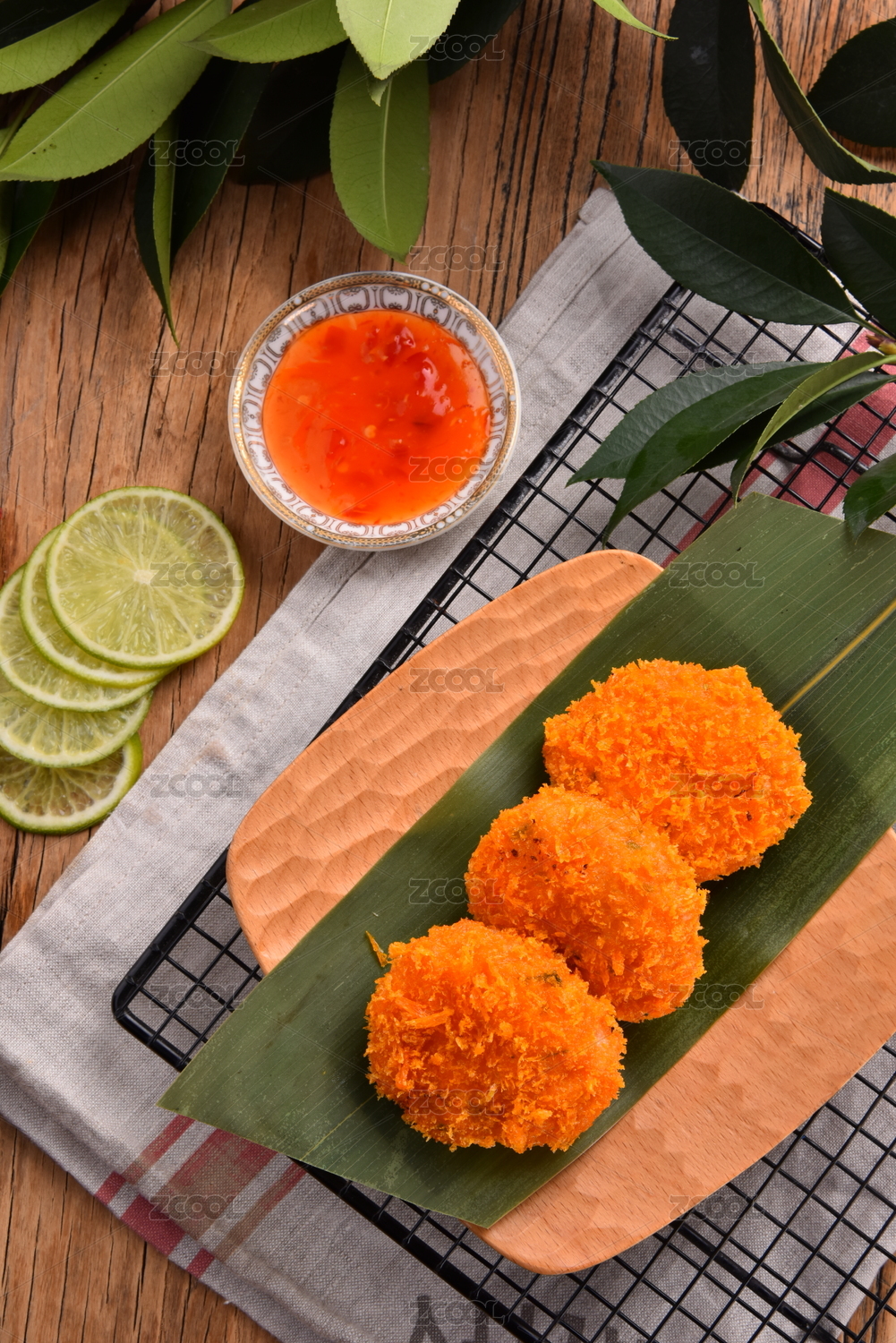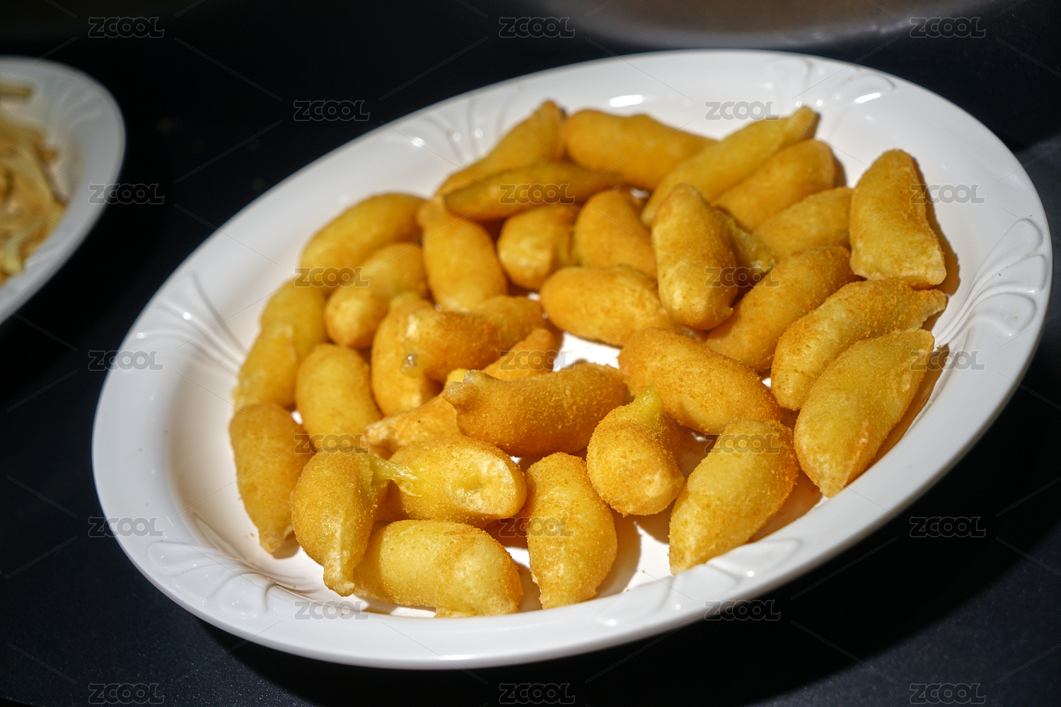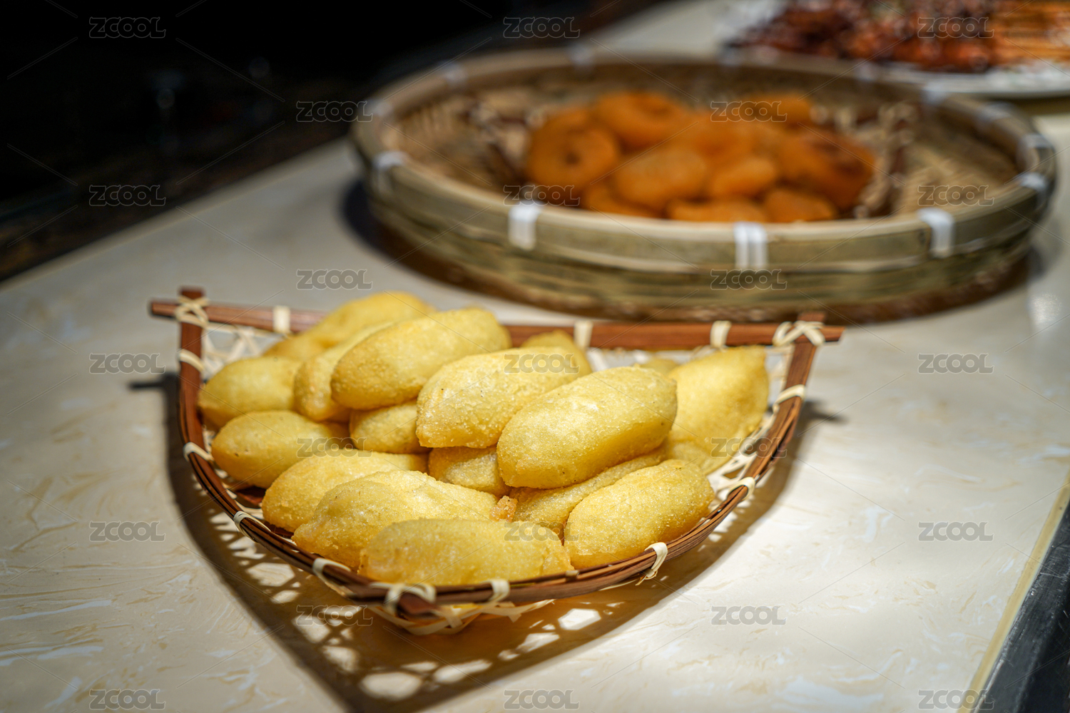 自助餐廳里美味的炸魚餅盛放在三角形竹簍內(nèi)