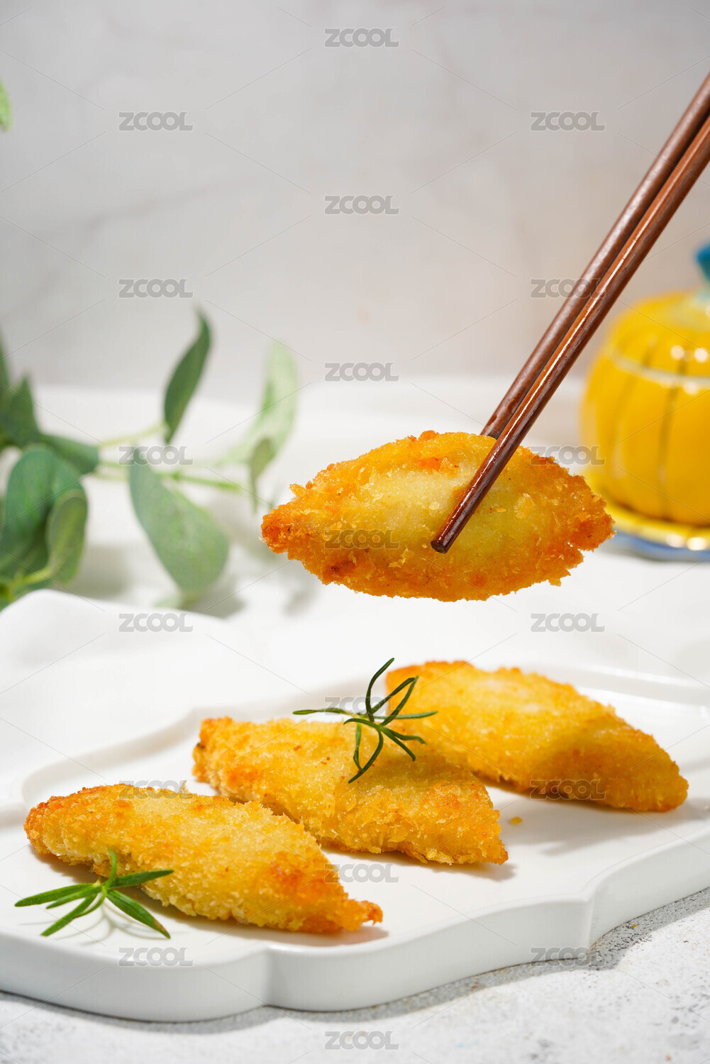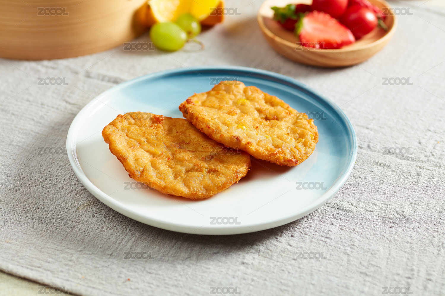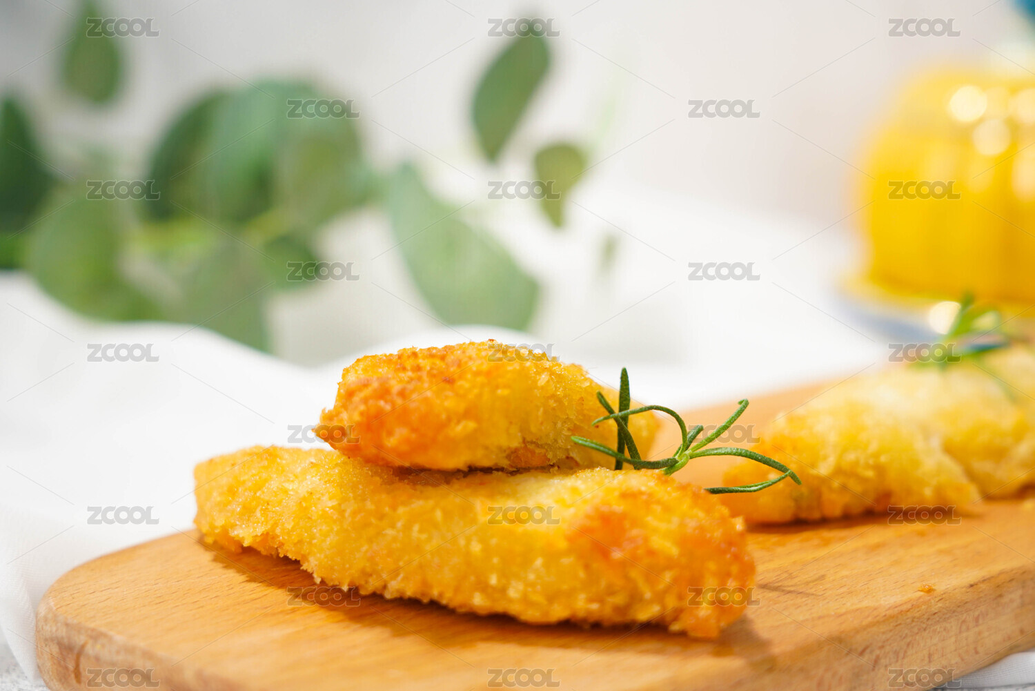 自助餐廳里美味的炸魚餅盛放在白色的瓷盤內(nèi)