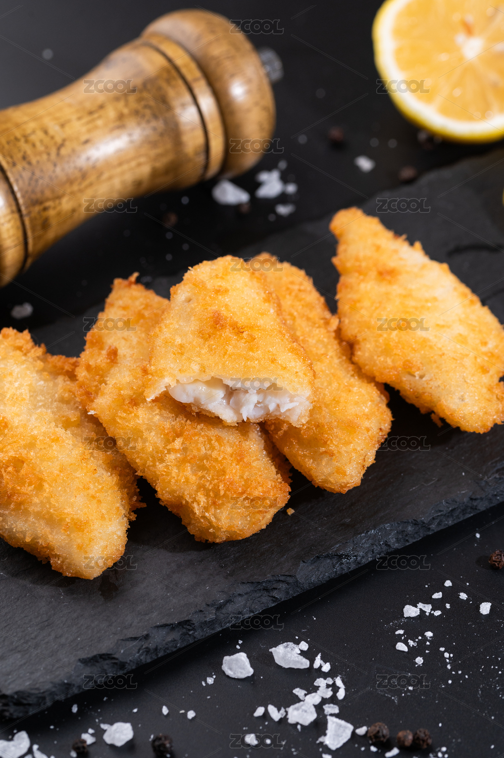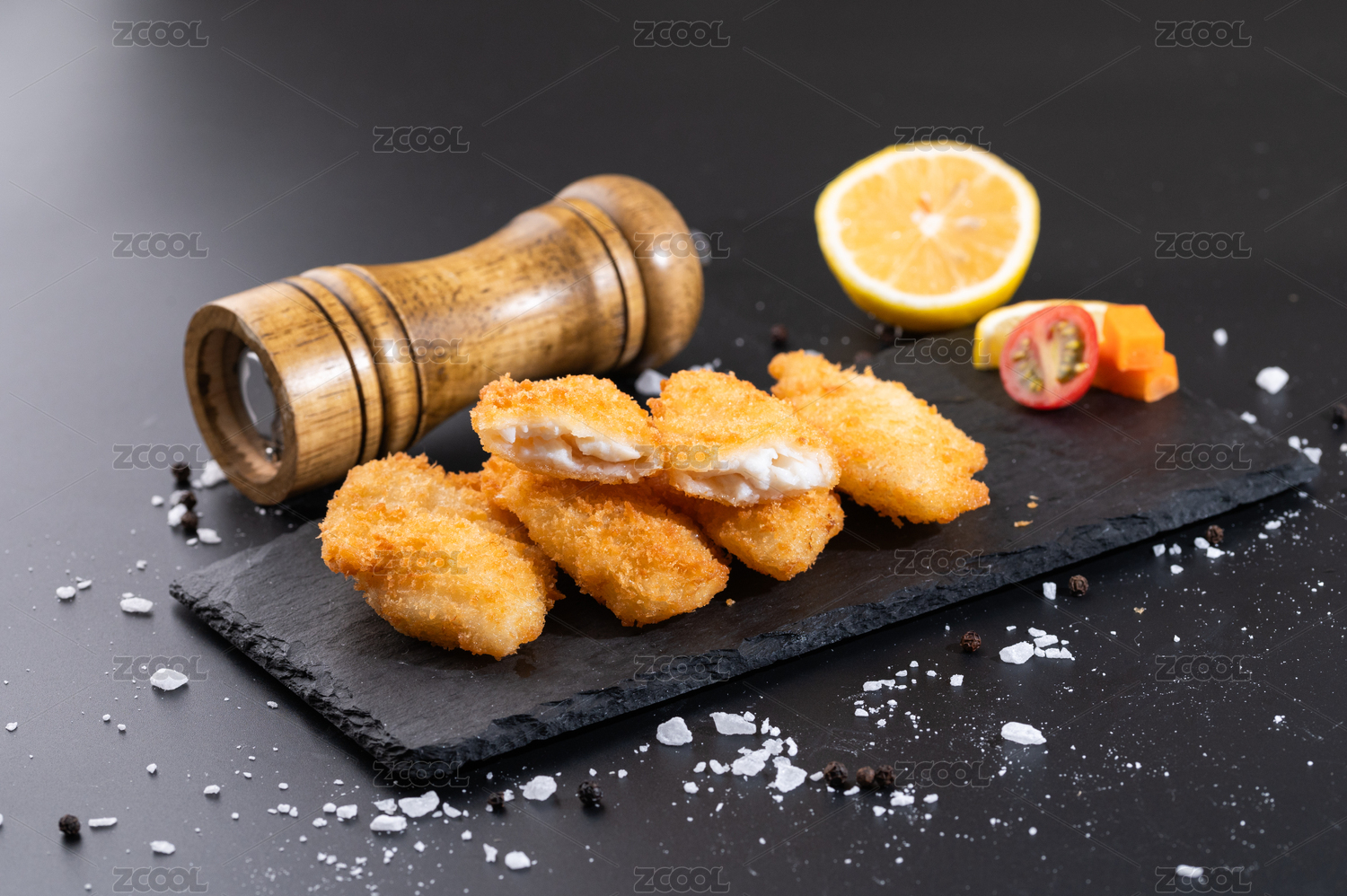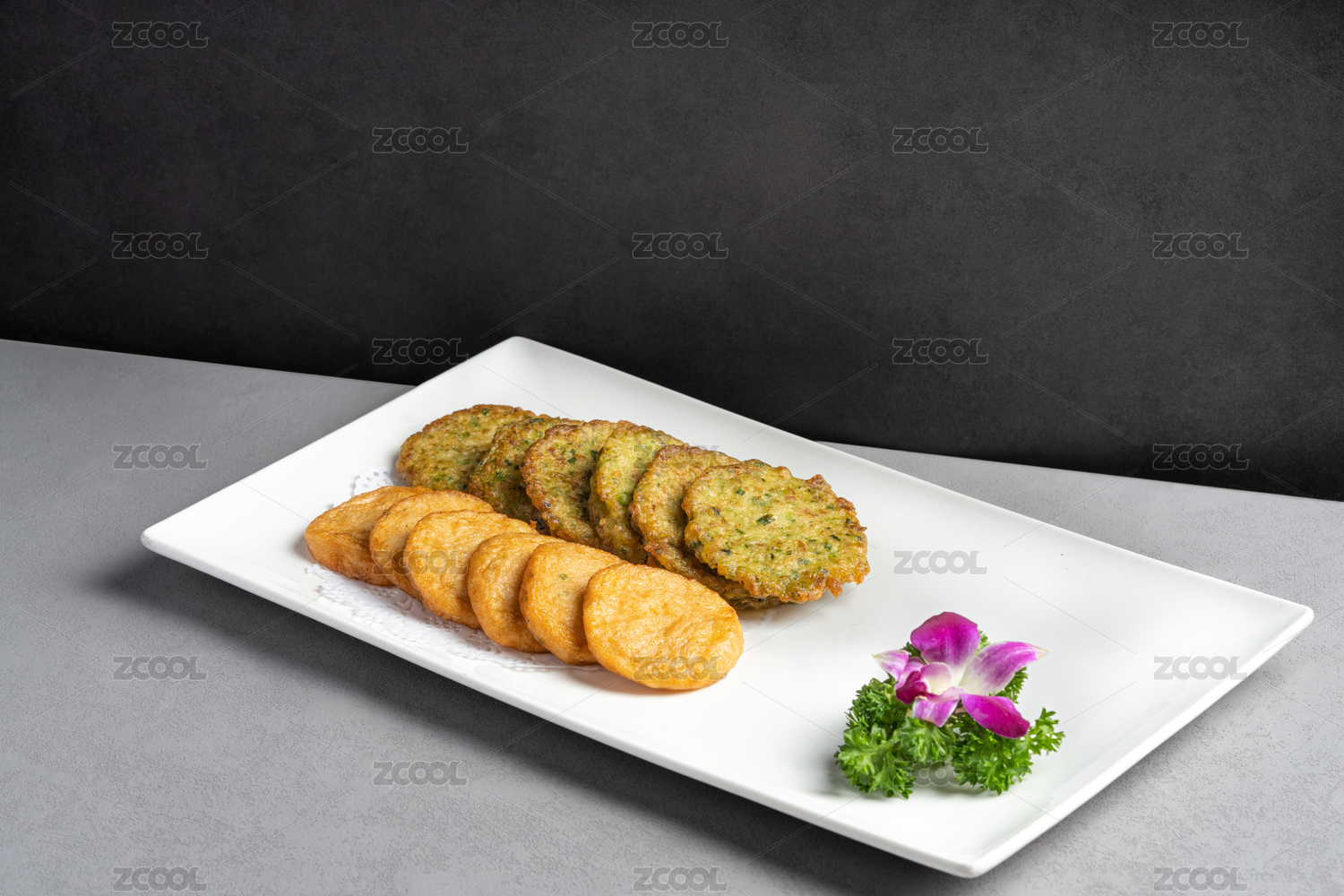 自助餐廳里美味的炸魚餅盛放在白色的瓷盤內(nèi)