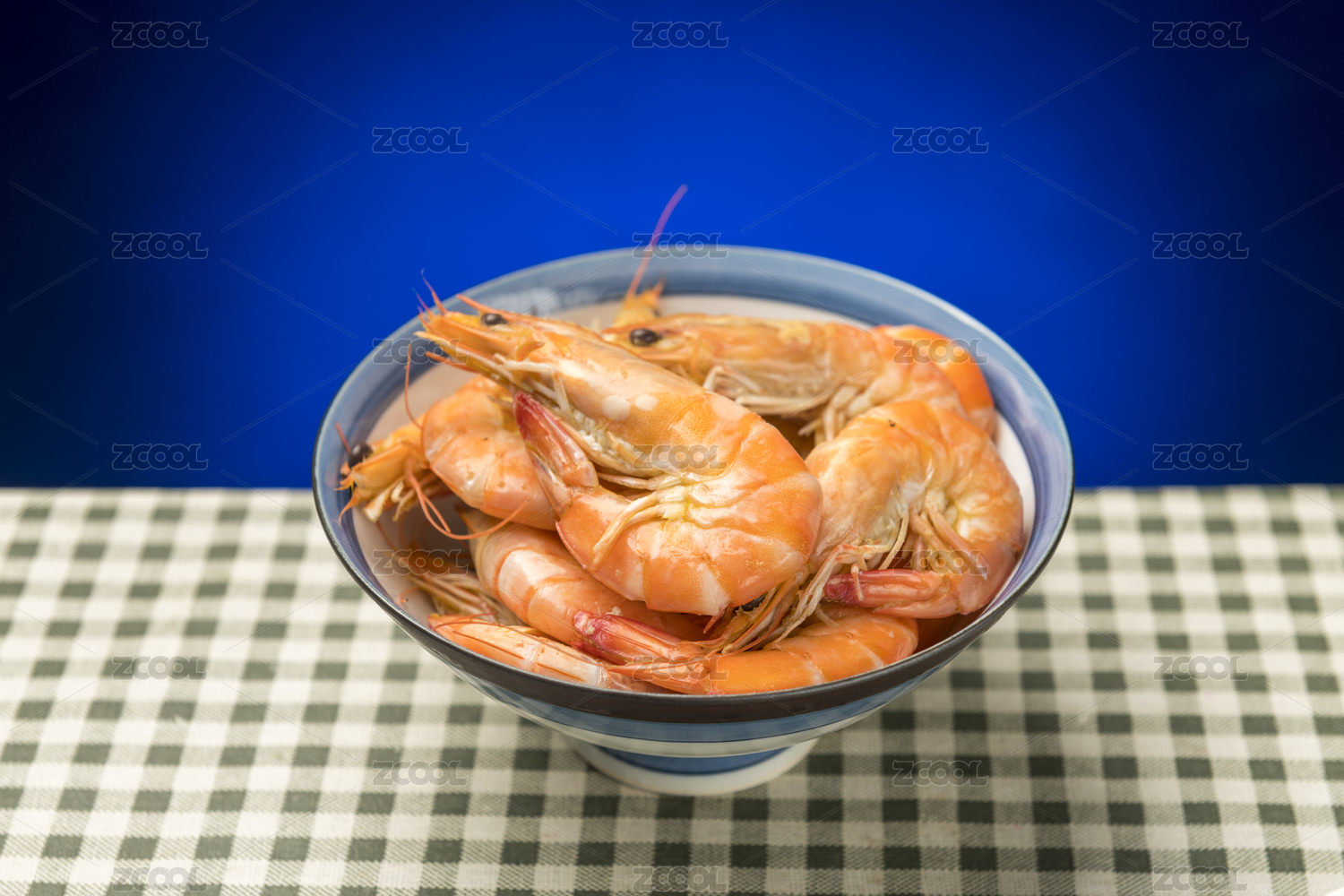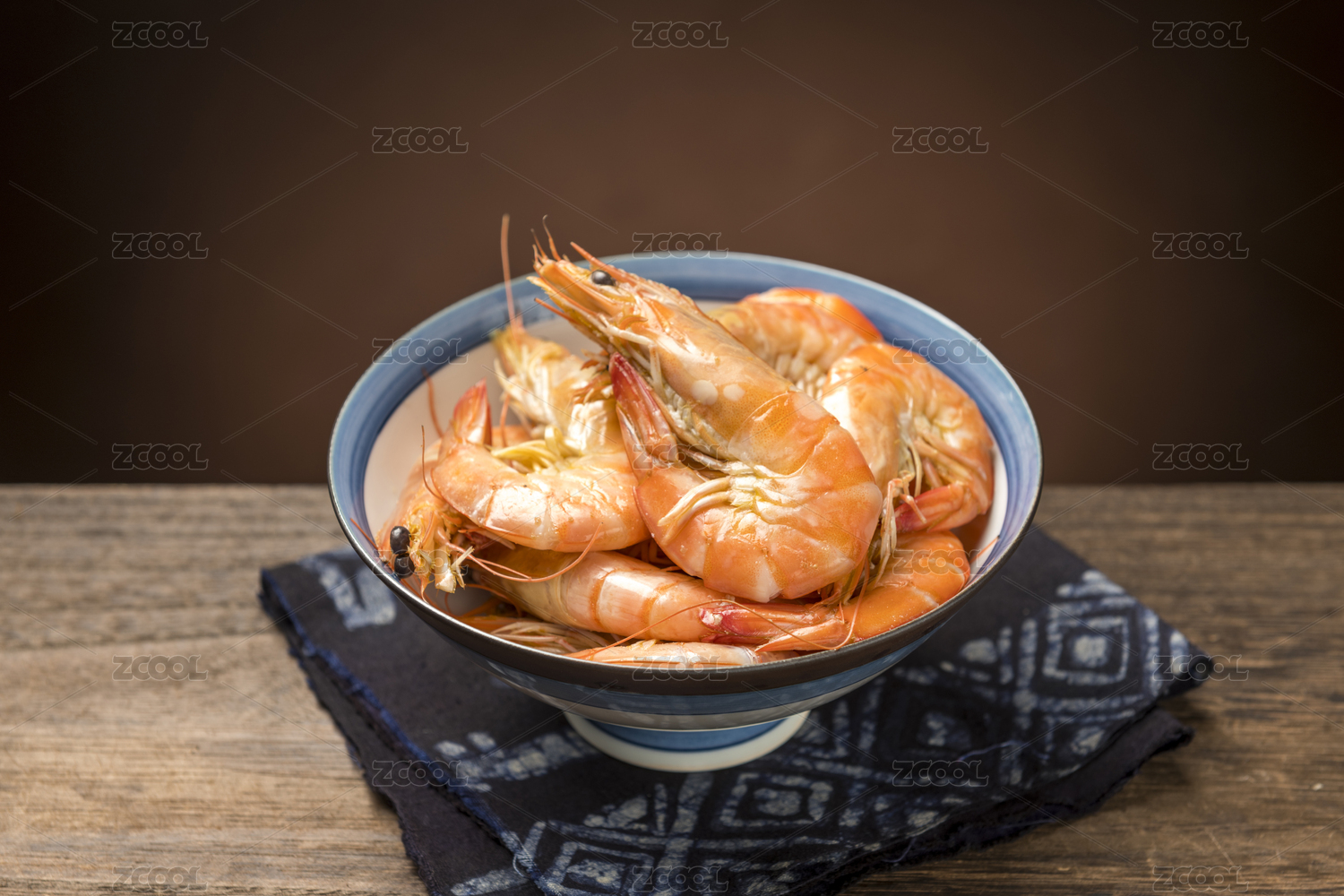 一碗煮蝦擺放在木桌面上特寫